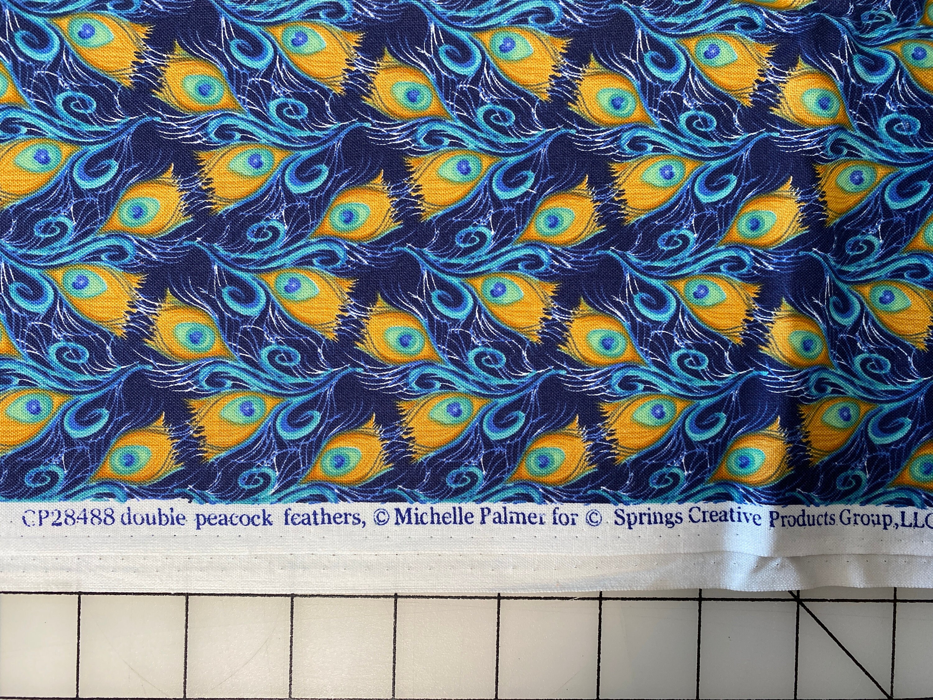 The selvedge is printed: Double Peacock Feathers ©Michelle Palmer for ©Springs Creative Products Group LLC.