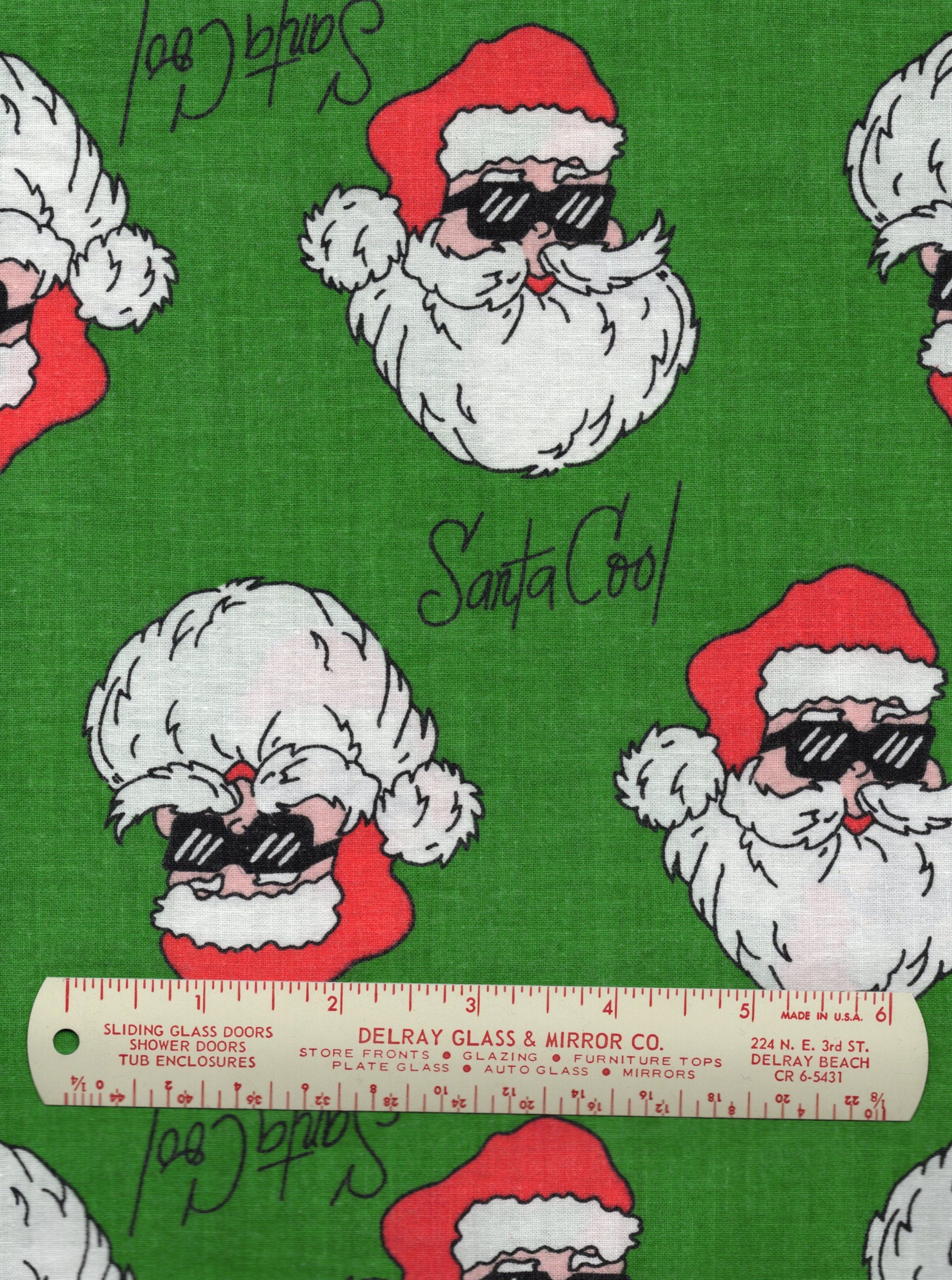 Santa Cool on Green by Calhoun Sportswear, it's the glasses that make him cool, don't you think? This is long out of print, possibly from 2016, it has been washed so no running of color & no further shrinking. The shrink in the wash accounts for this being 17.5" long & 43" wide. A gentle reminder to always wash your fabric before cutting & sewing. The Santas are 3" by 3.25" & cute as can be.