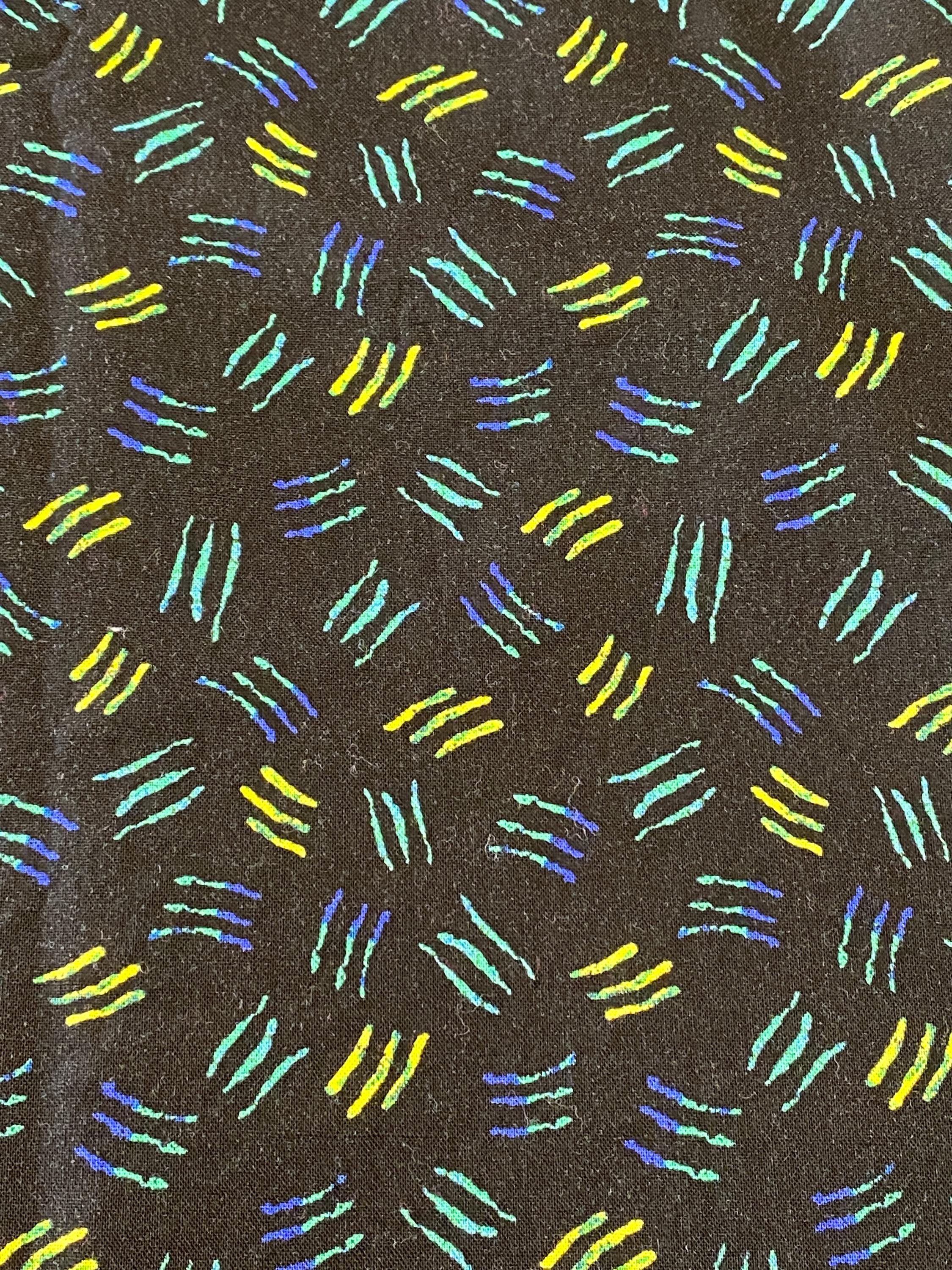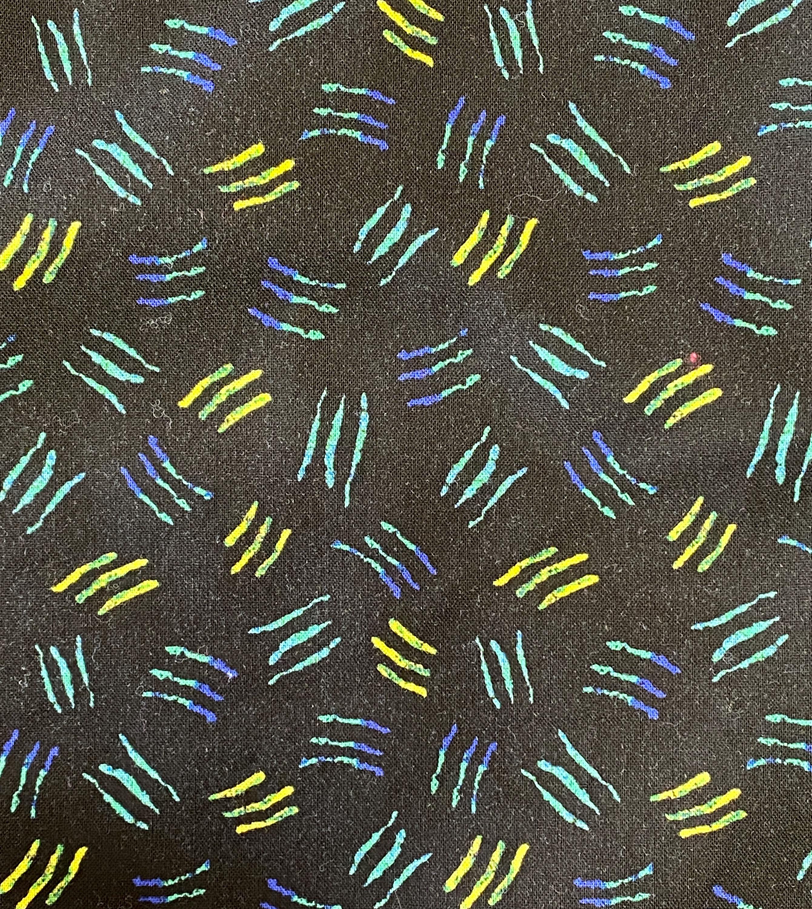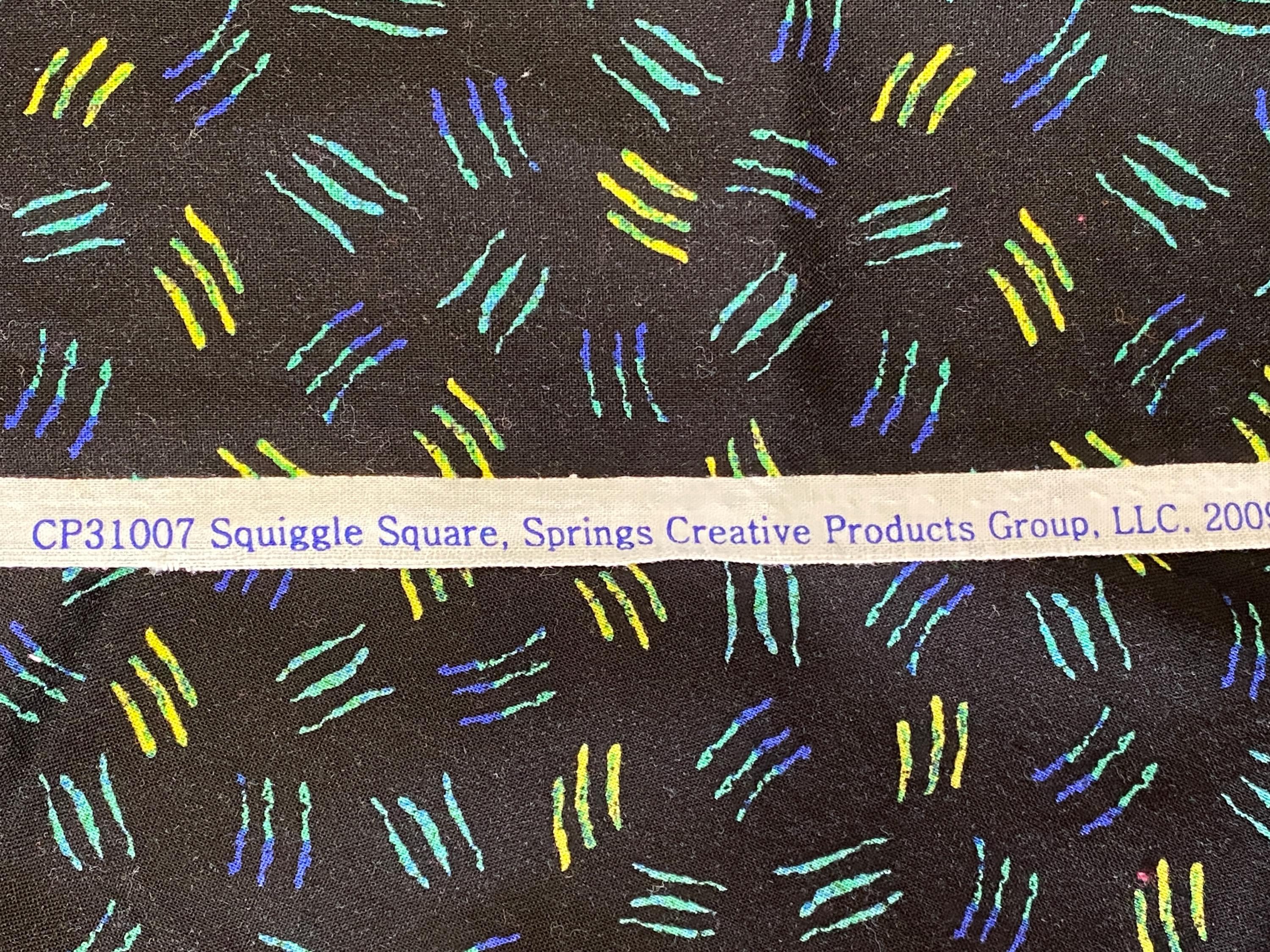 The background is black and the squiggles morph from blue to turquoise to green to yellow. Each square of sqiggles is approximately 1/2" on all sides. Fabric is 41 inches wide.