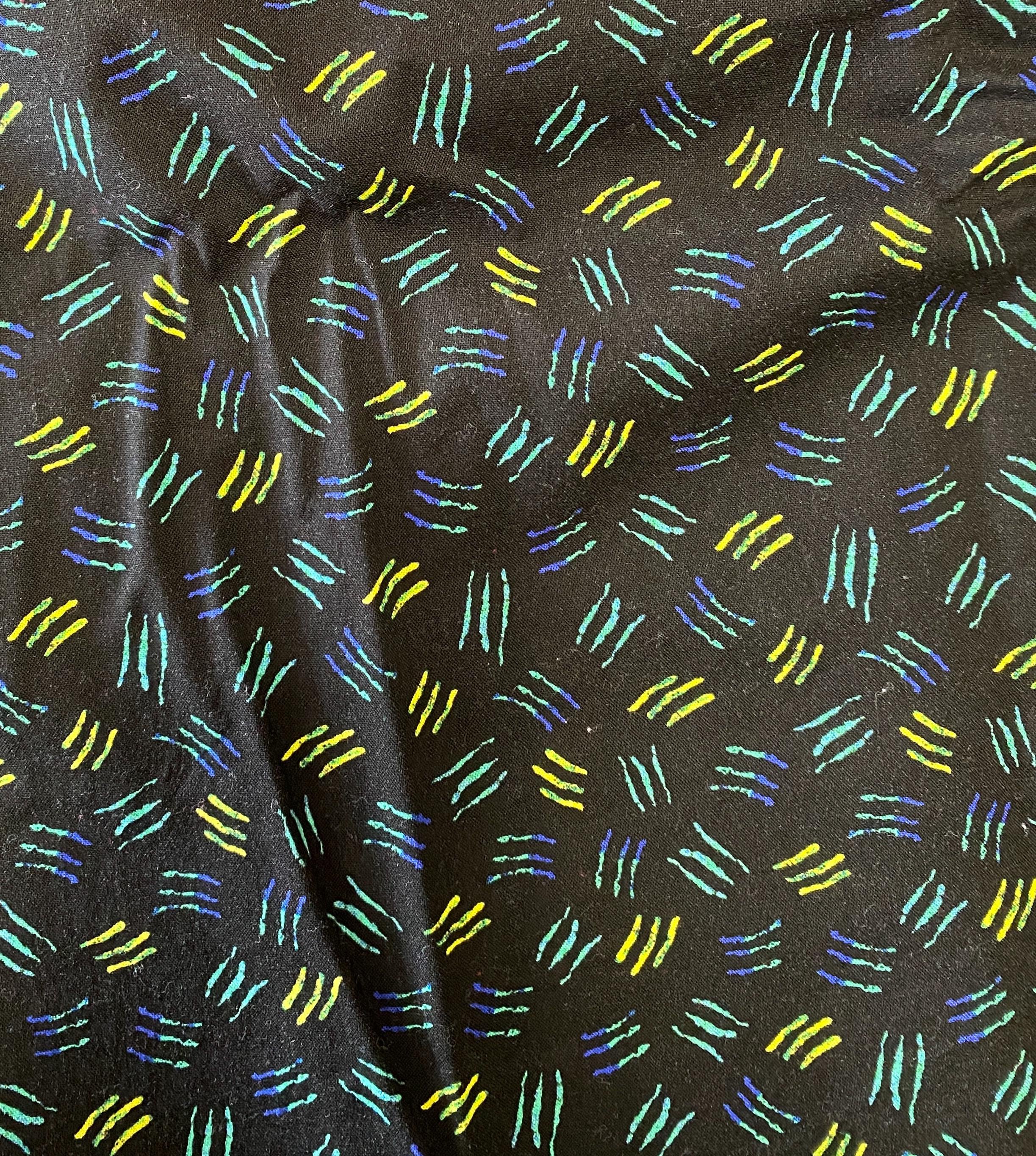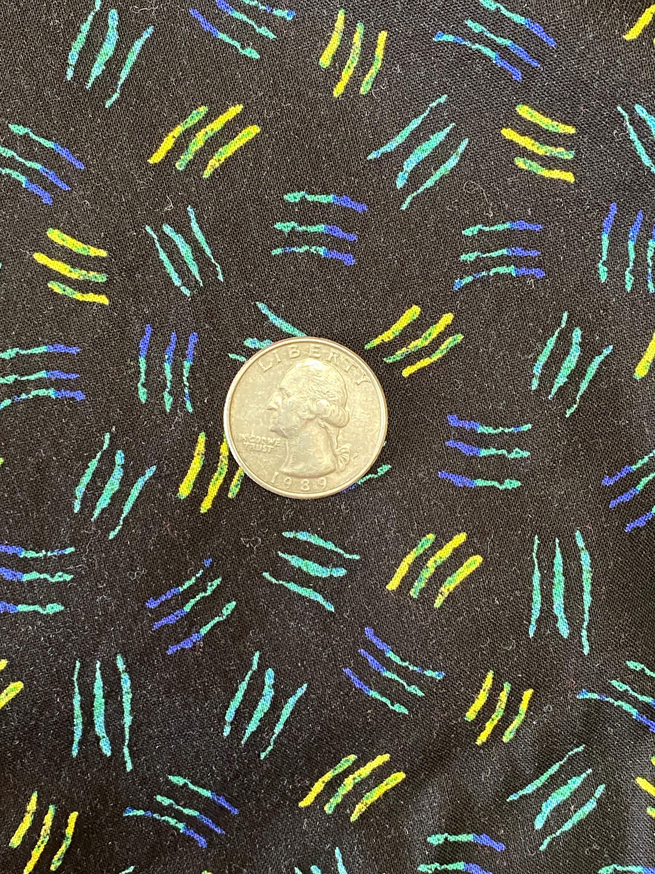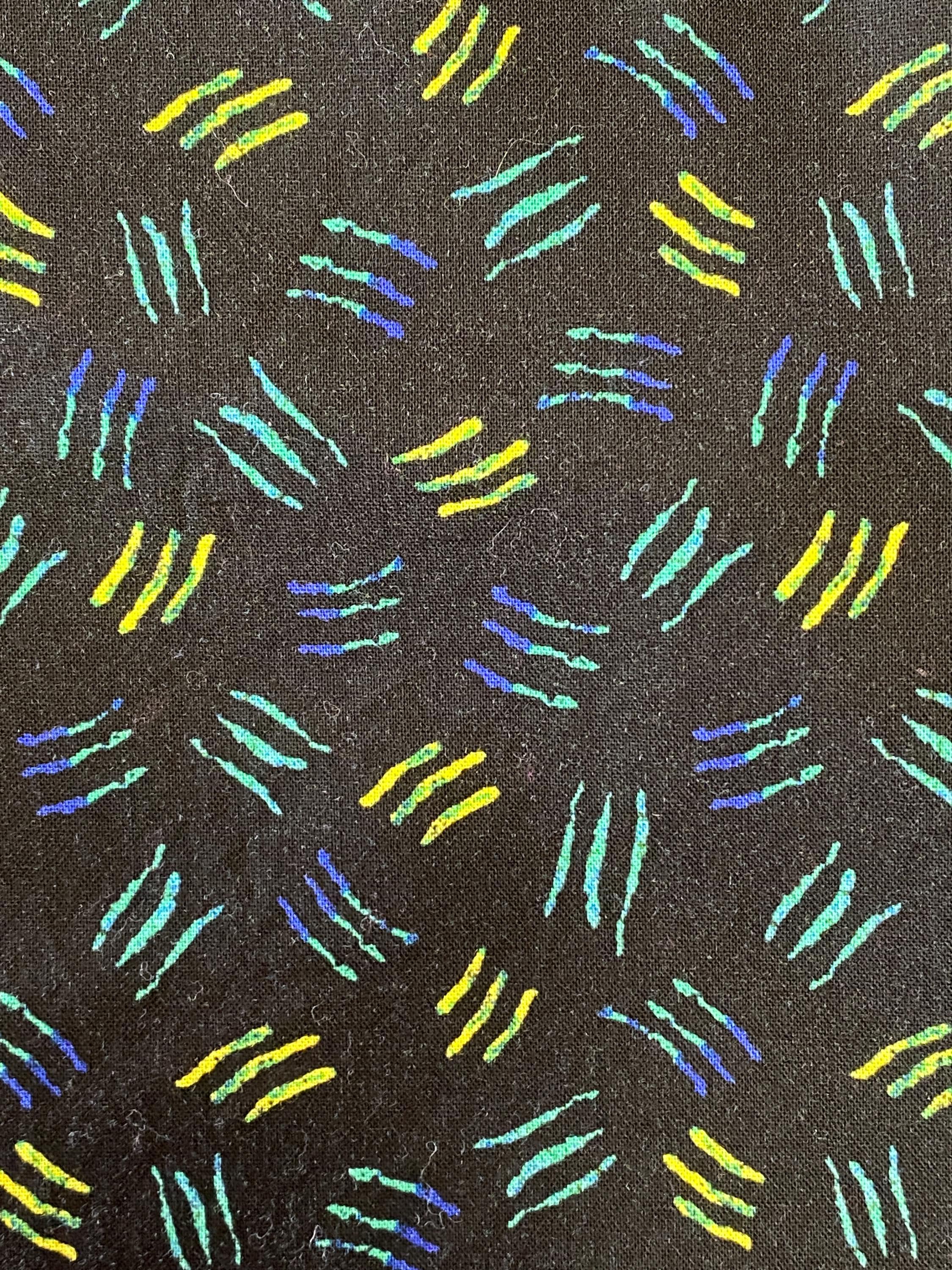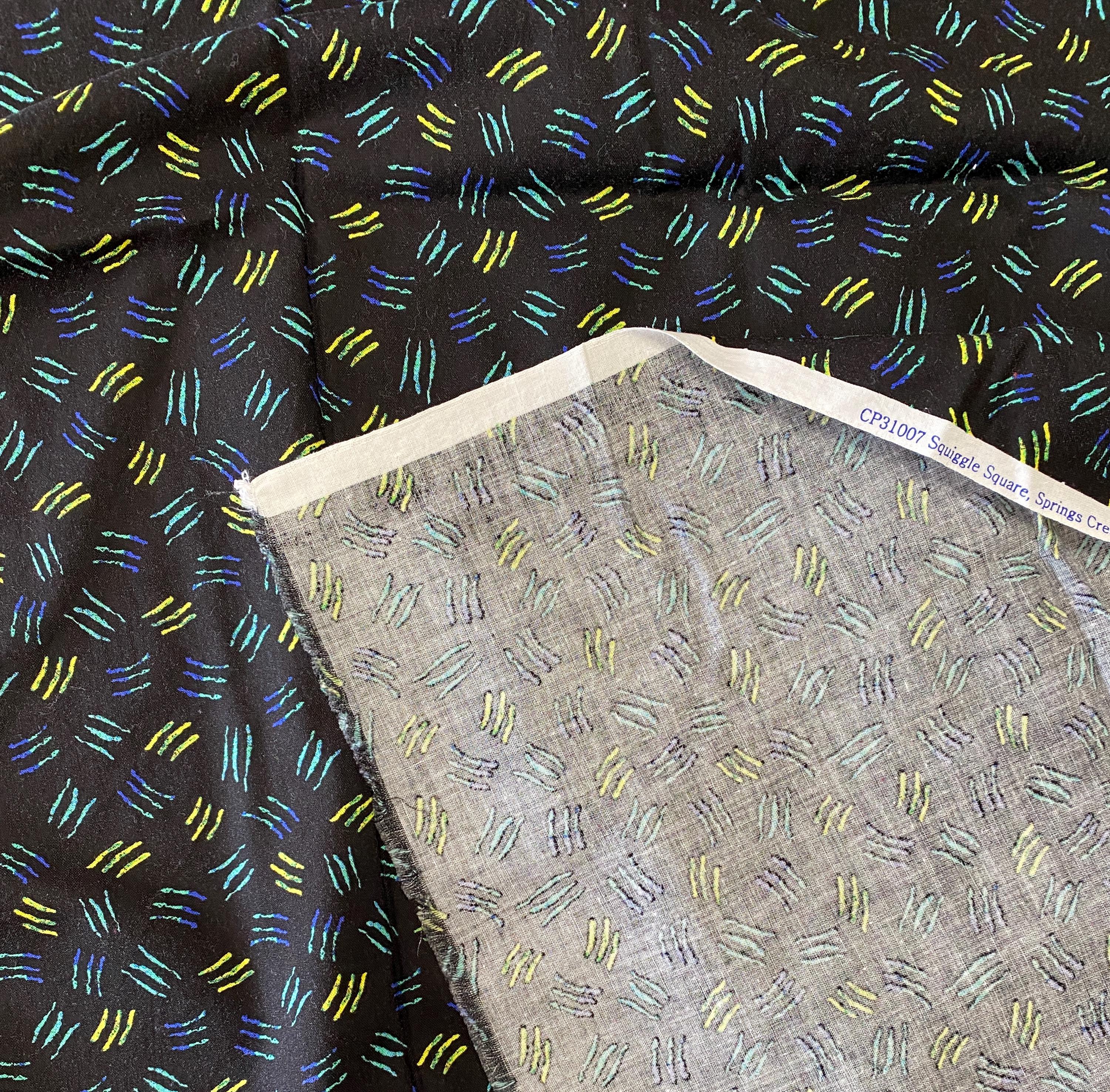 The background is black and the squiggles morph from blue to turquoise to green to yellow. Each square of sqiggles is approximately 1/2" on all sides. Fabric is 41 inches wide.