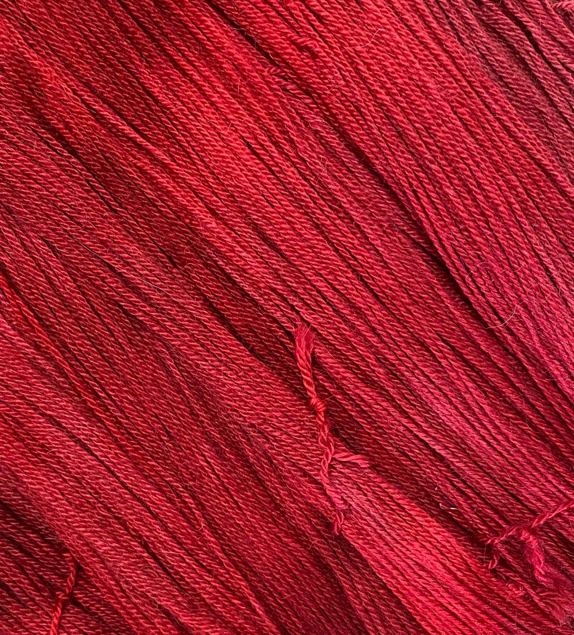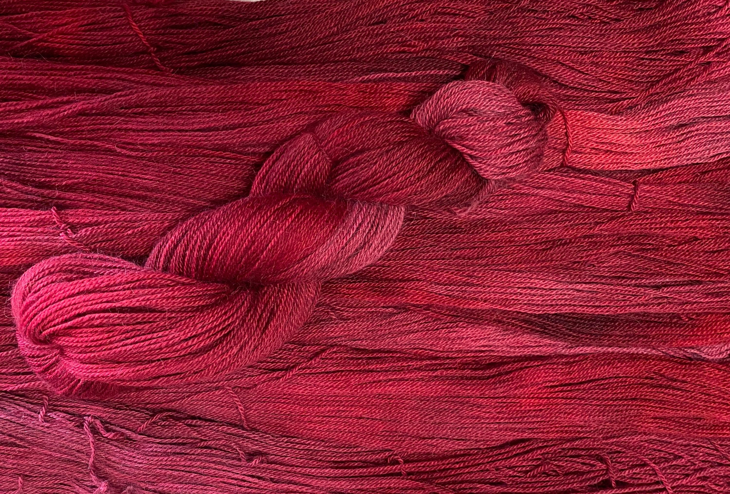 It always amazes me when working with a new color scheme how the same dye reacts with different yarns. One yarn came out a dark purple with burgundy and black undertones. The same dye with this yarn gave me every shade of red imaginable with perhaps a hint of purple here and there.