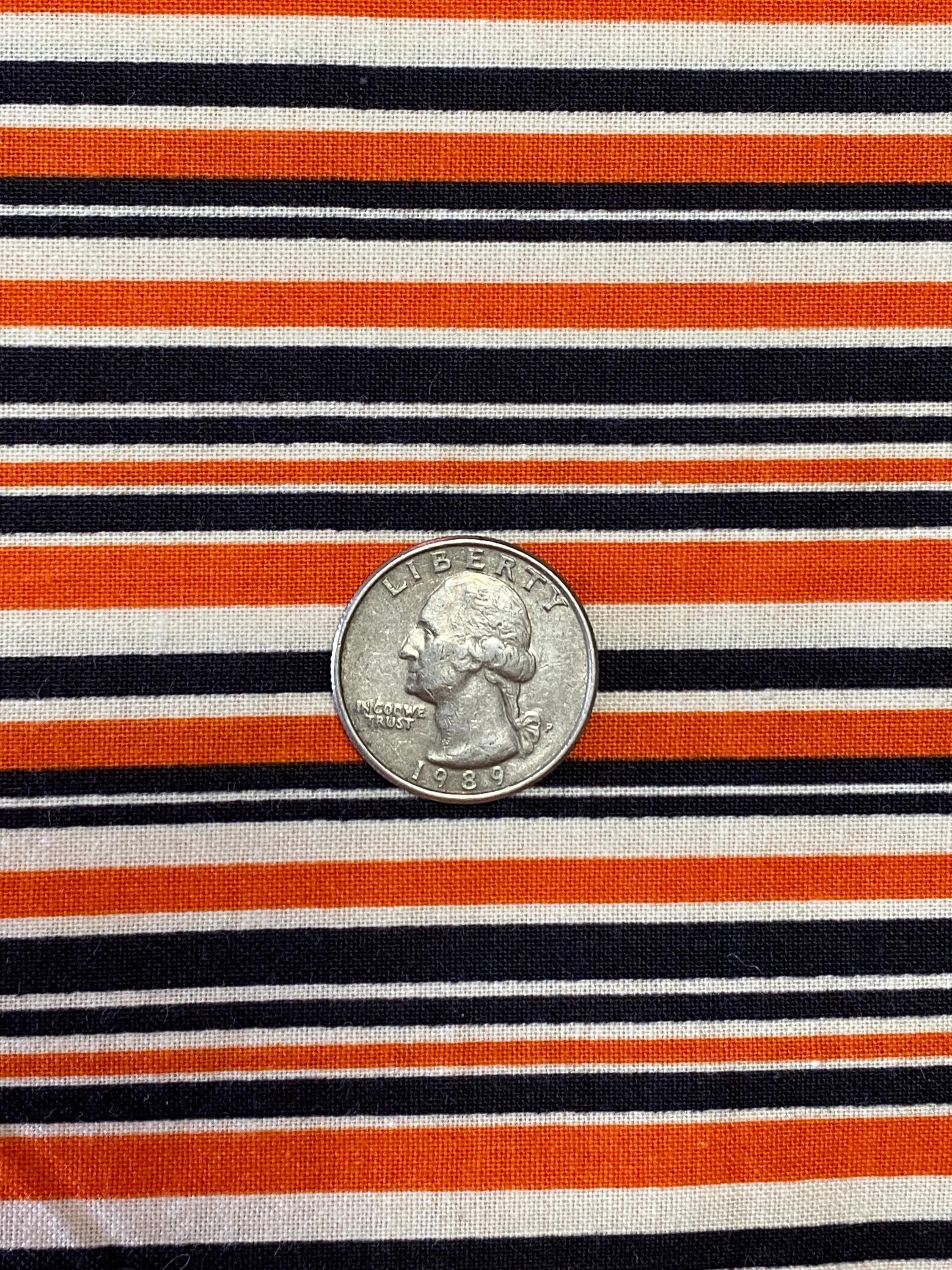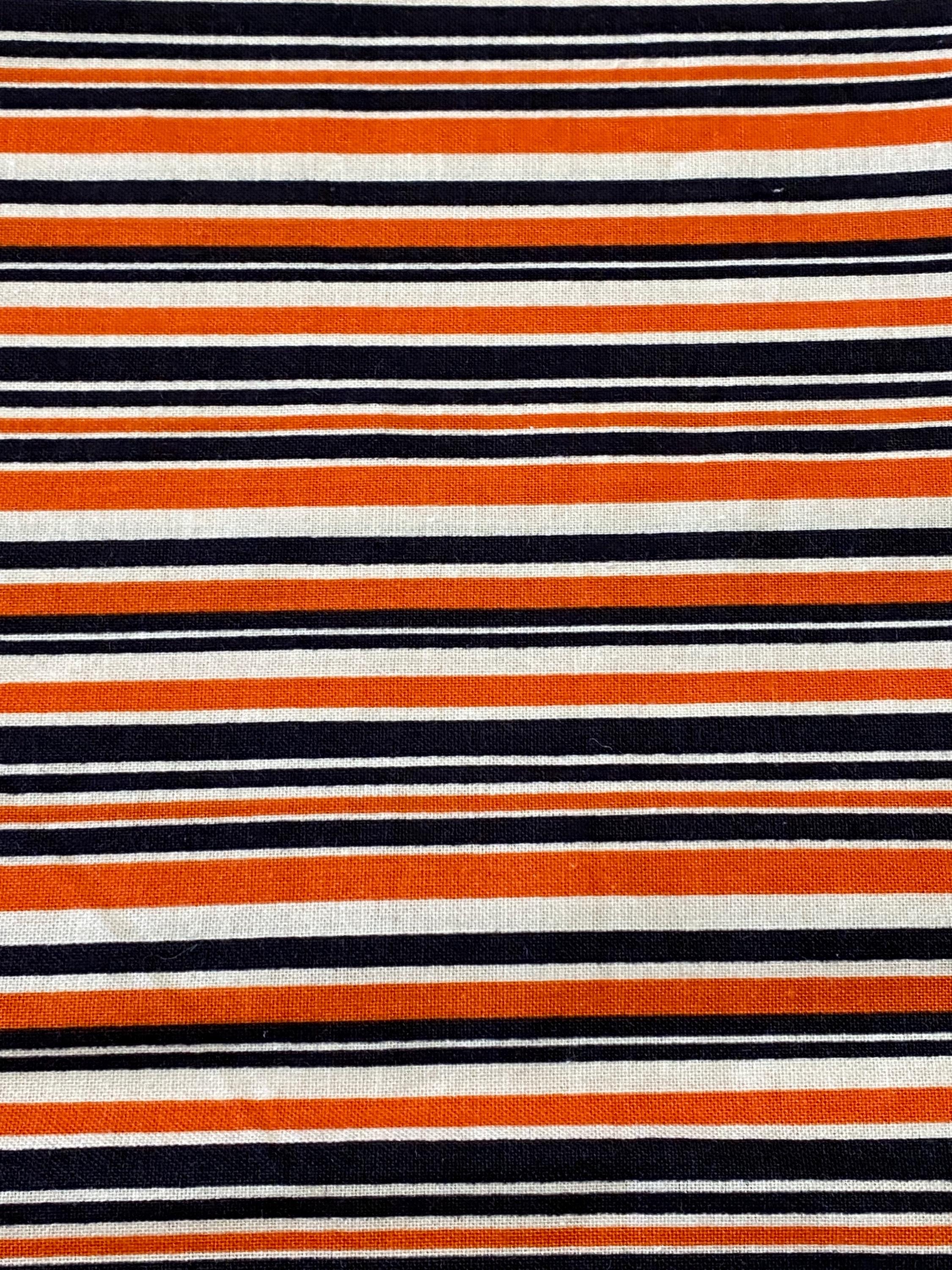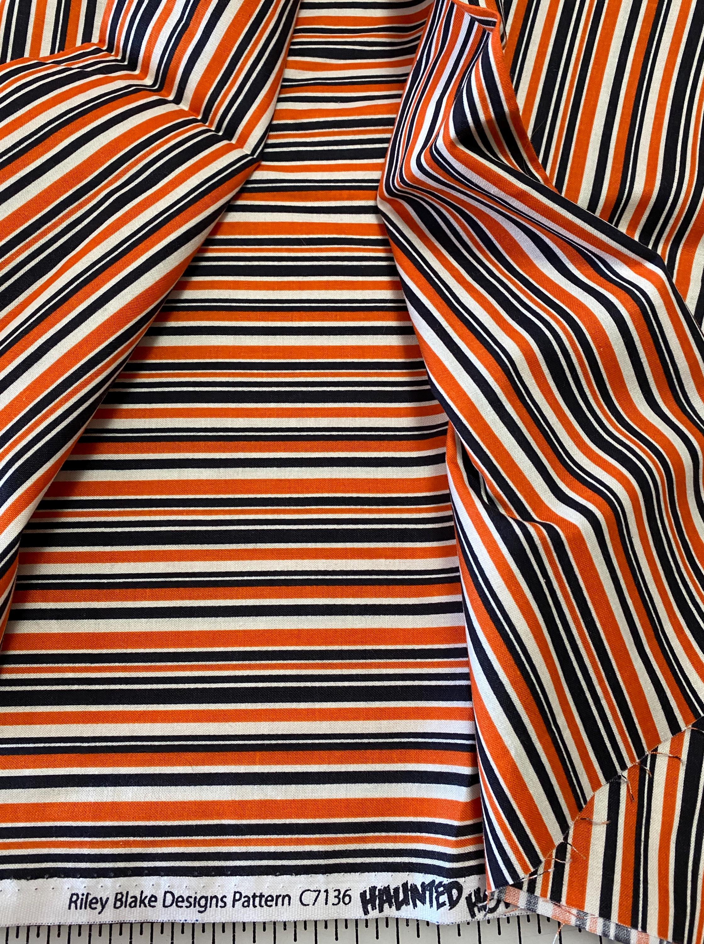 Black & Orange Stripes by Riley Blake: Haunted House series by Carta Bella (2018)- There are a lot of striped orange & black fabrics out there but in most, the stripes are all the same size (like all are 1/8" or 1/4"), but this is one of the few with variable size stripes which is very pleasing to the eye. This is long out of print, quality fabric, good hand, unwashed and 100% cotton. Uncut fabric is 43 inches wide.