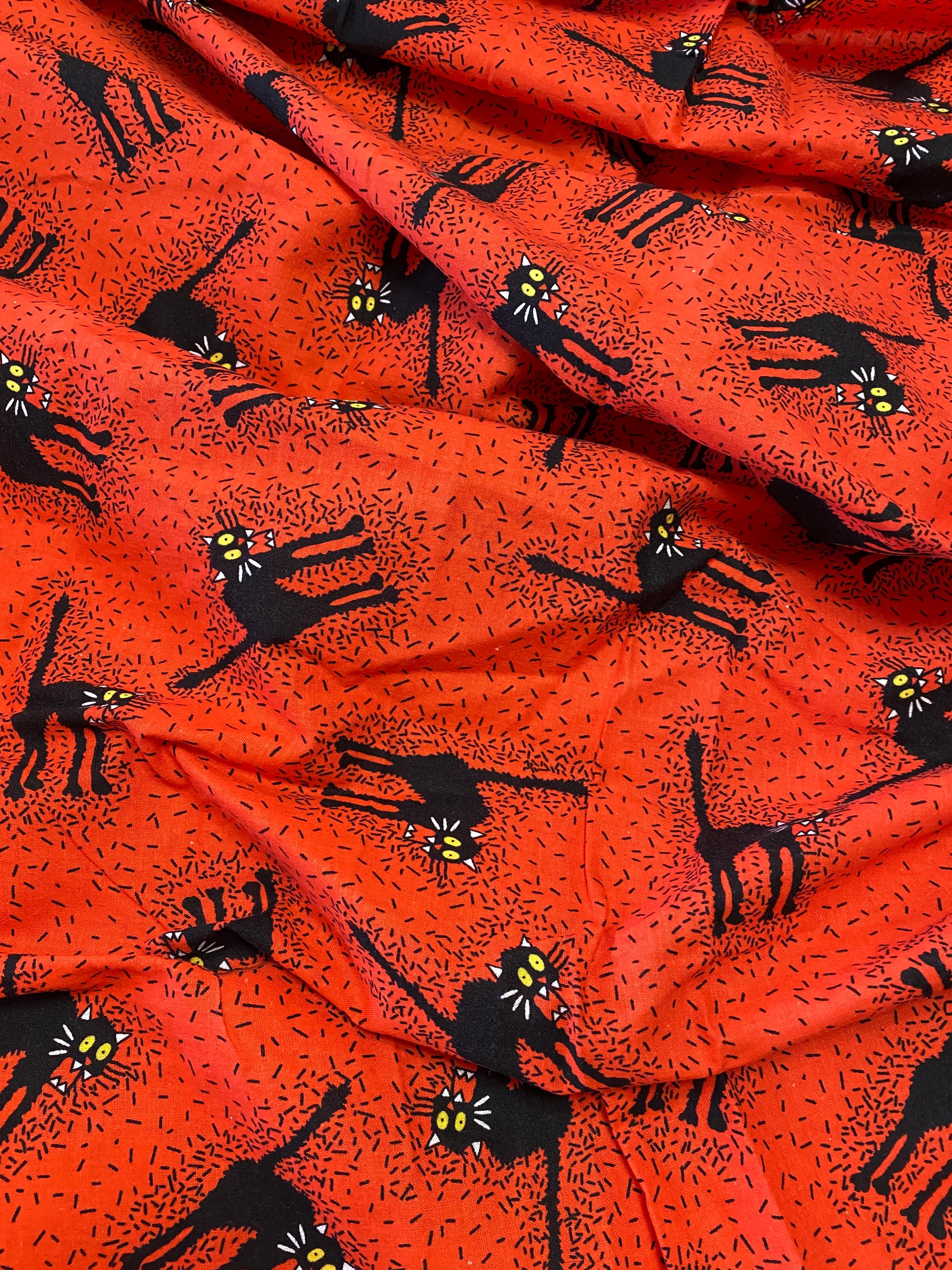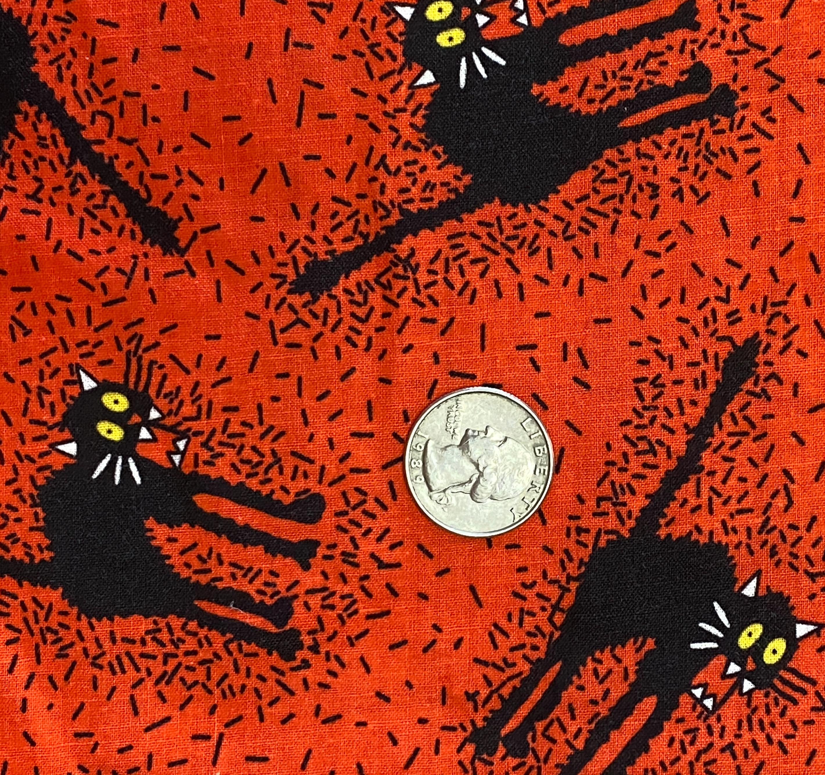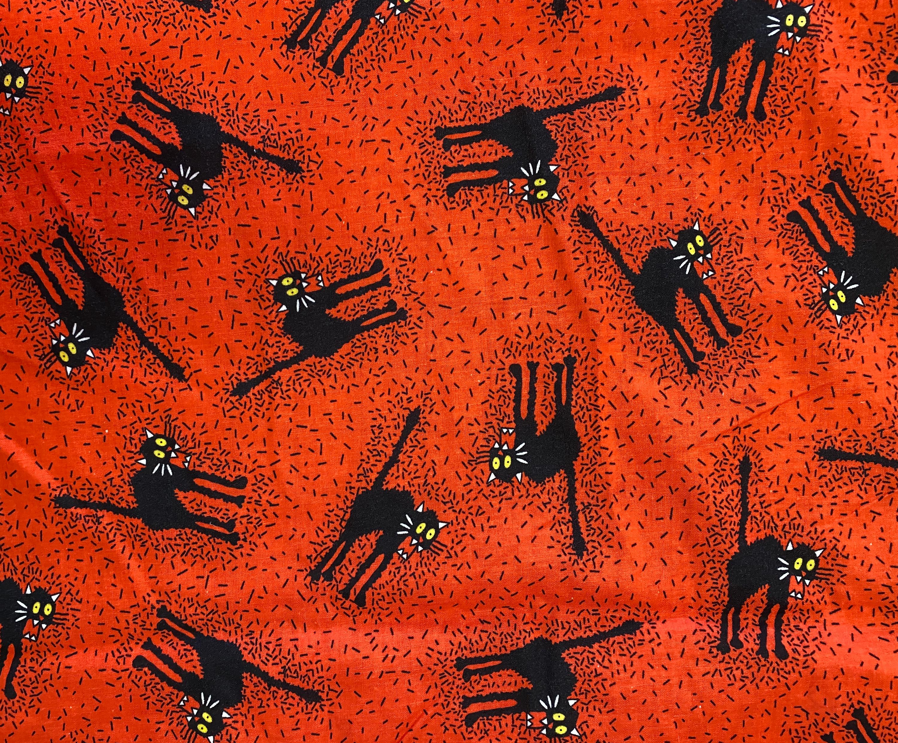 Hissing Black Cats on Orange Vintage Halloween Fabric- Lovely hand, good thread count, long out of print and almost impossible to find. This has been pre-washed, so no shrinking or color run. 100% cotton. Uncut fabric is 42 inches wide.