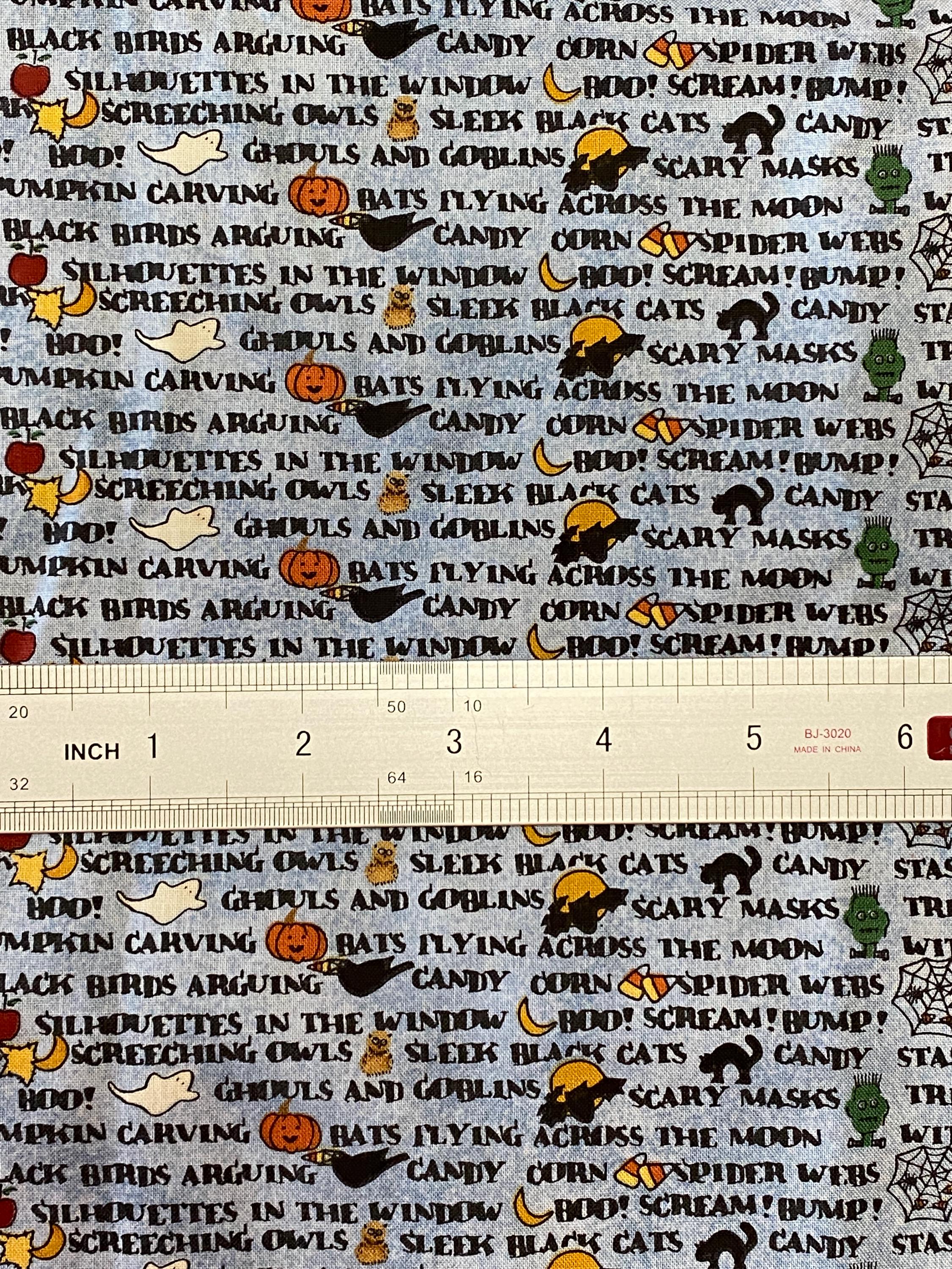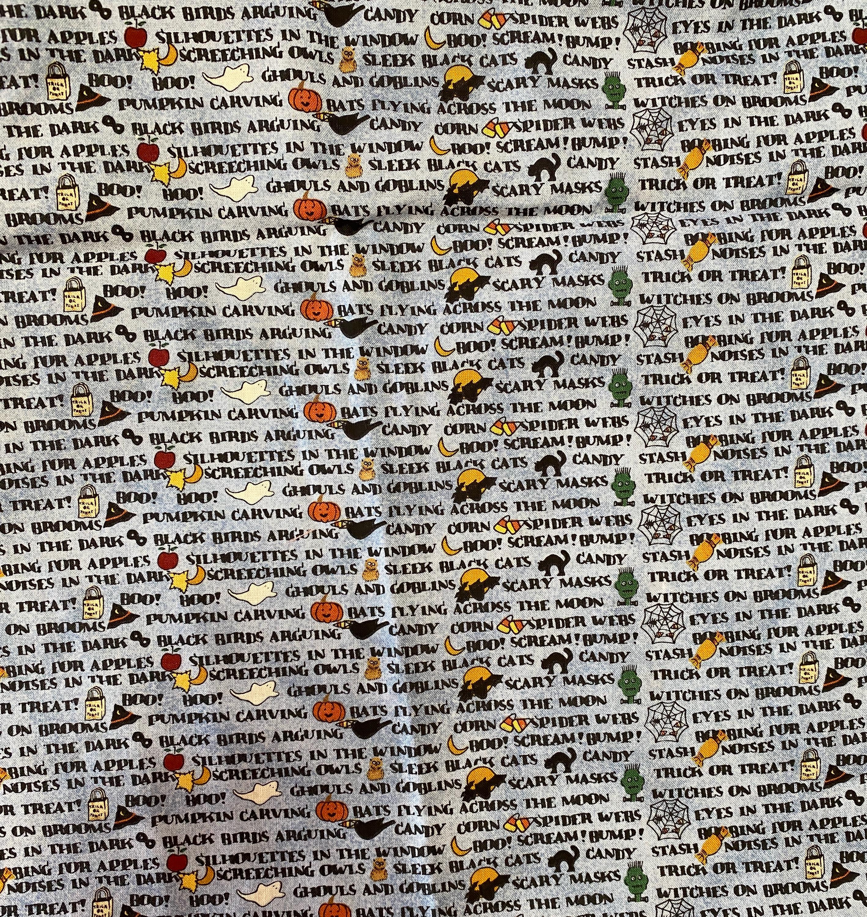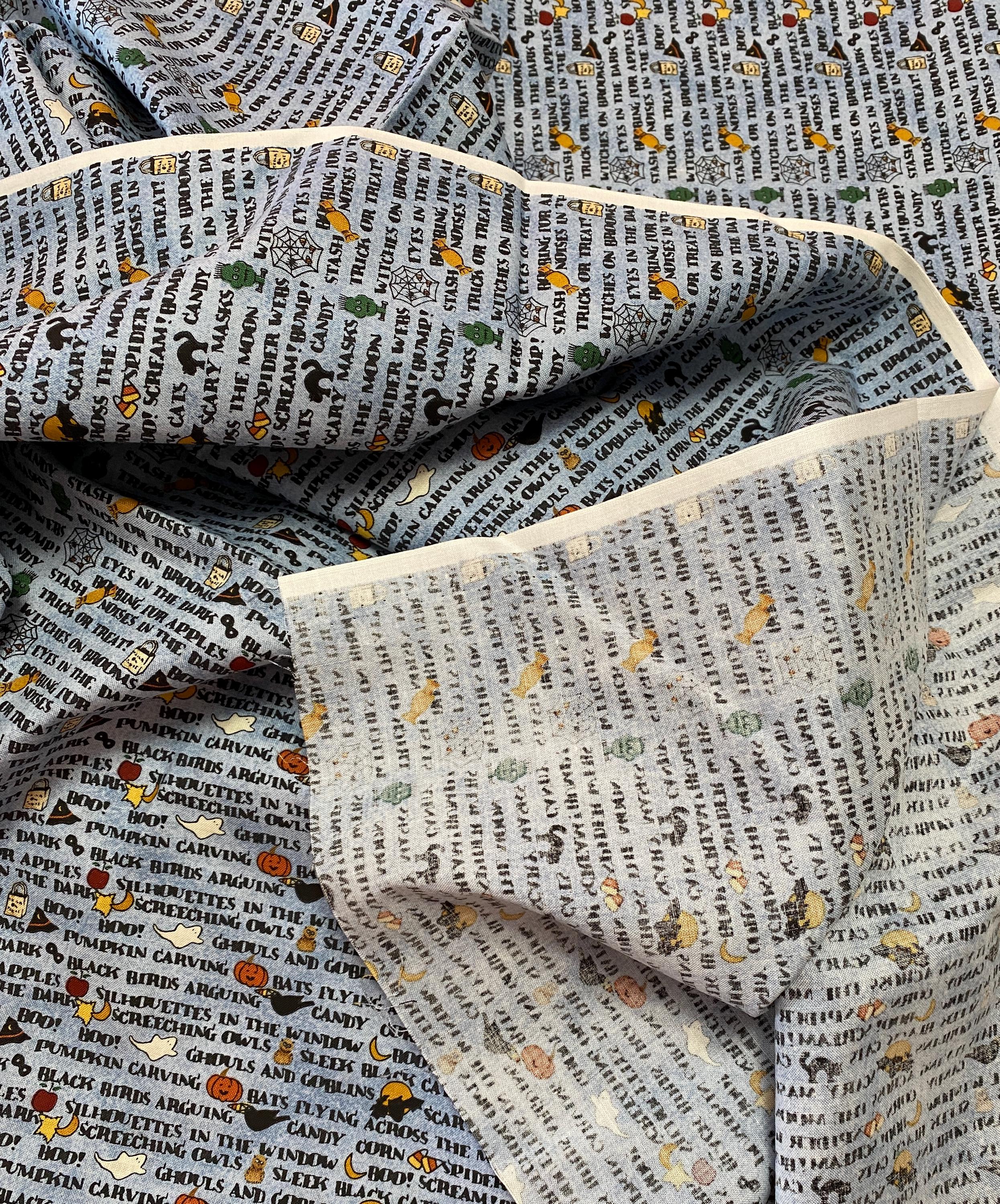 Across a background of light denim blue, a litany of Halloween-y phrases appear in columns along with cartoon renditions of equally Halloween-y images: black cats, jack o'lanterns, ghosts, candy corn, etc. This is one of those fabrics that looks like a basic blue printed fabric until you get closer and then...BAM, Halloween!