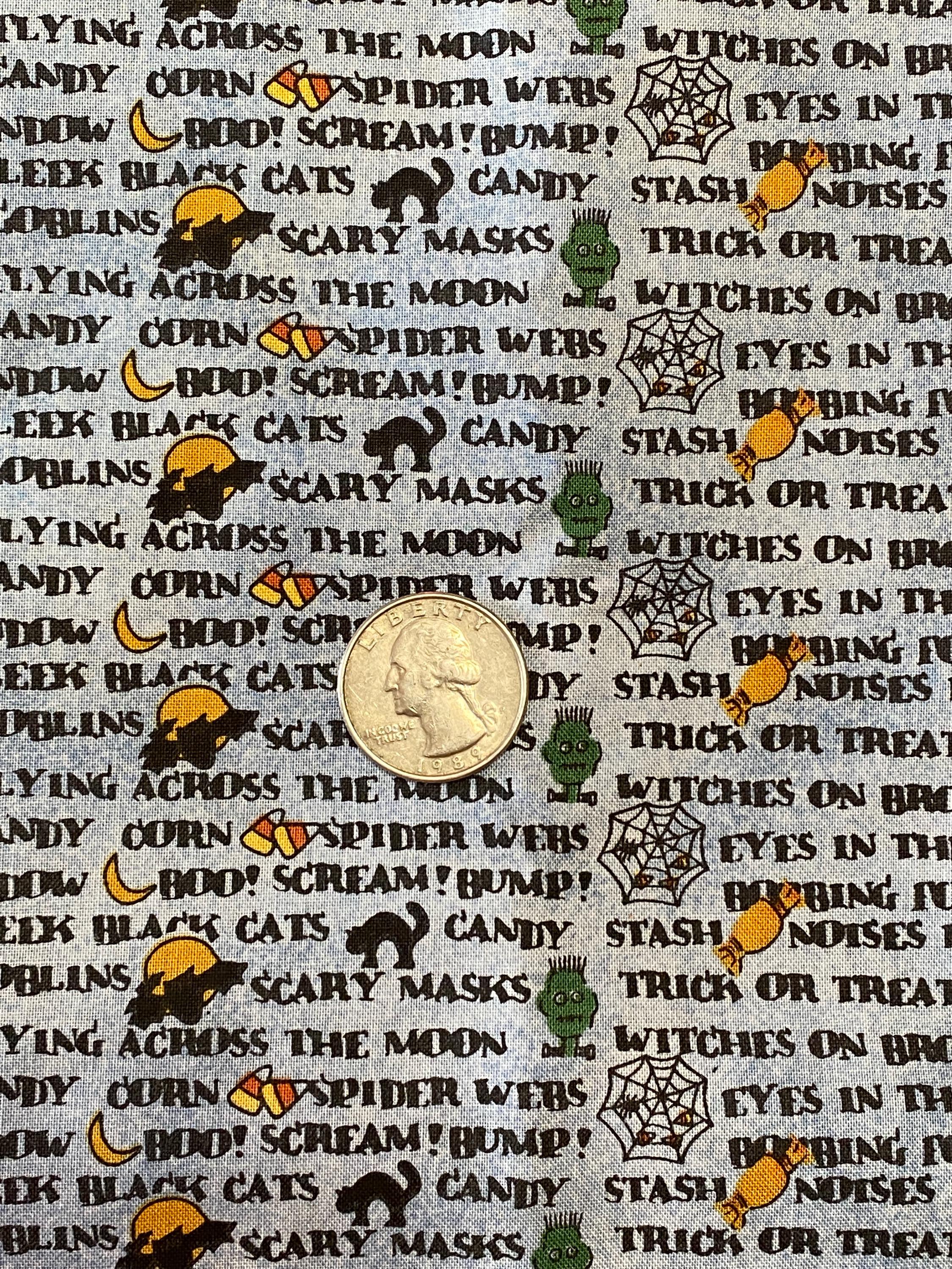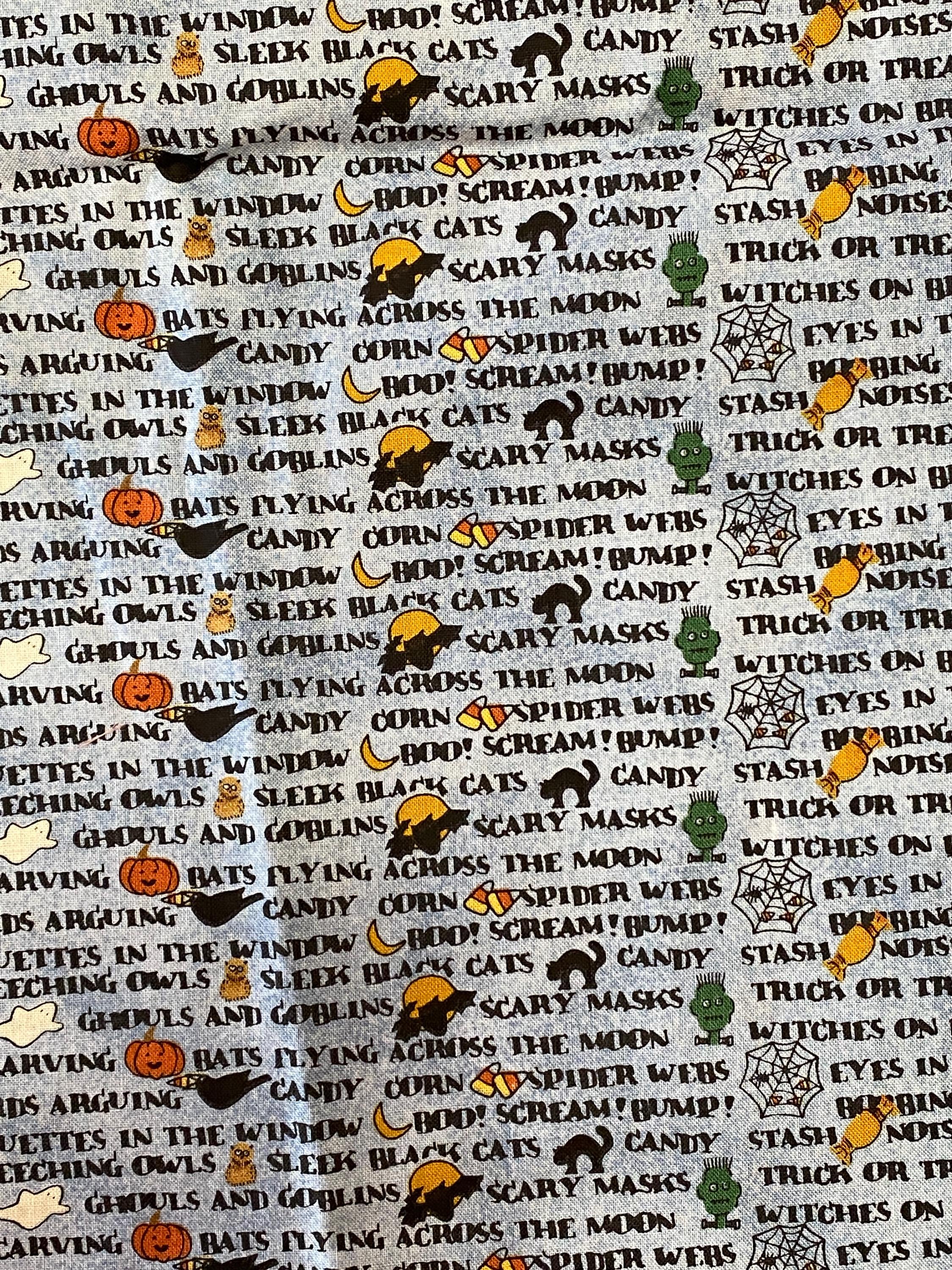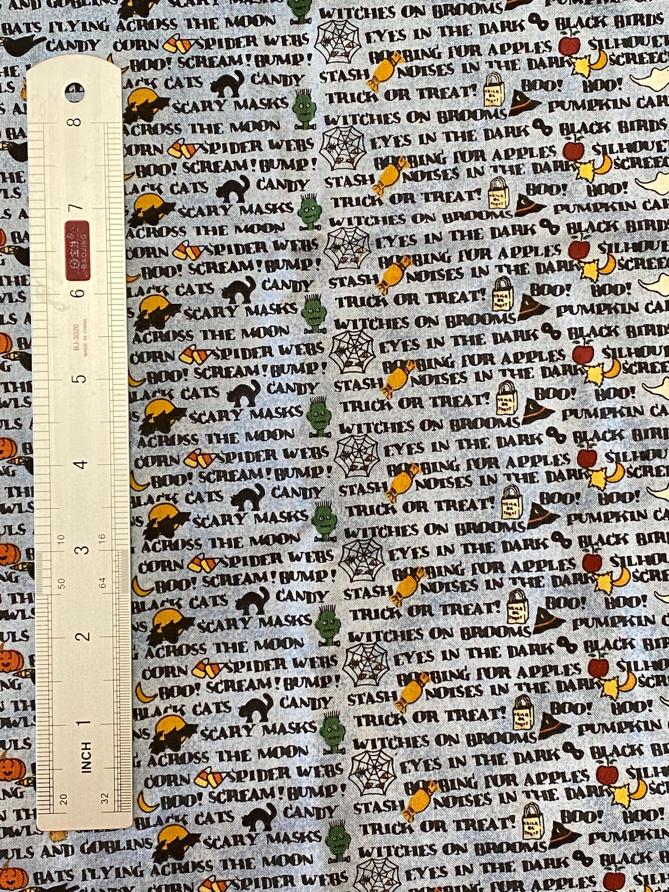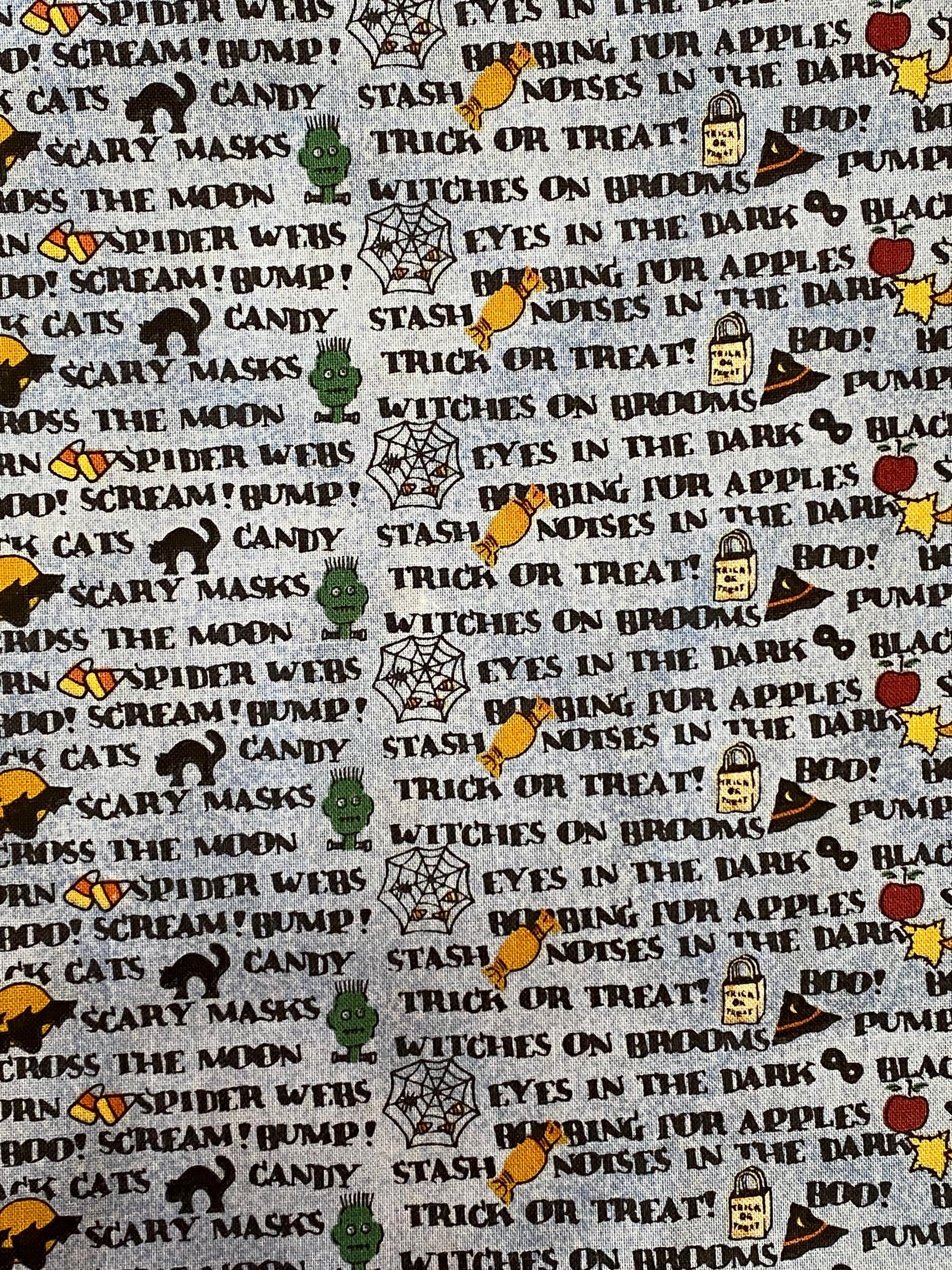 Across a background of light denim blue, a litany of Halloween-y phrases appear in columns along with cartoon renditions of equally Halloween-y images: black cats, jack o'lanterns, ghosts, candy corn, etc. This is one of those fabrics that looks like a basic blue printed fabric until you get closer and then...BAM, Halloween!