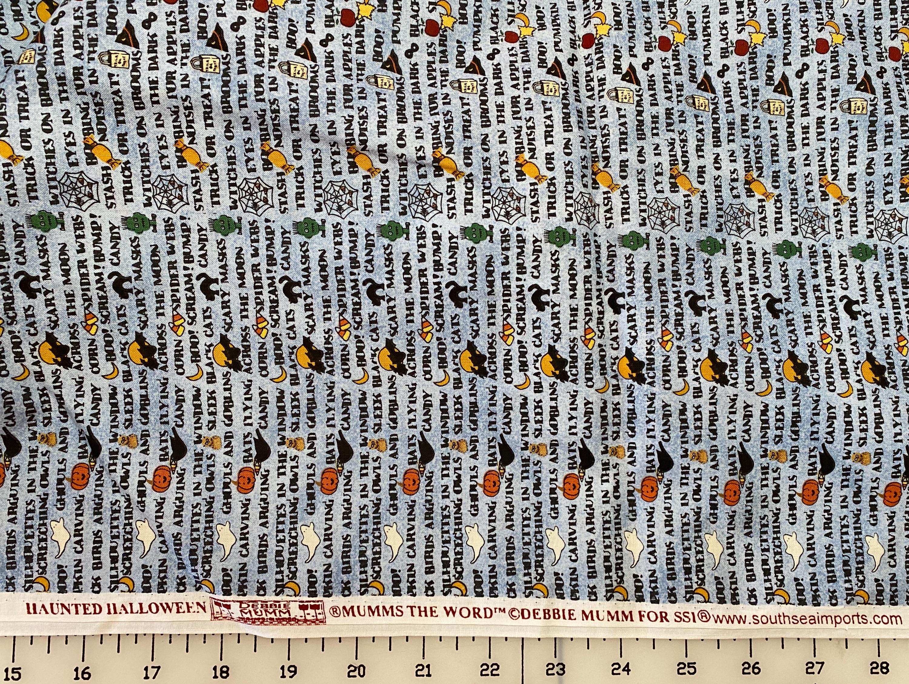 This fabric is all Halloween phrases with the wonderfully punned series name, Mumms the Word by Debbie Mumm for SSI (South Sea Imports).