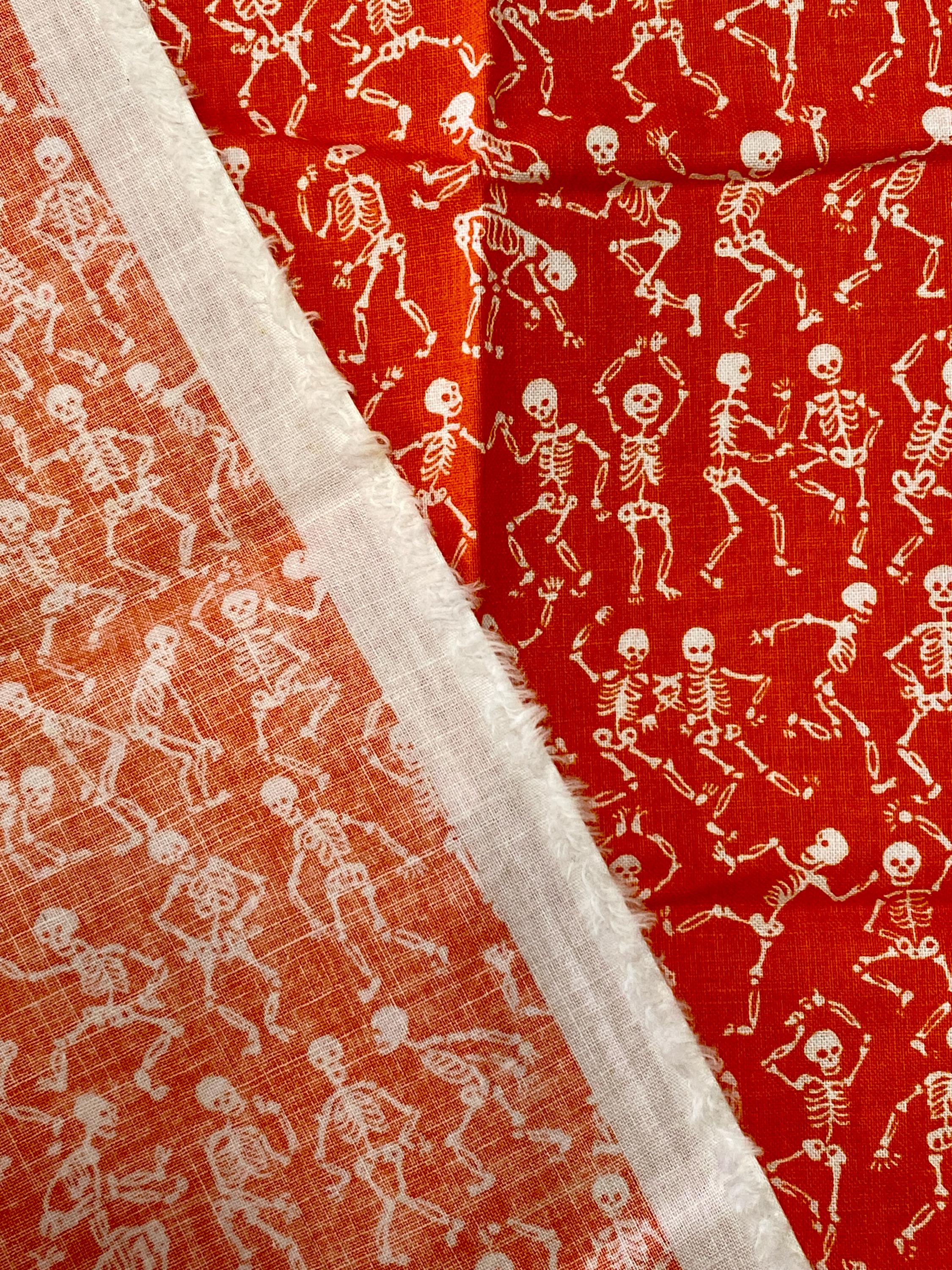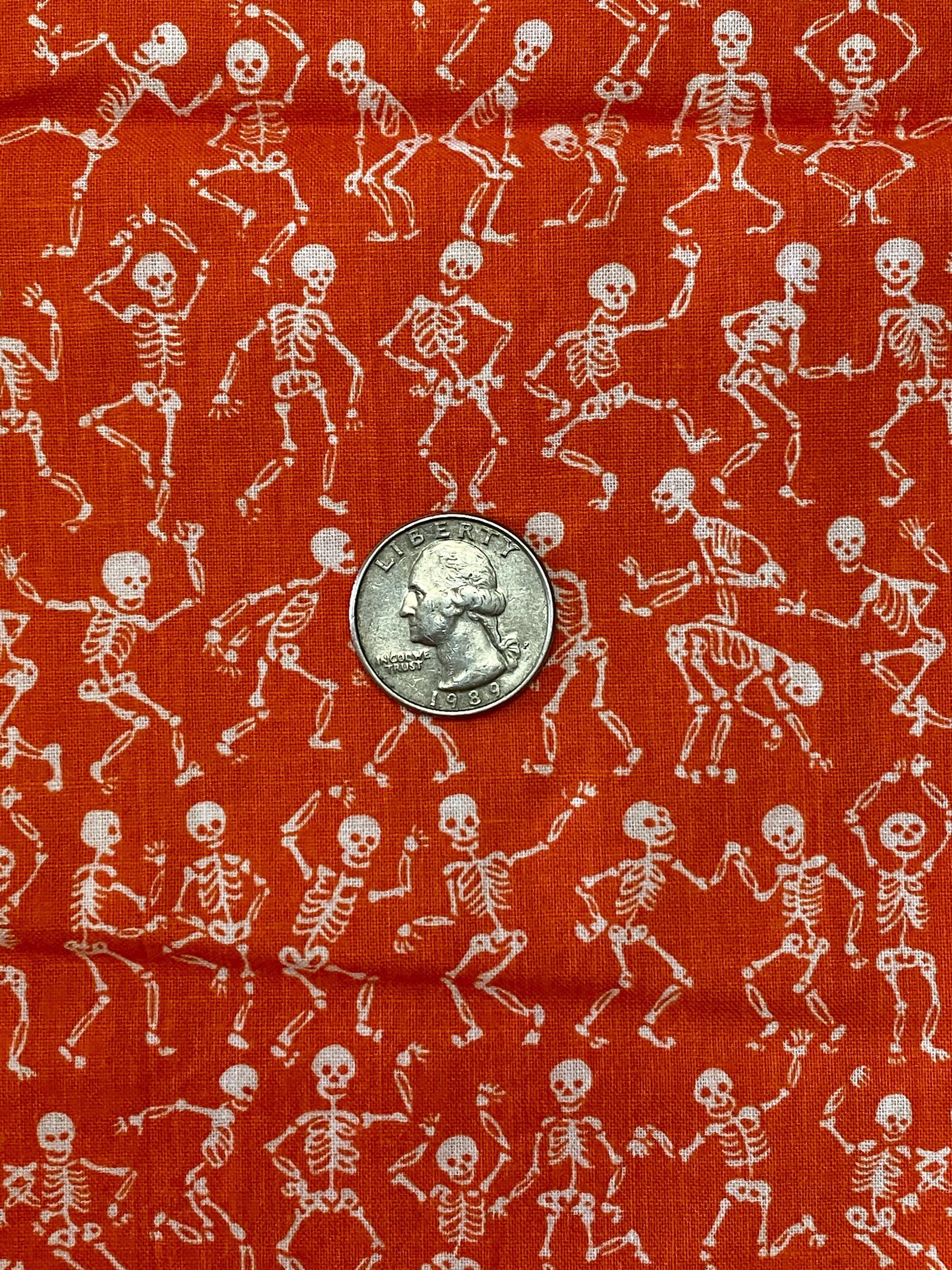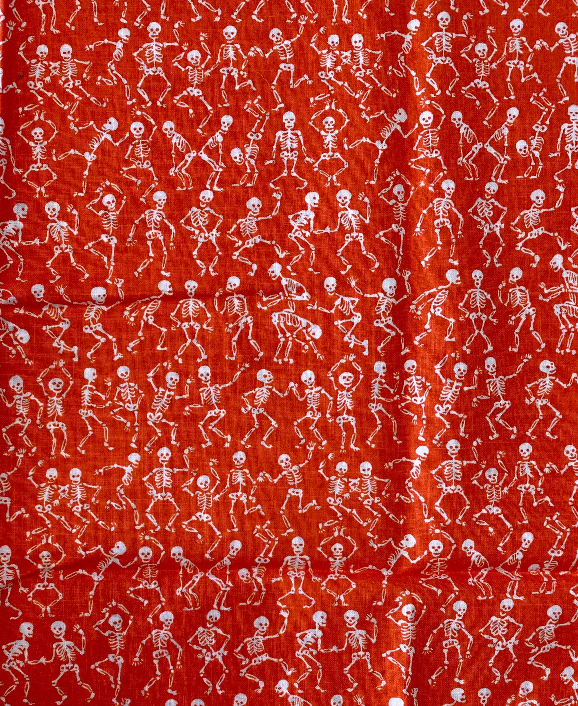 There are a lot of skeleton fabrics out there with 3 or 4 skeletons being repeated over & over. I think I have counted 25 different ones on this design...they keep dancing around so it is hard to tell.
