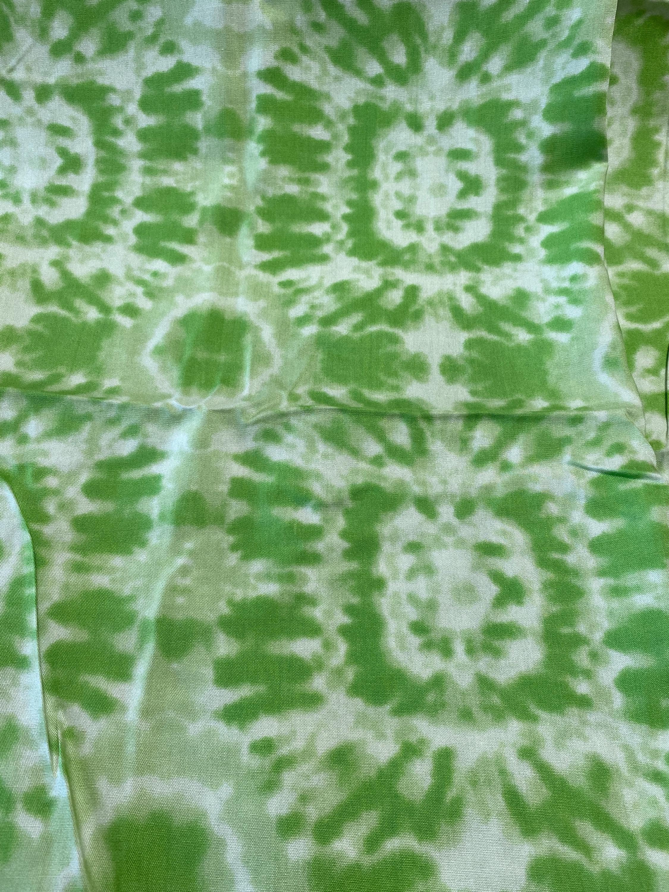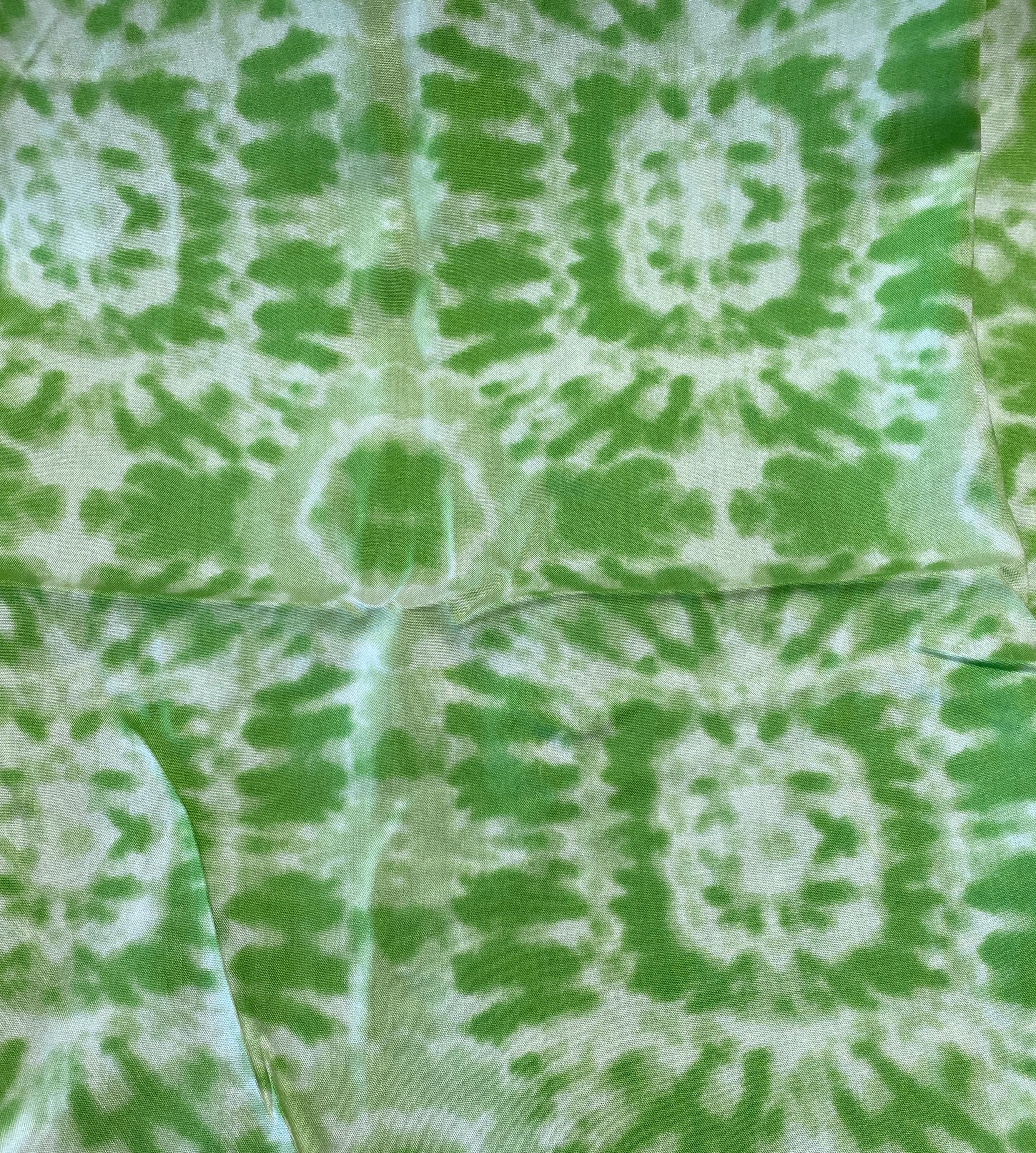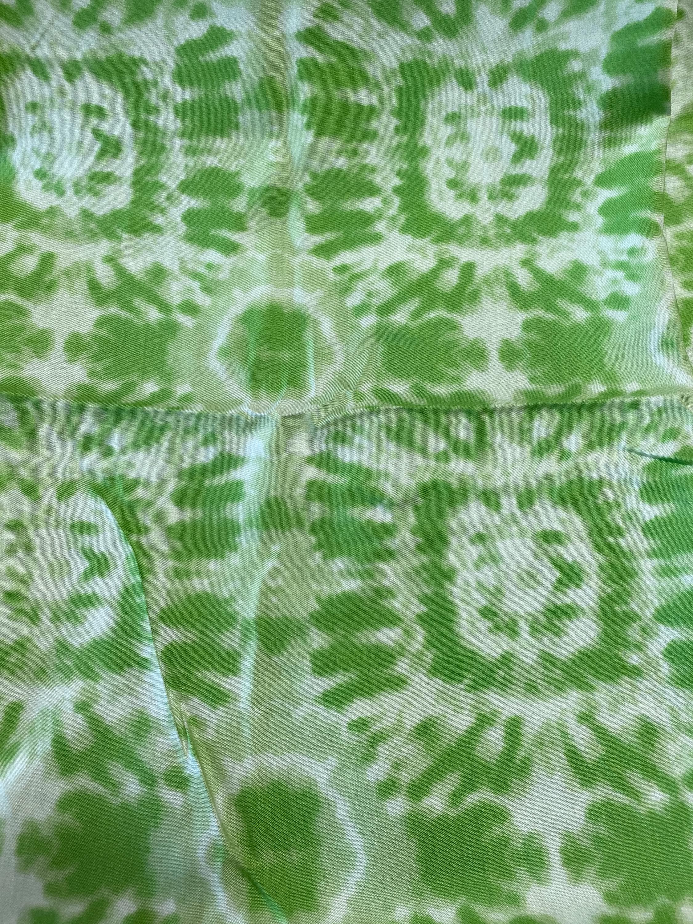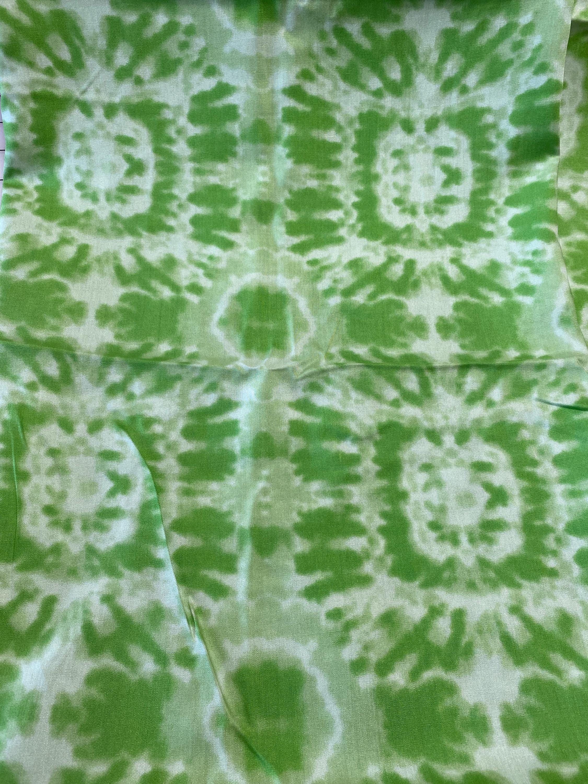 It sports a faux tie dye print of lime green and cream. 56 inches wide and sold by the yard. We currently have 4 yards of this.