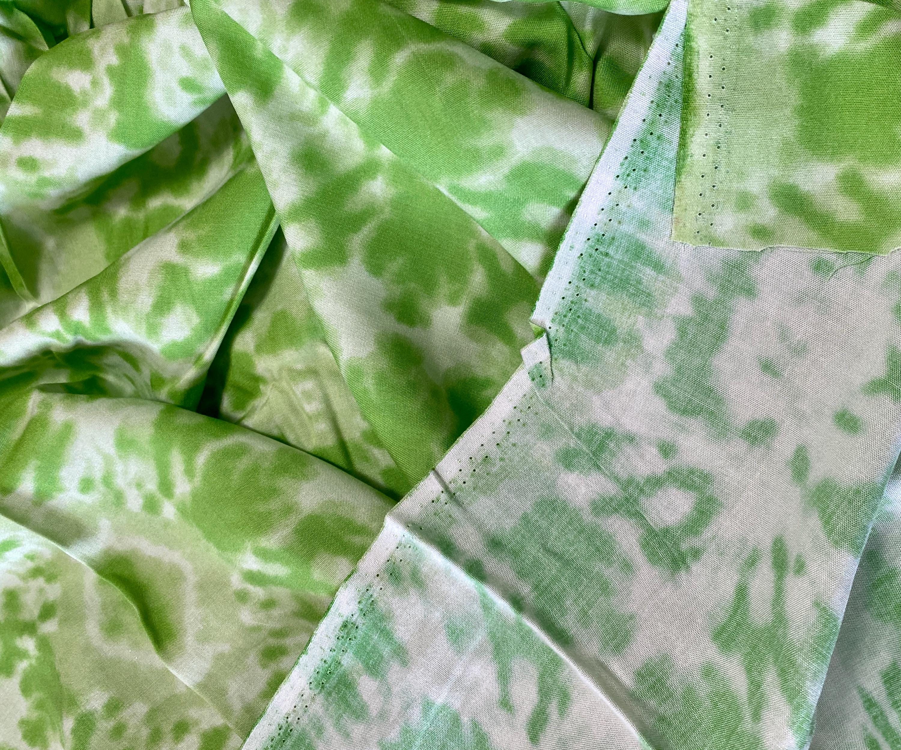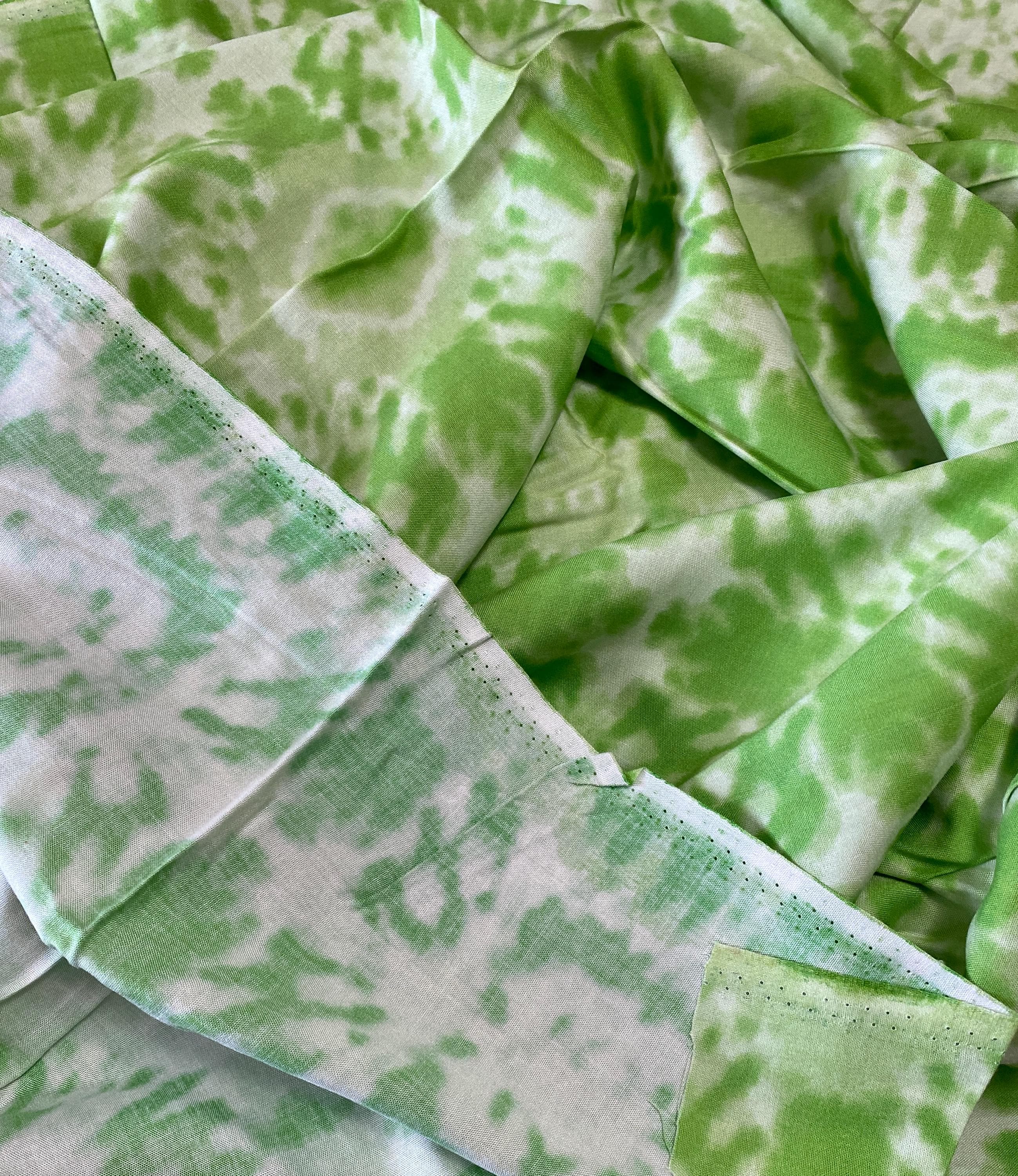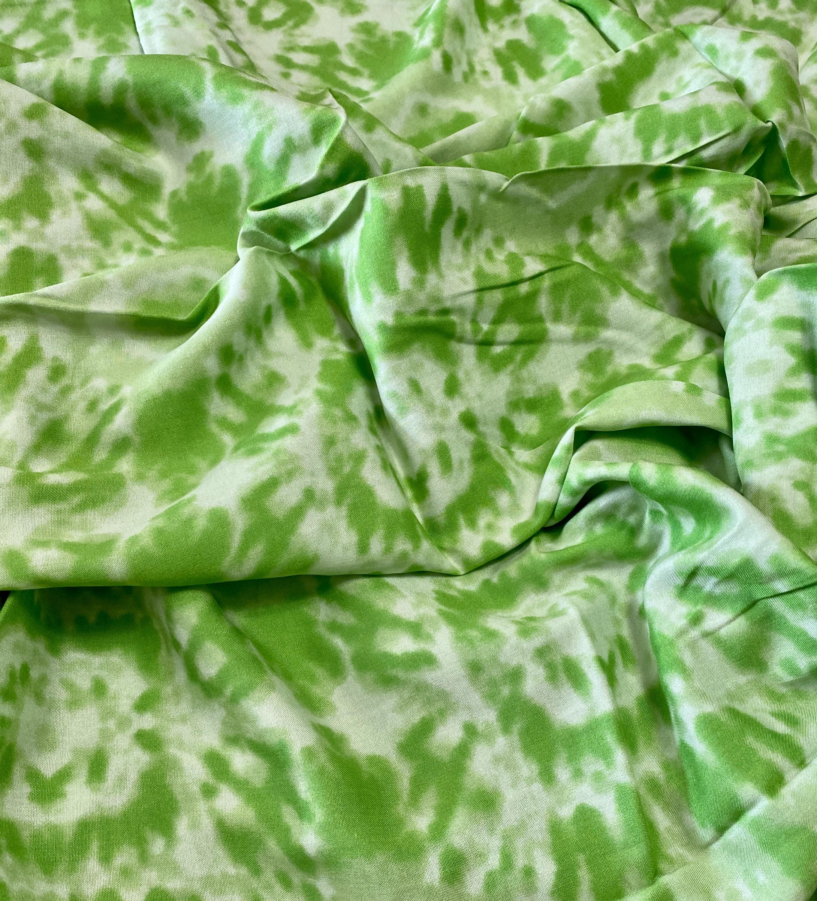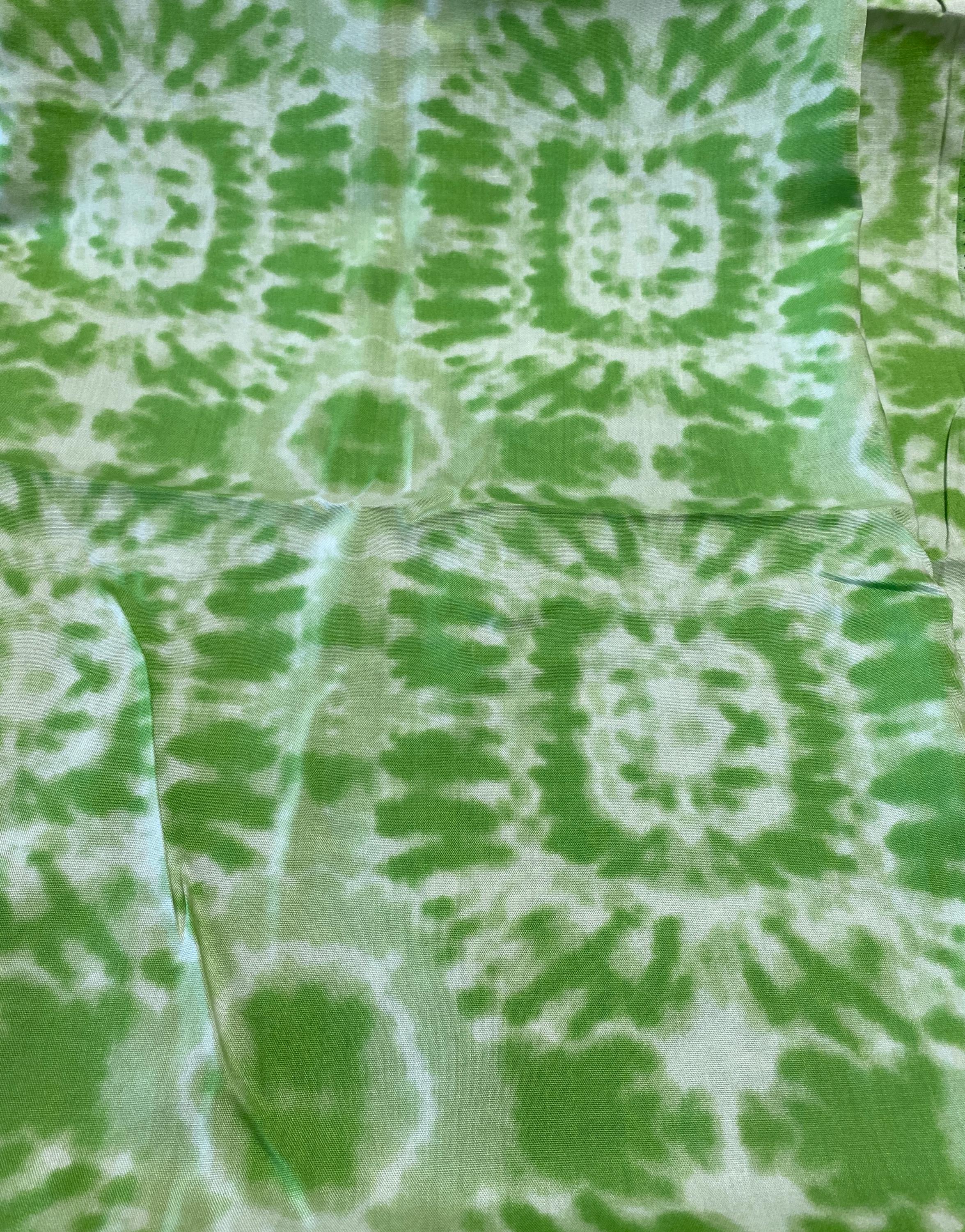 It sports a faux tie dye print of lime green and cream. 56 inches wide and sold by the yard. We currently have 4 yards of this.