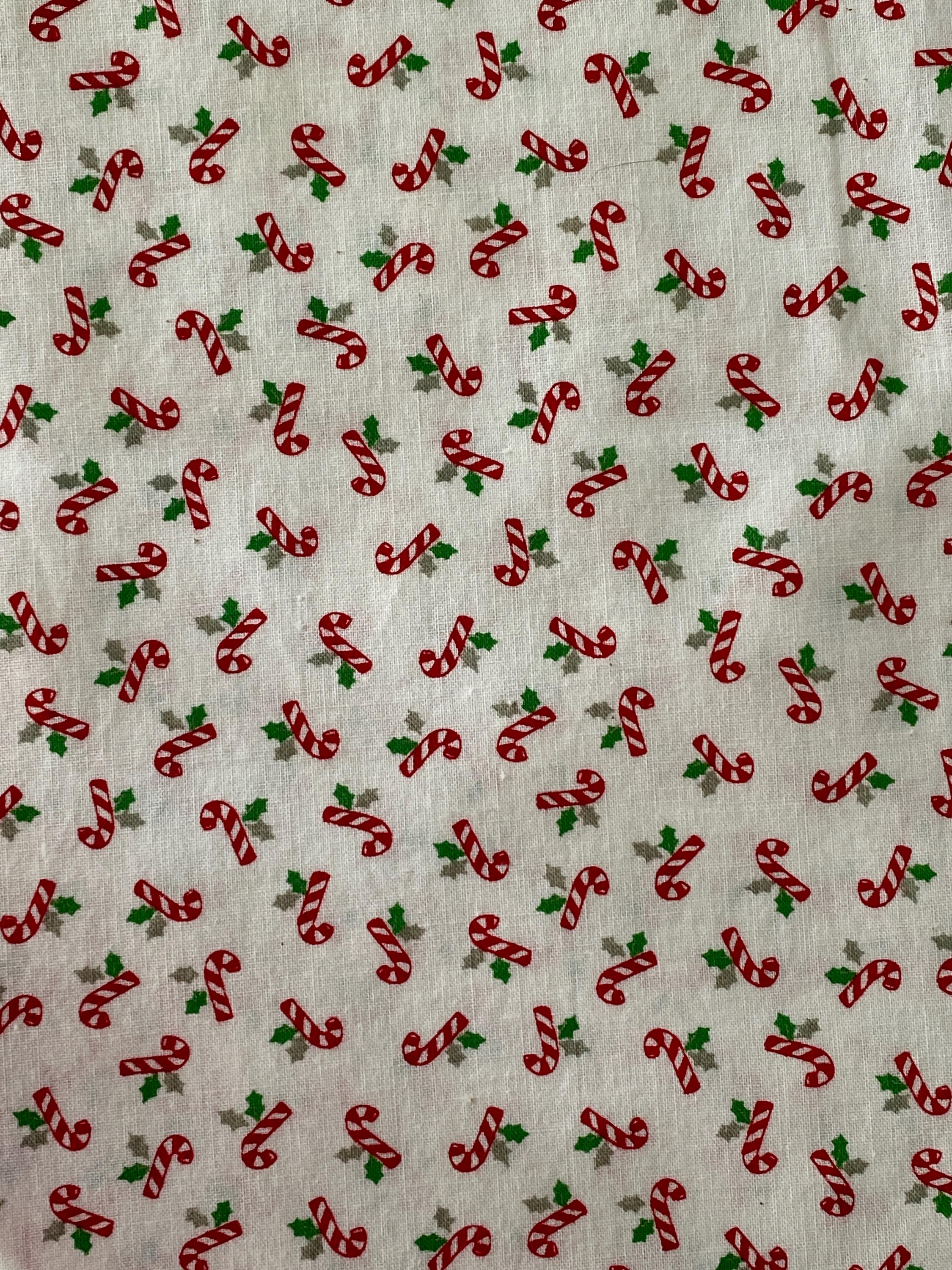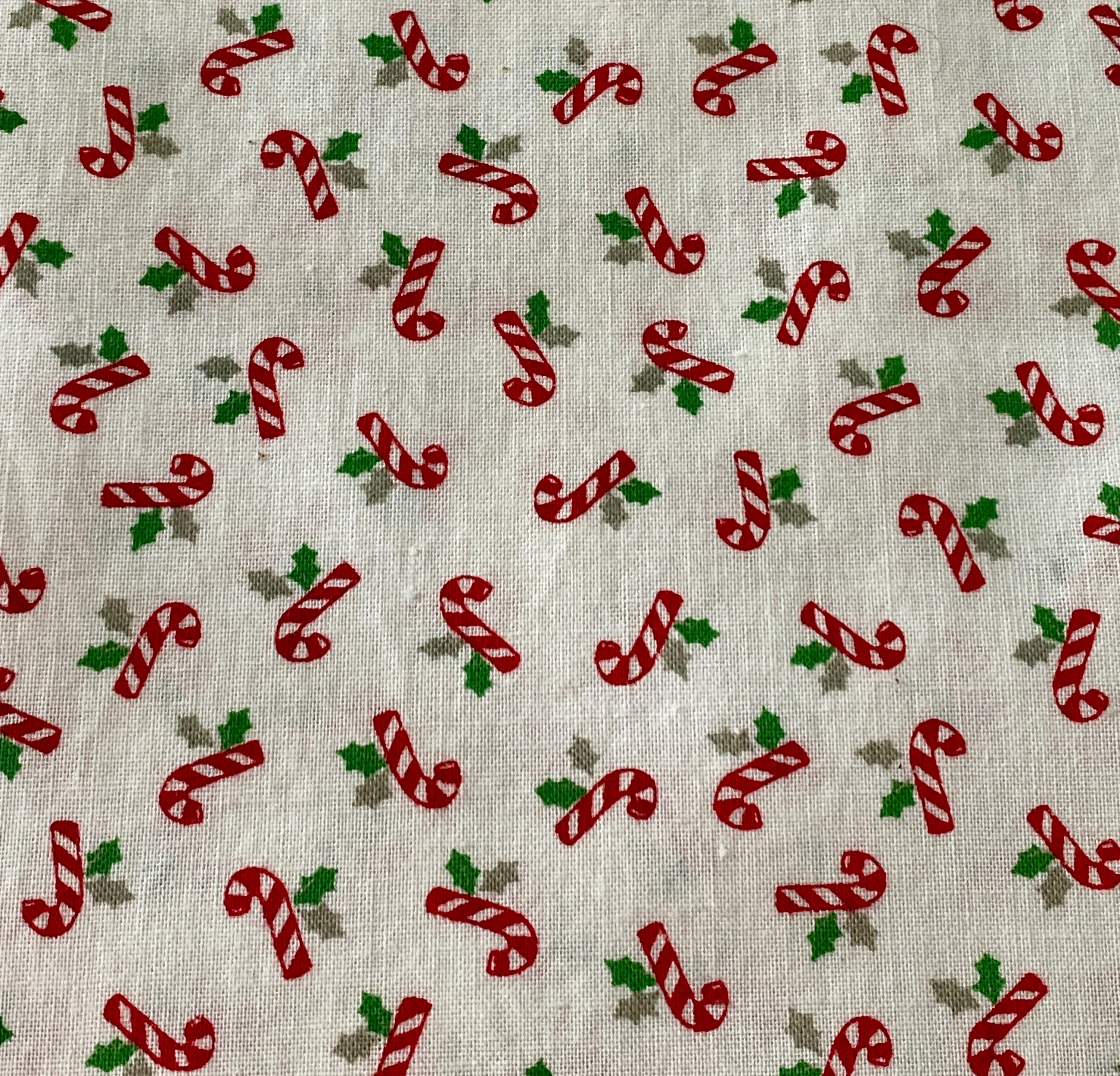 White background with small (1/2") candy canes and holly leaves from the VIP Cranston Print Works. Suitable for quilting. The fabric is 100% cotton with a medium hand. There are a few age discolorations to the white fabric, mostly at the edges.