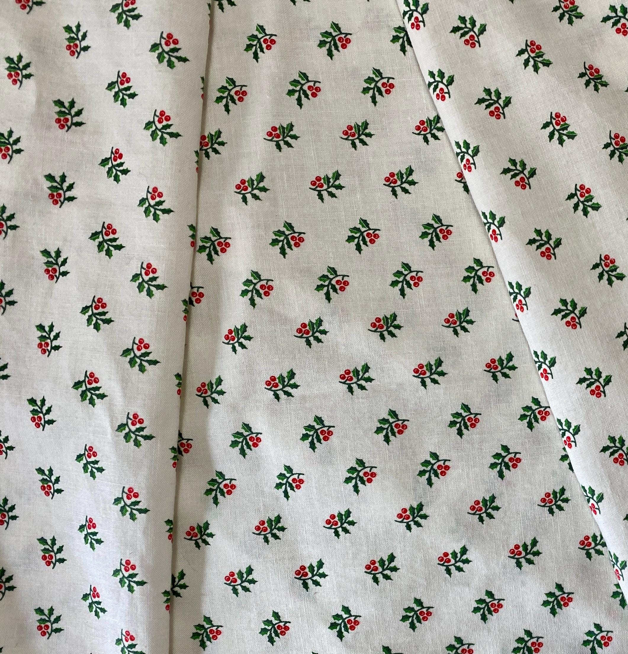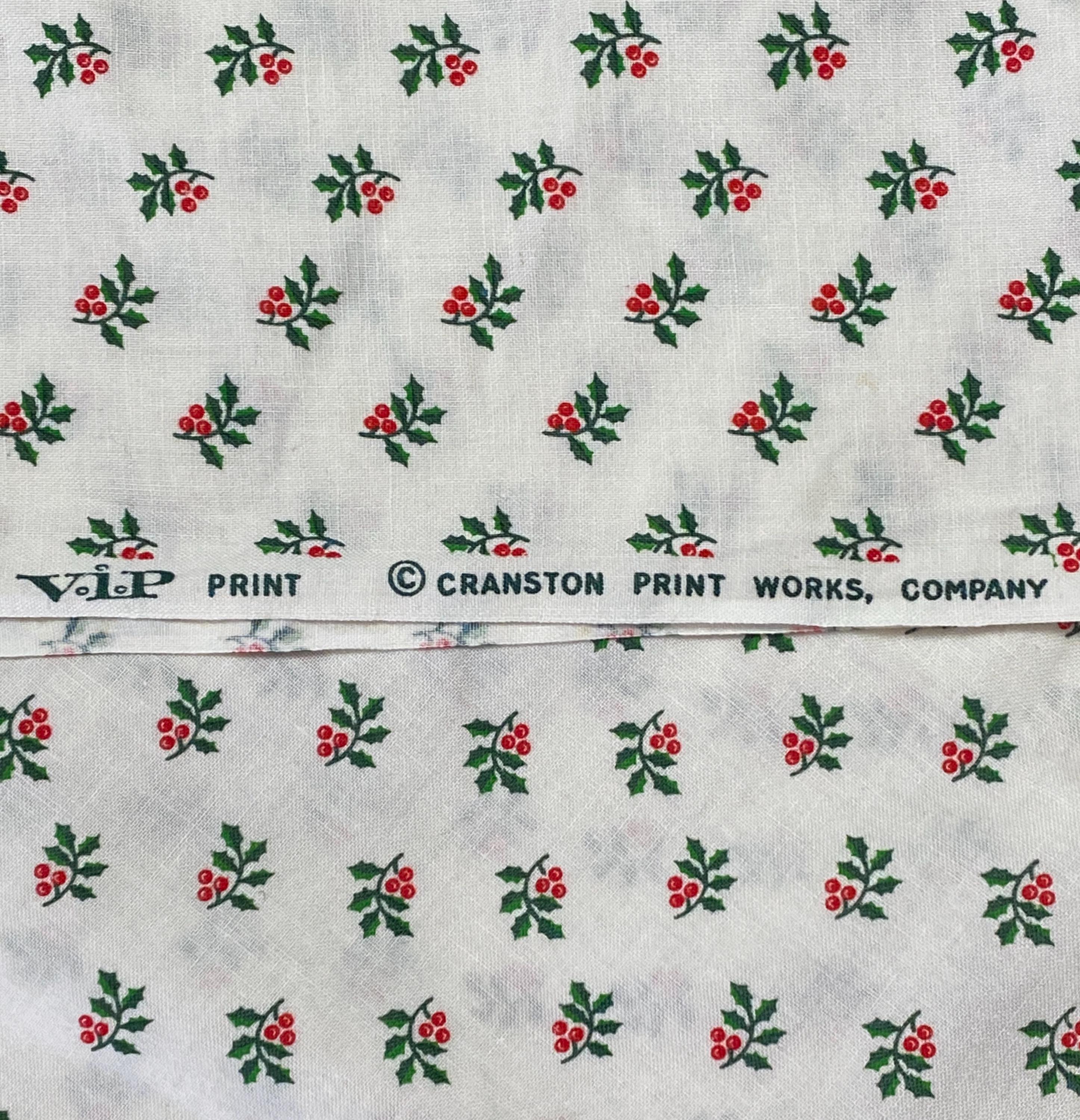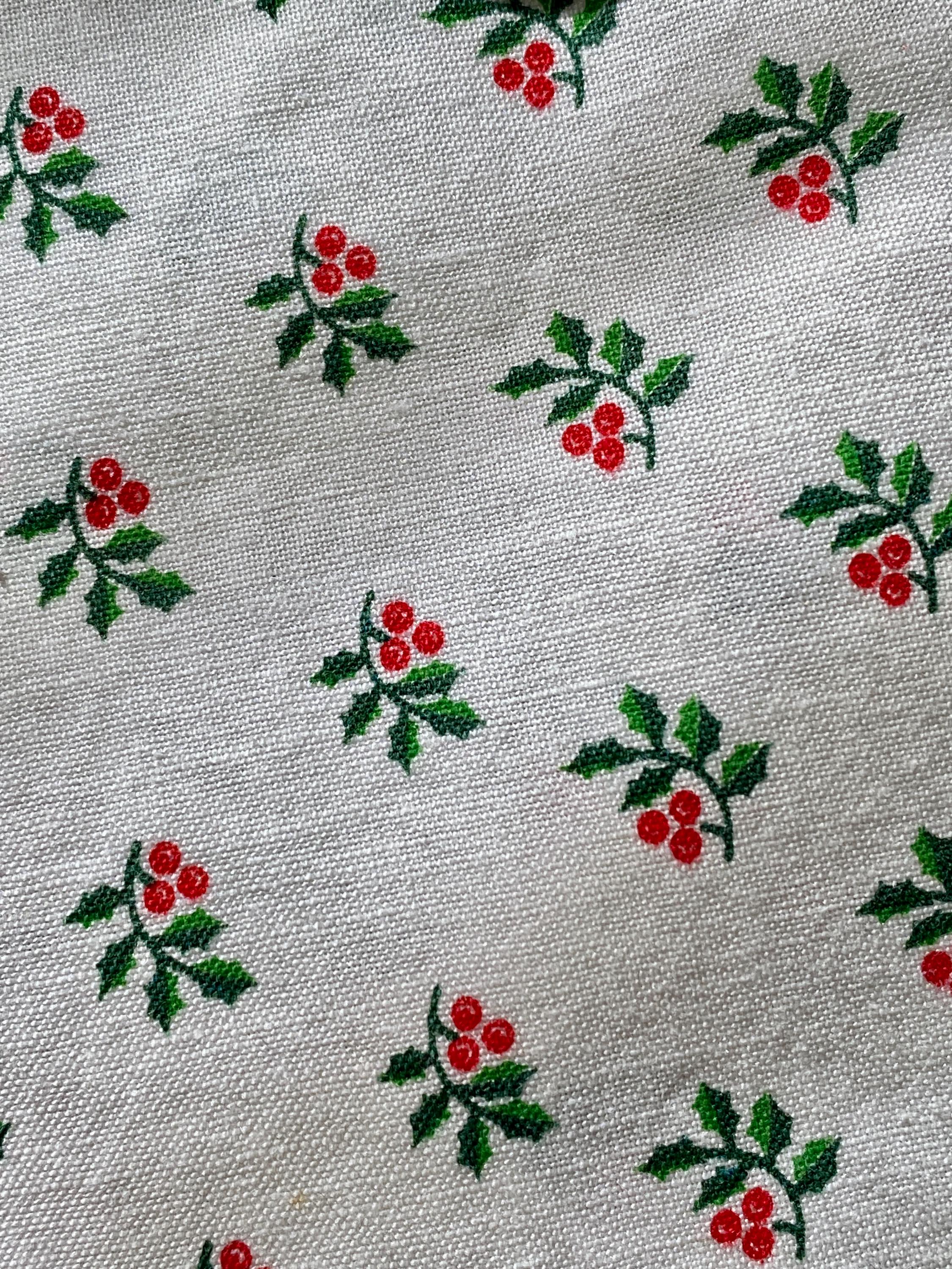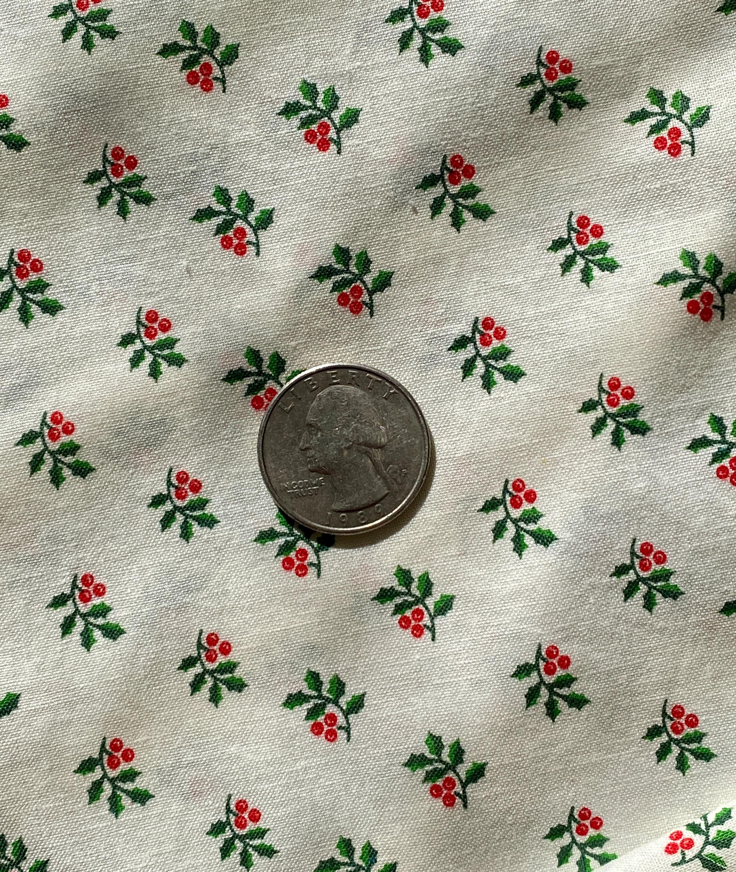 Sprigs of holly dot the creamy white background of this vintage fabric.