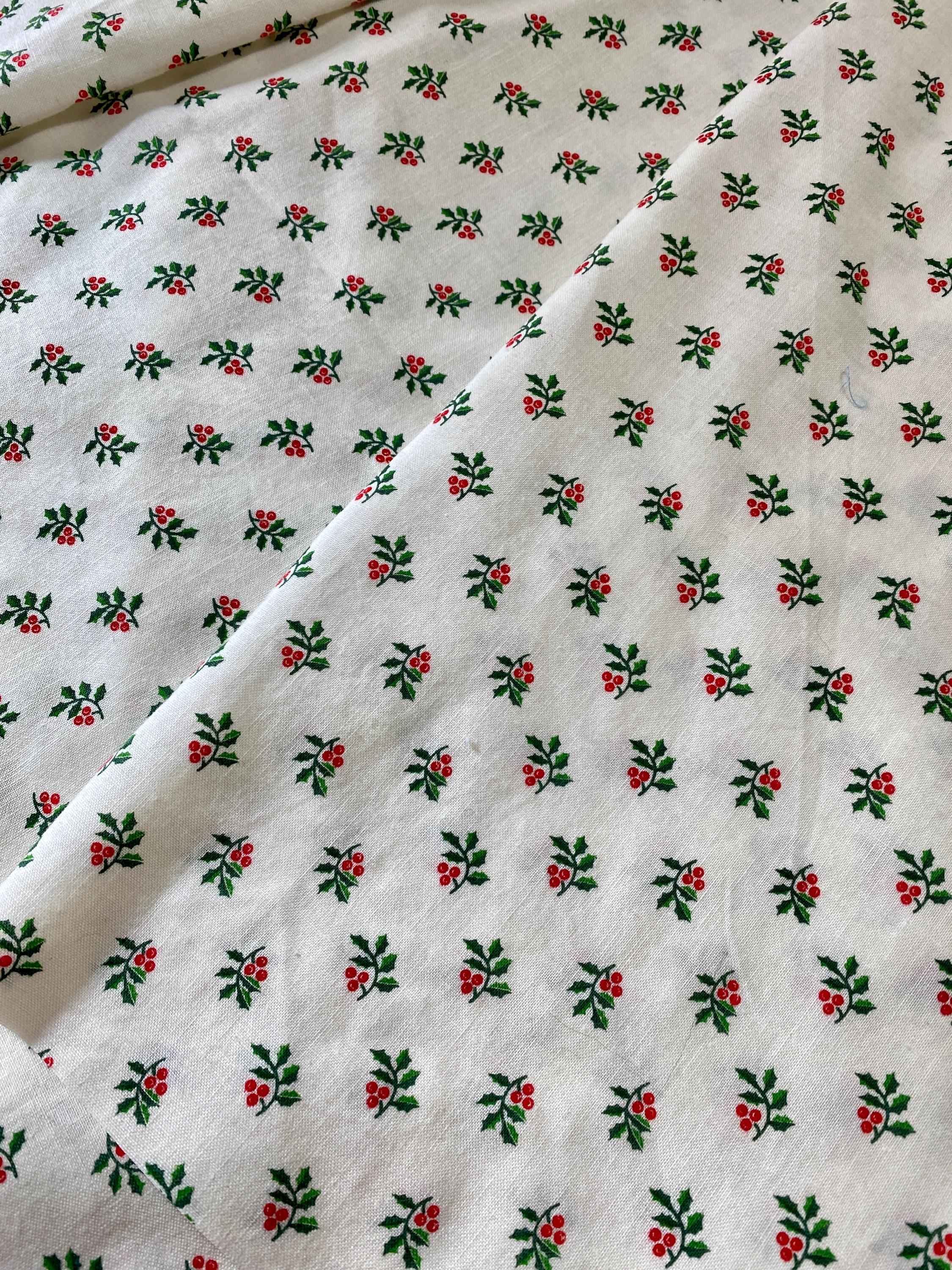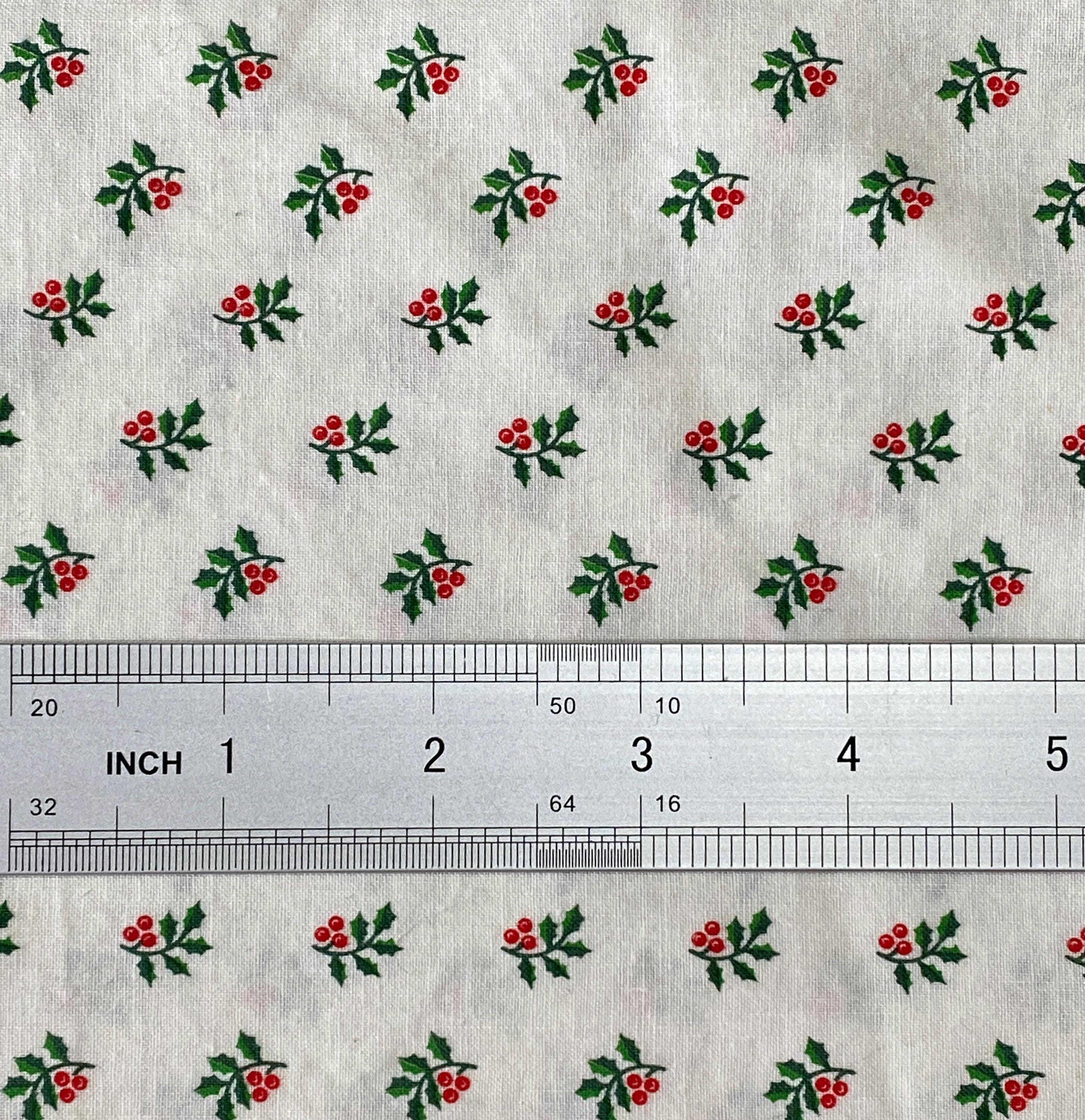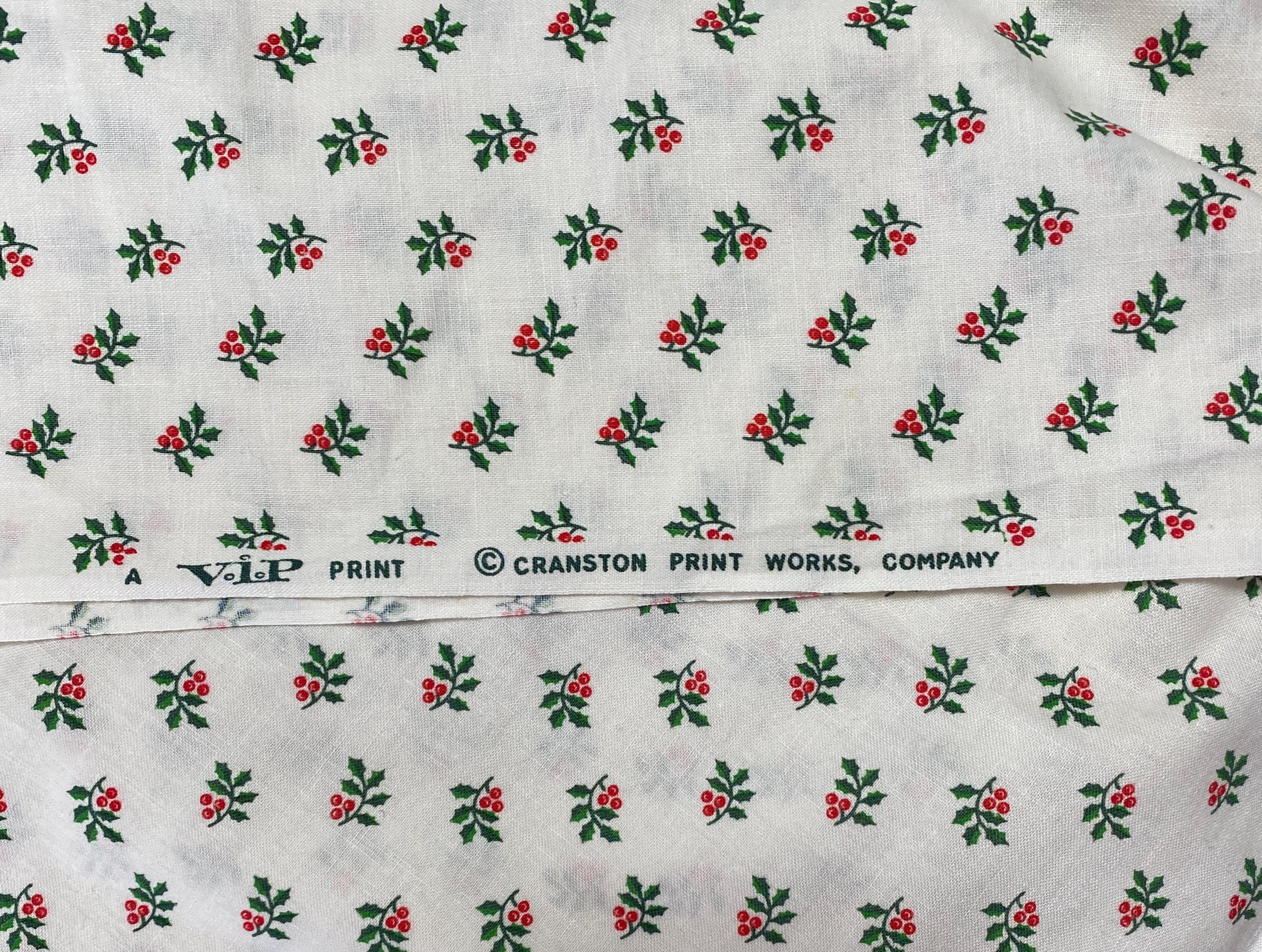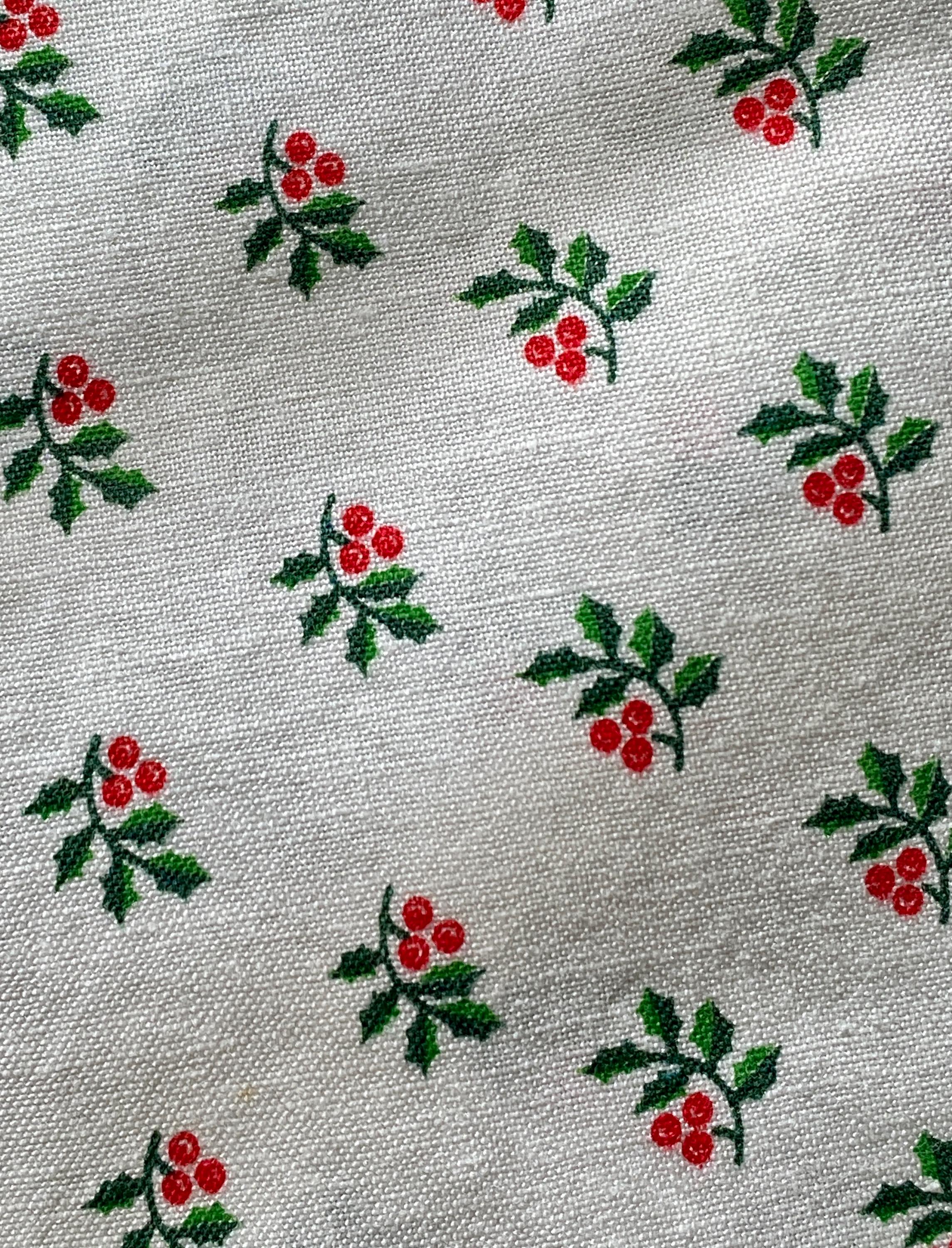 Sprigs of holly dot the creamy white background of this vintage fabric.