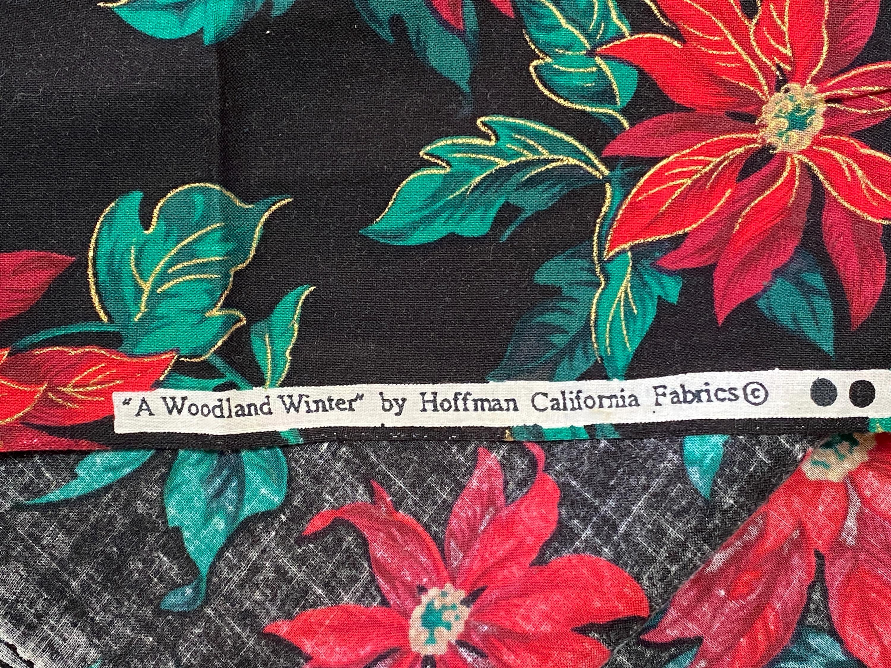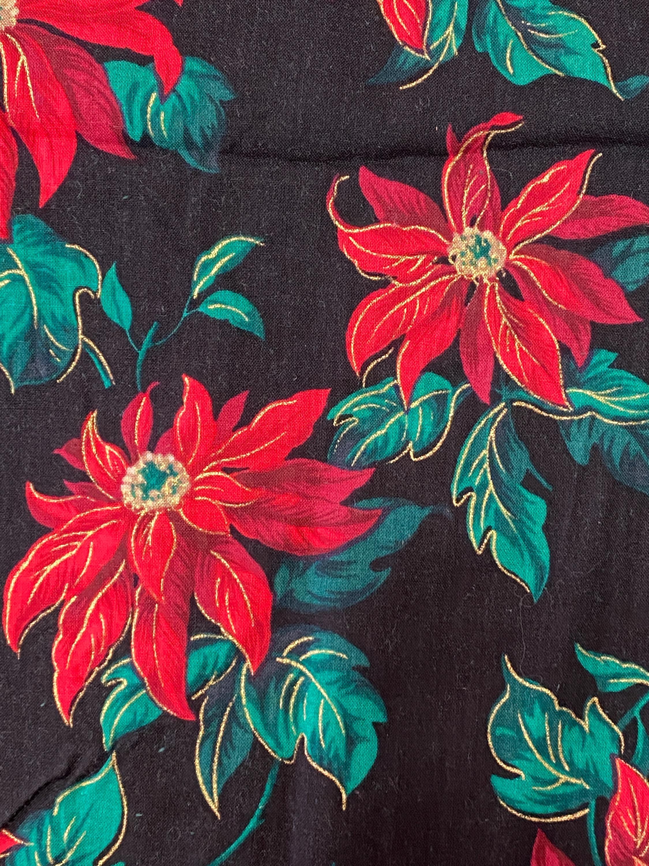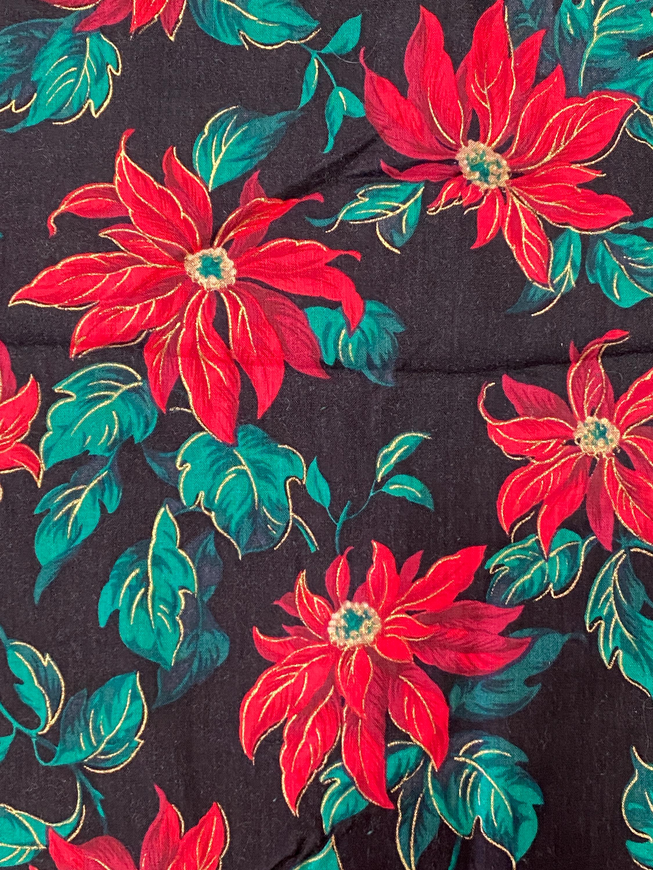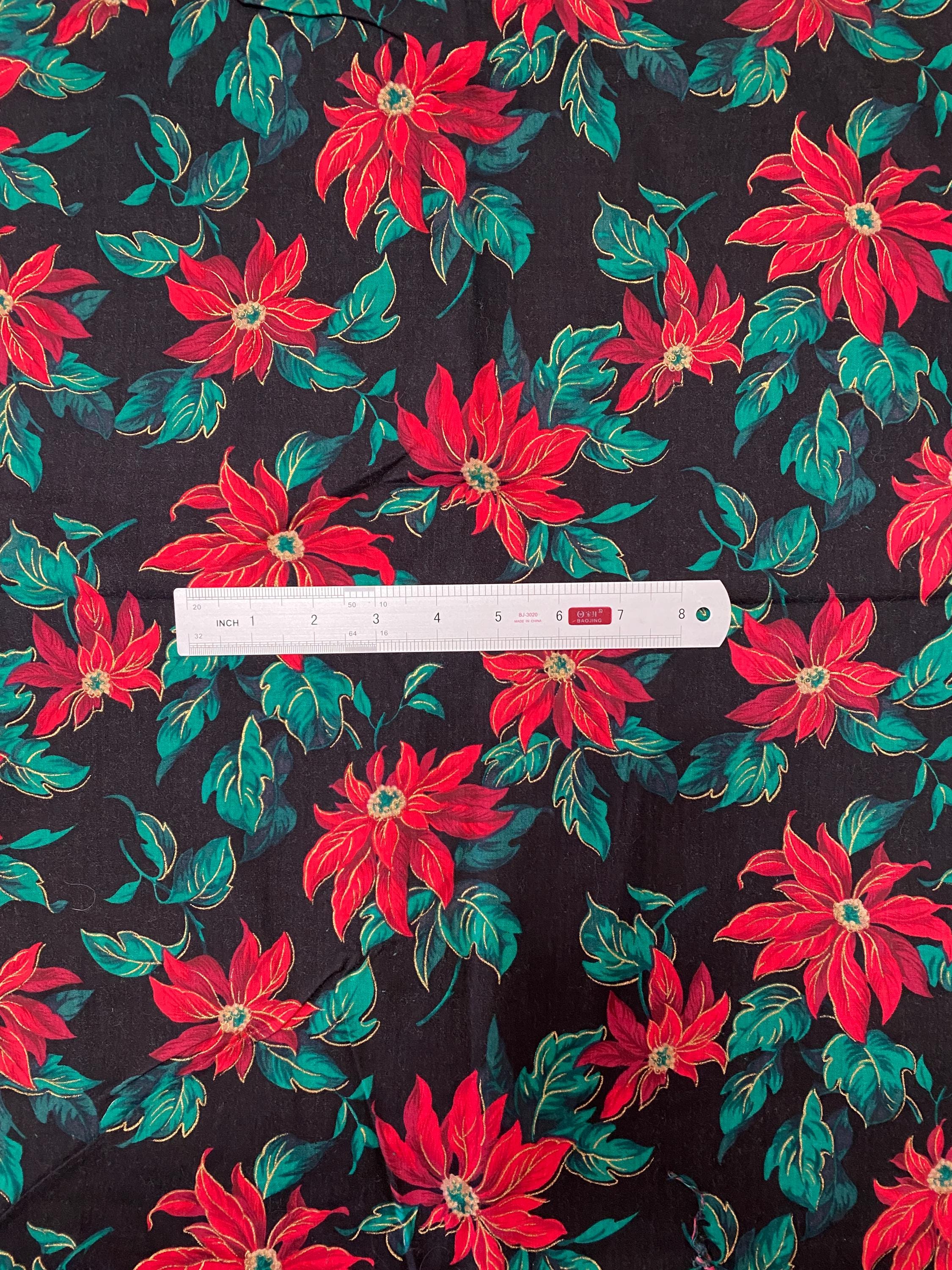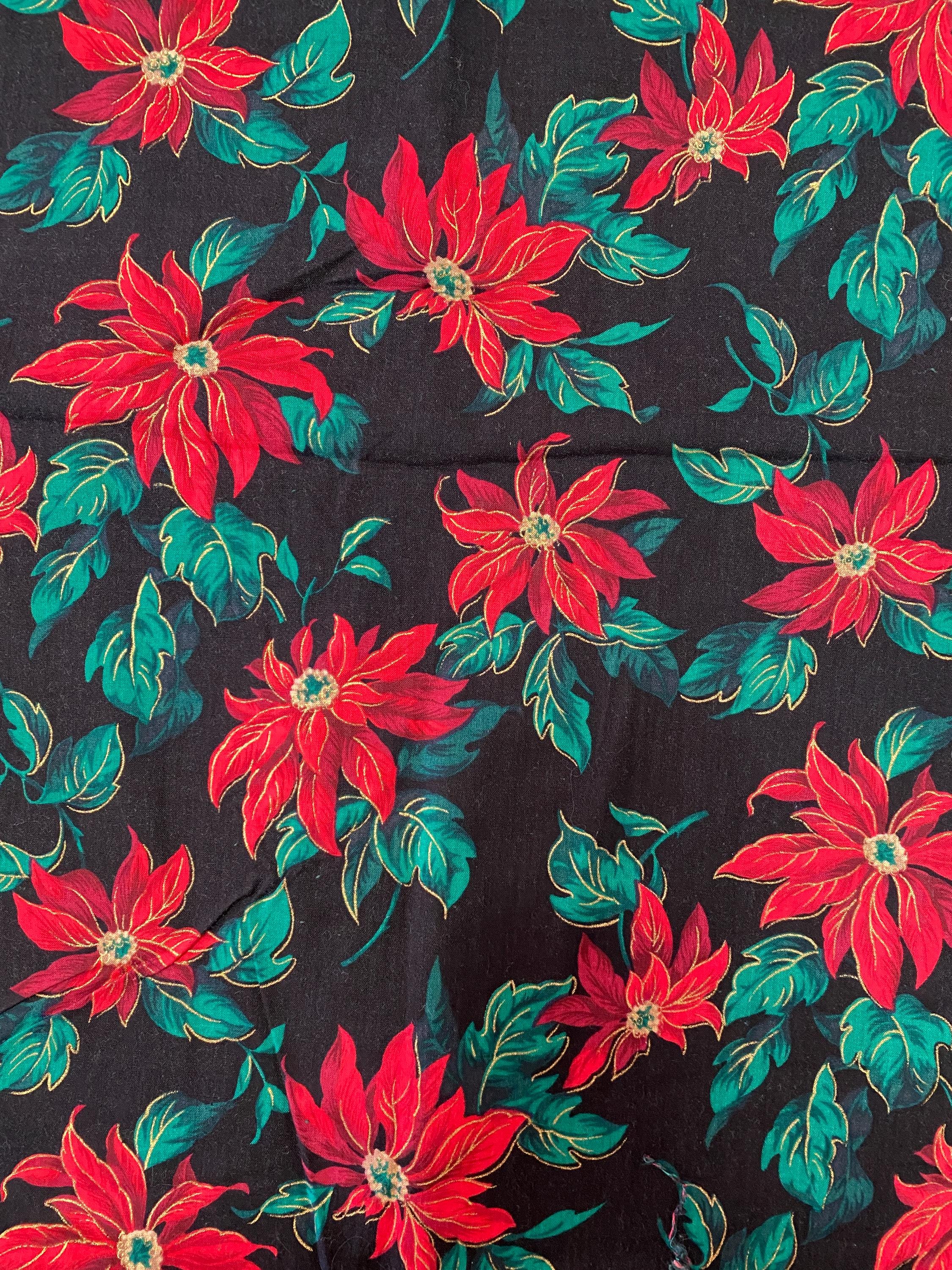 Interesting vintage Christmas poinsettia fabric with a black background. Gold metallic highlights. The poinsettias are red with purple shading & gold highlights.