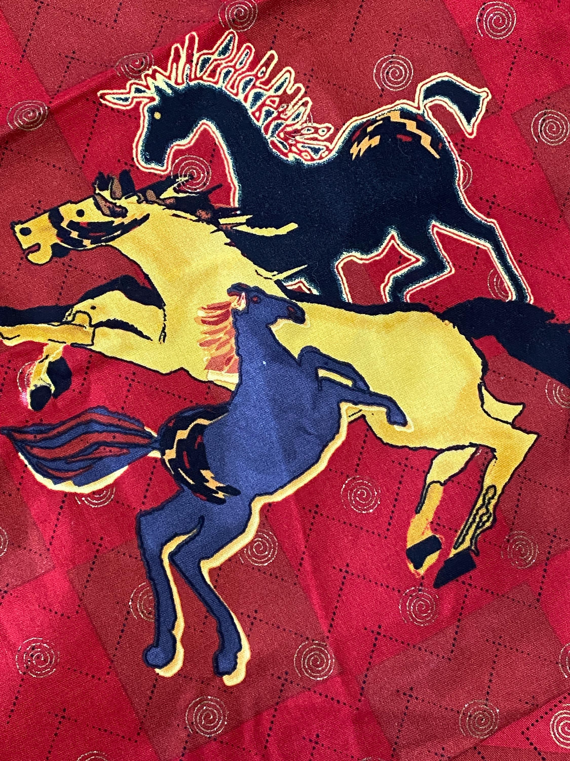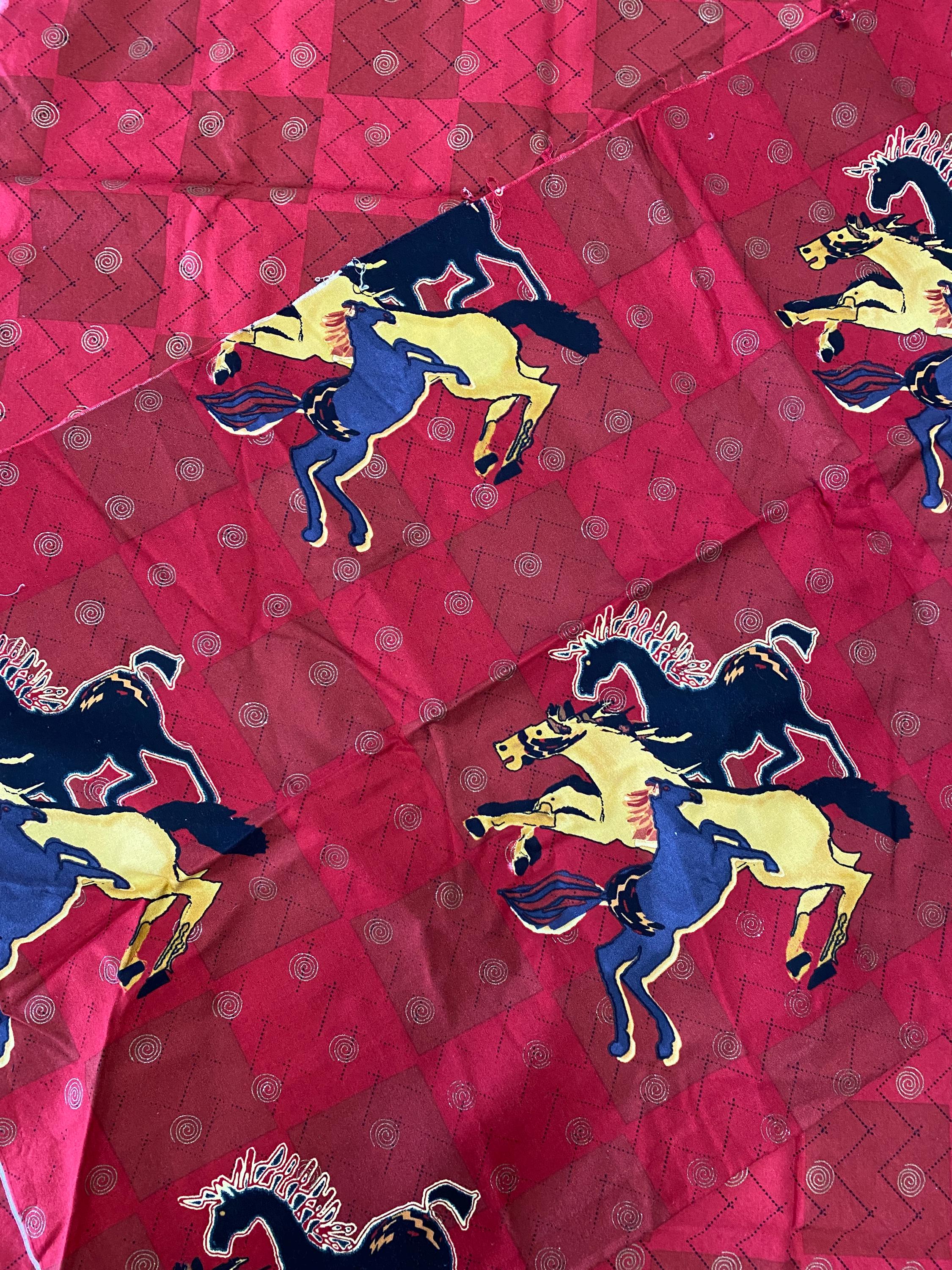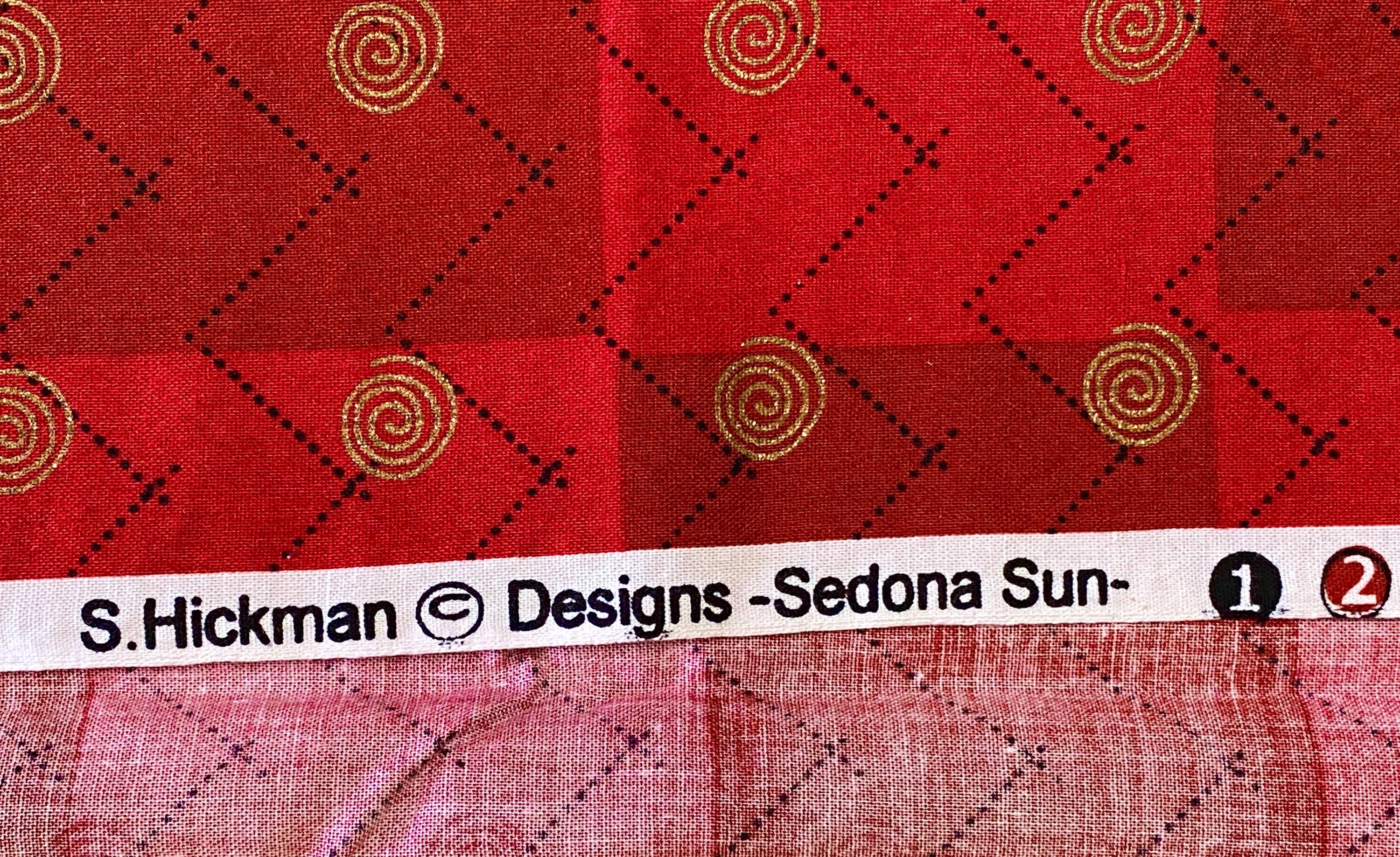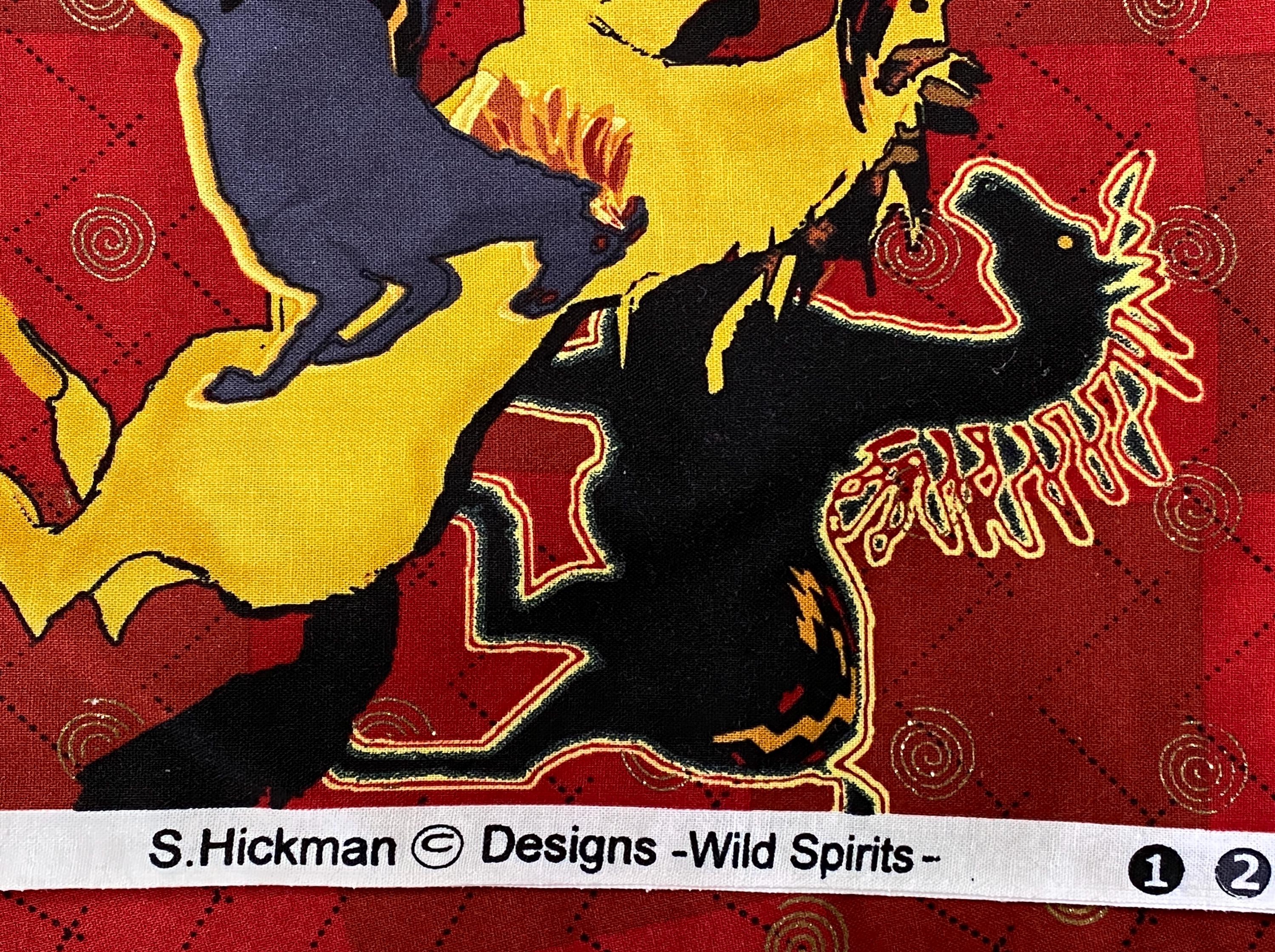 These fabrics draw you in. Wild Spirits & Sedona have the same background motif; two shades of red squares overlaid with black zigzag dots and metallic gold spirals. Wild Spirits also has three wild mustang horses, rearing and racing across the background.