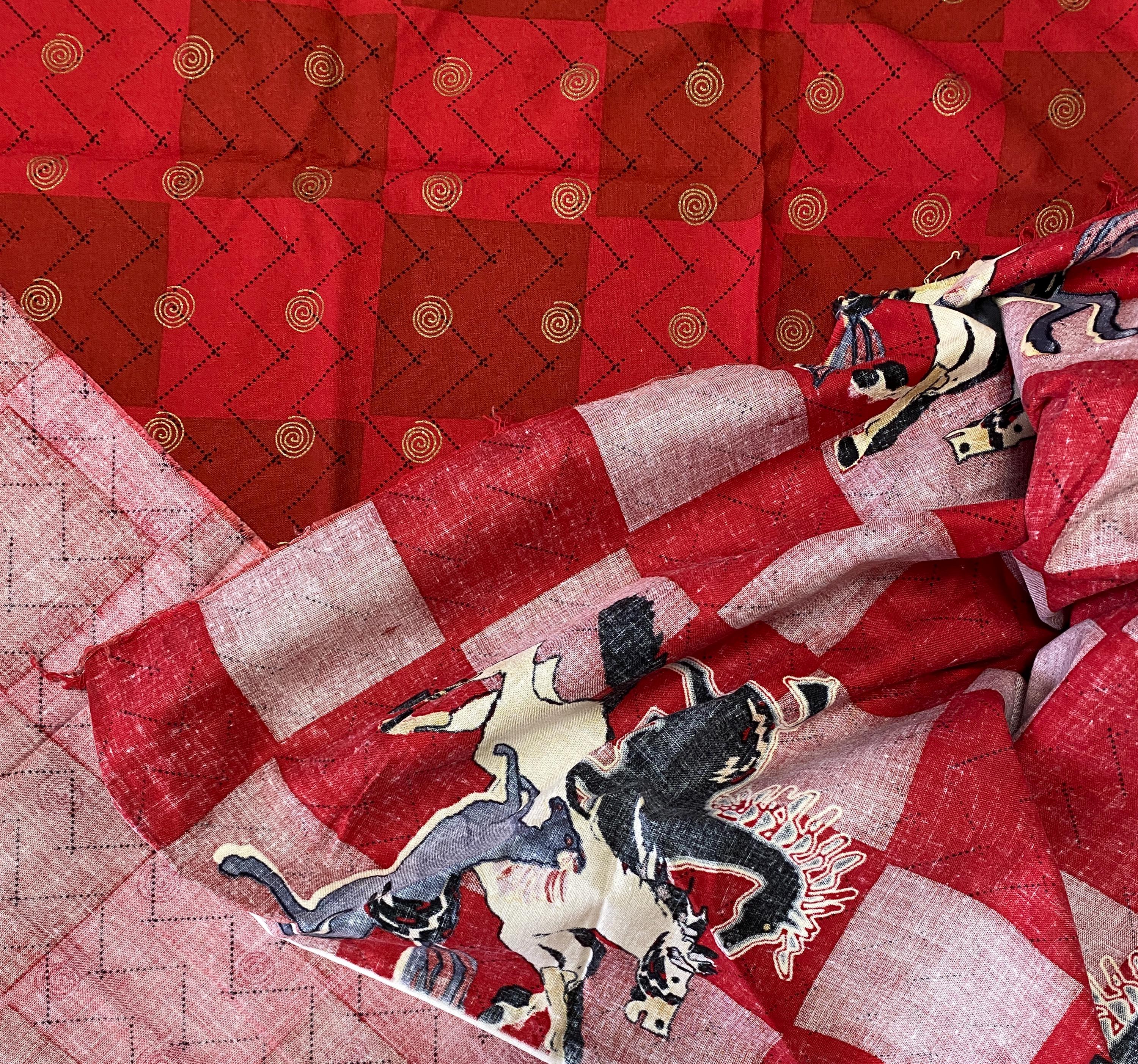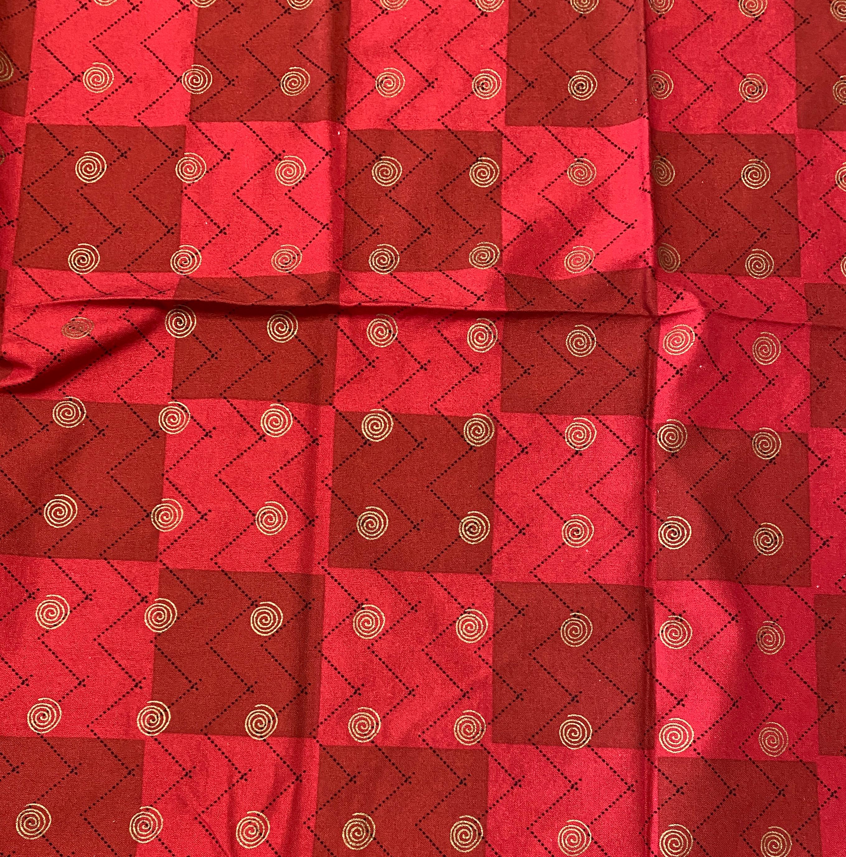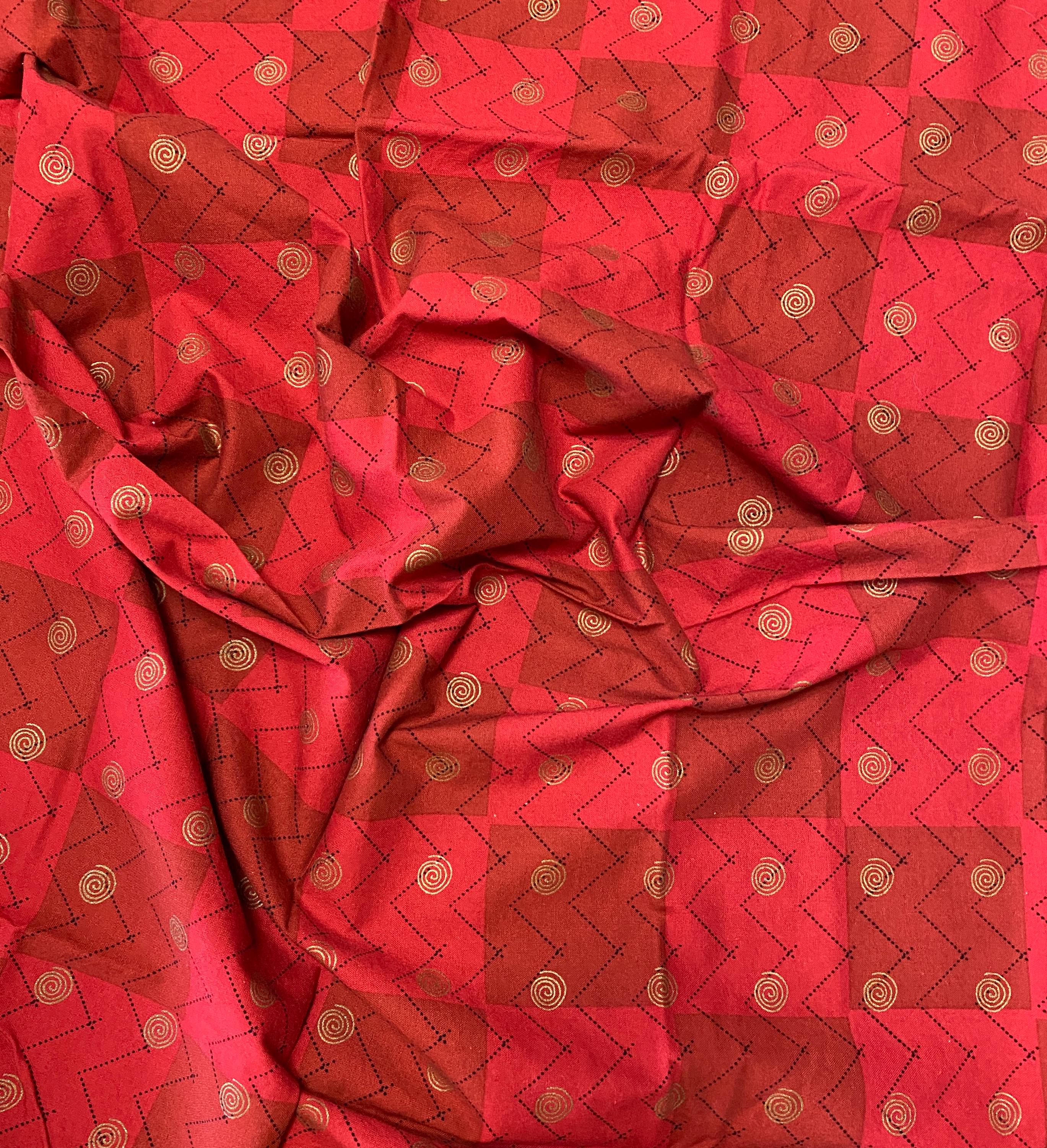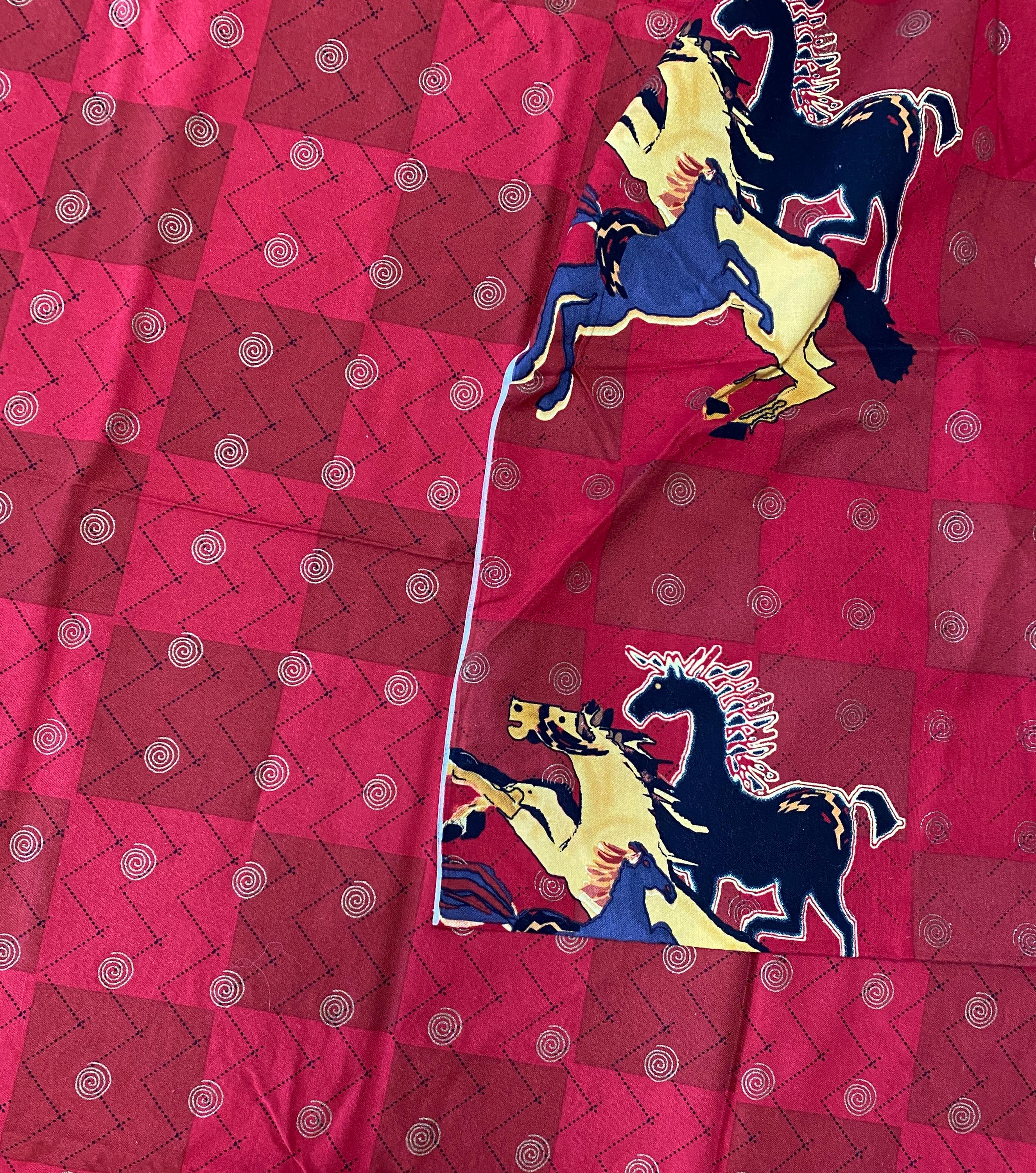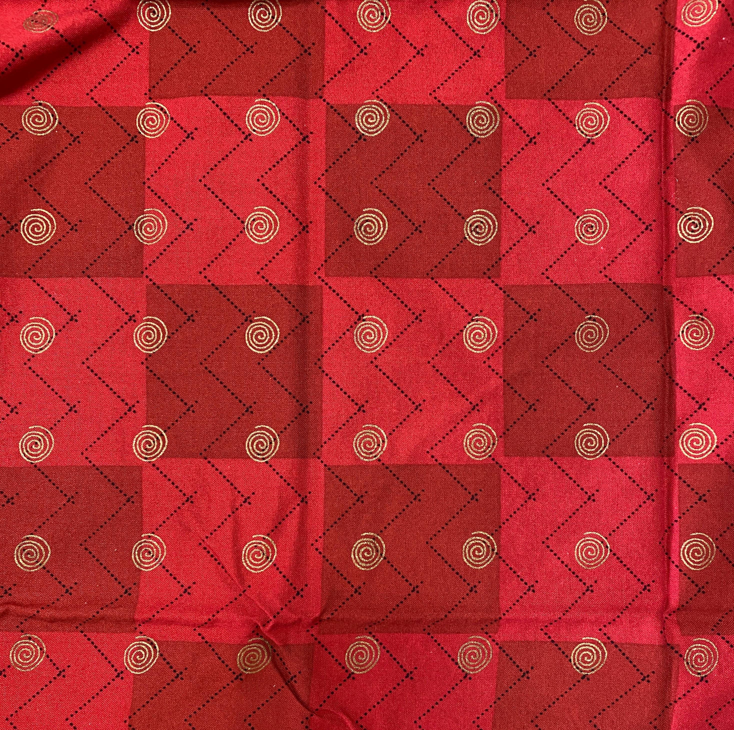 These fabrics draw you in. Wild Spirits & Sedona have the same background motif; two shades of red squares overlaid with black zigzag dots and metallic gold spirals. Wild Spirits also has three wild mustang horses, rearing and racing across the background.