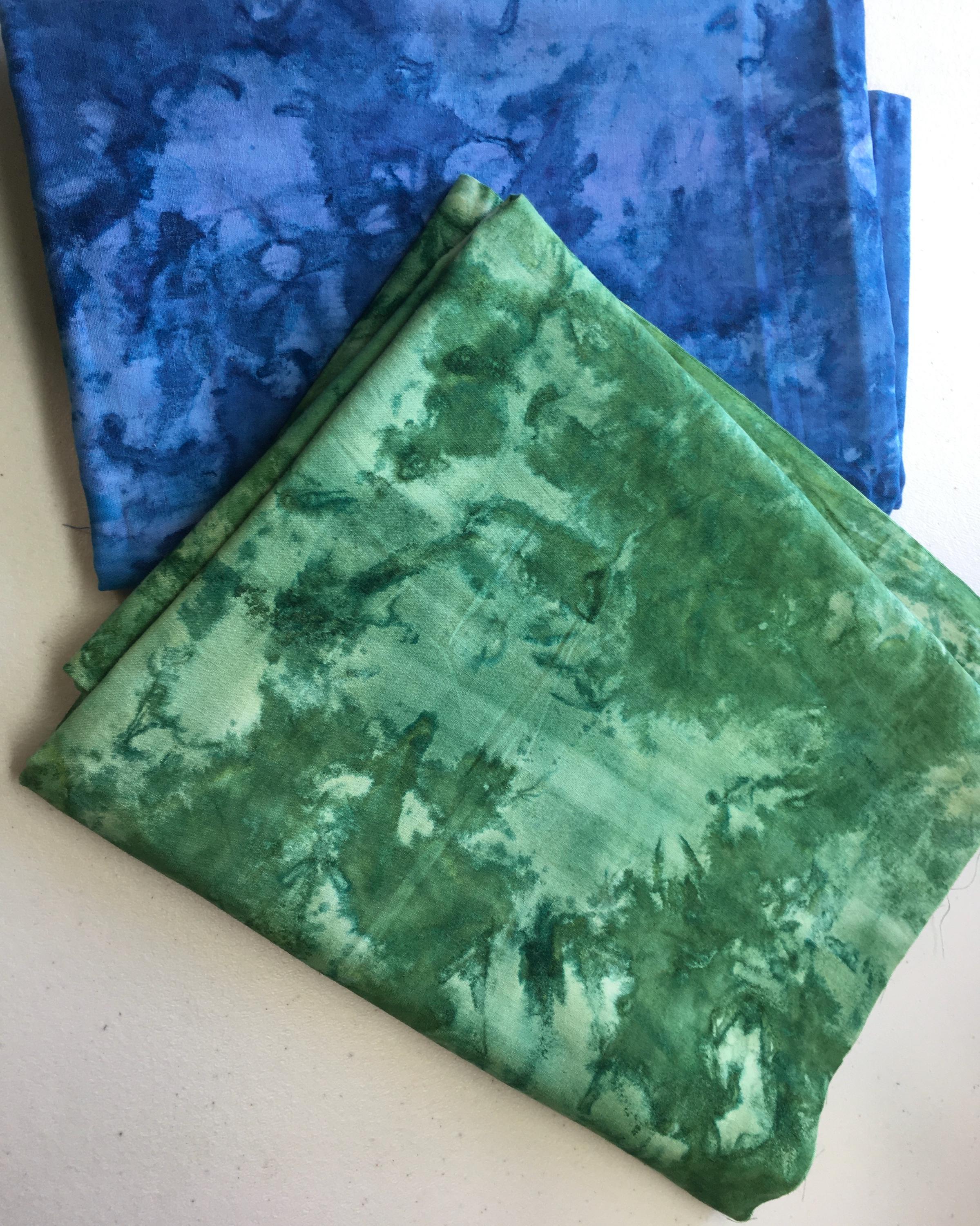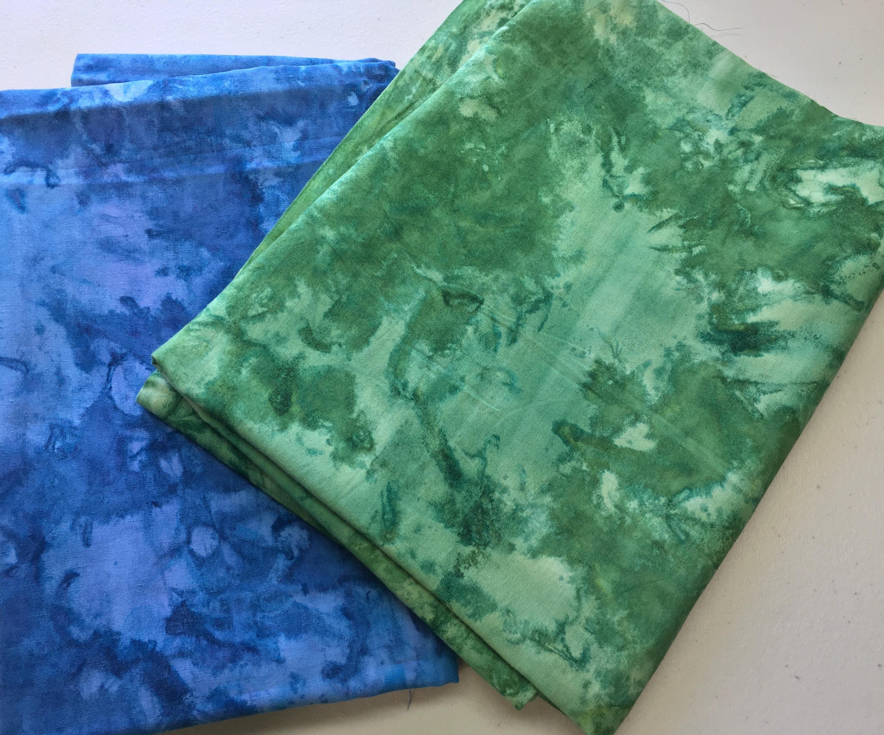 Batik fabrics, each 46" wide & one yard long; very nice cotton, unwashed, good hand. Available in 2 different colors; greens and blues. Choose which color you want, or choose both.
