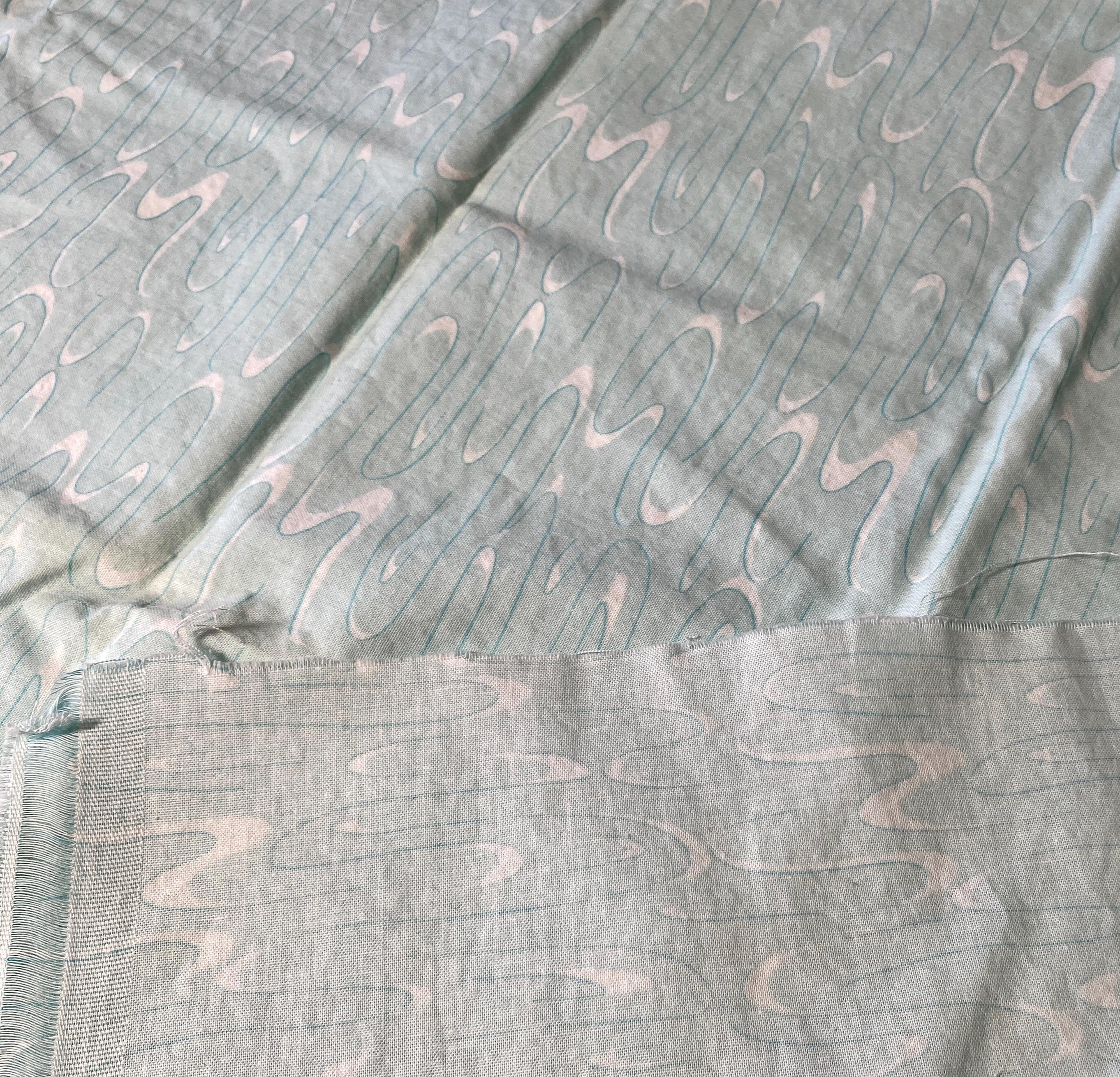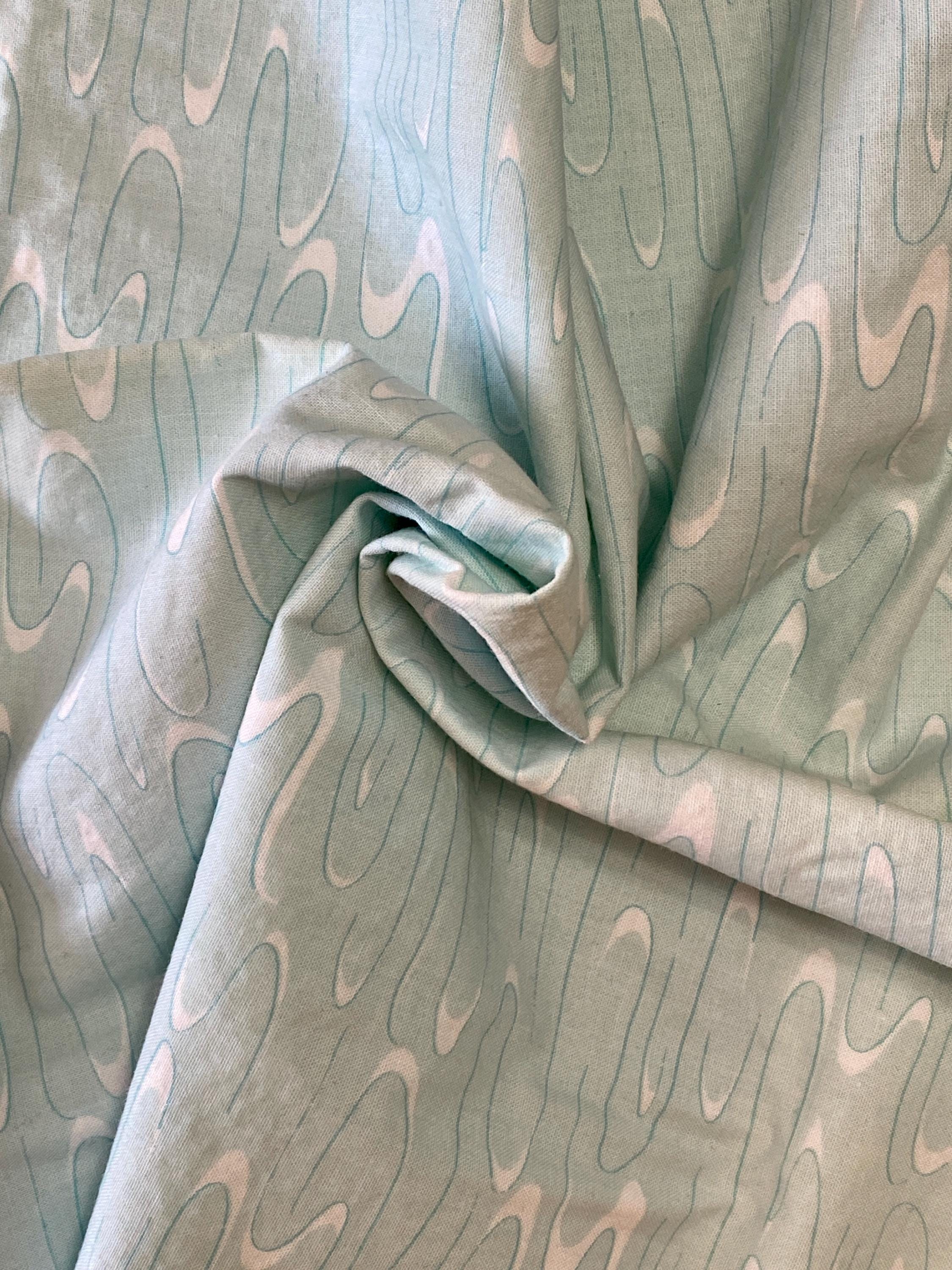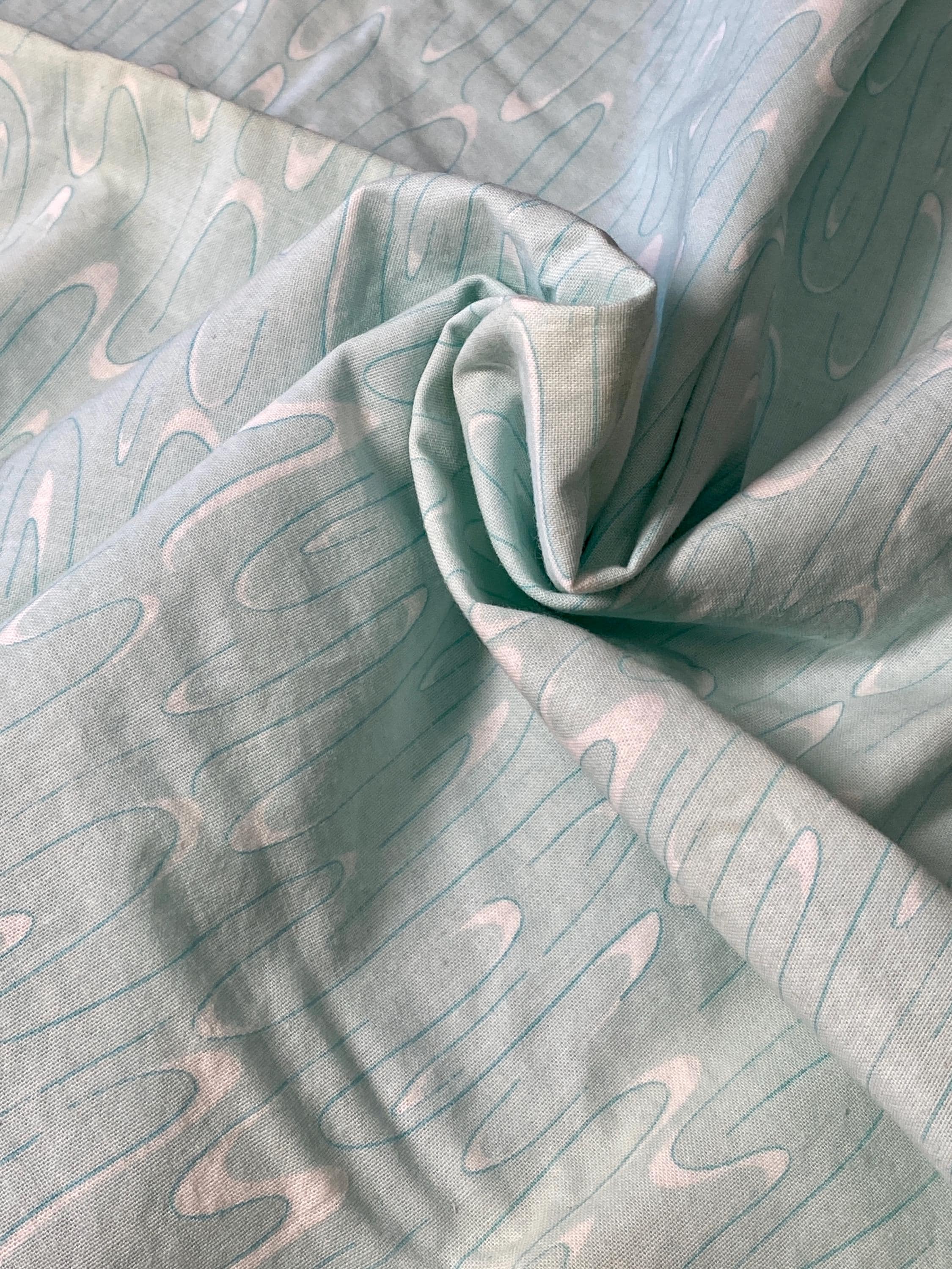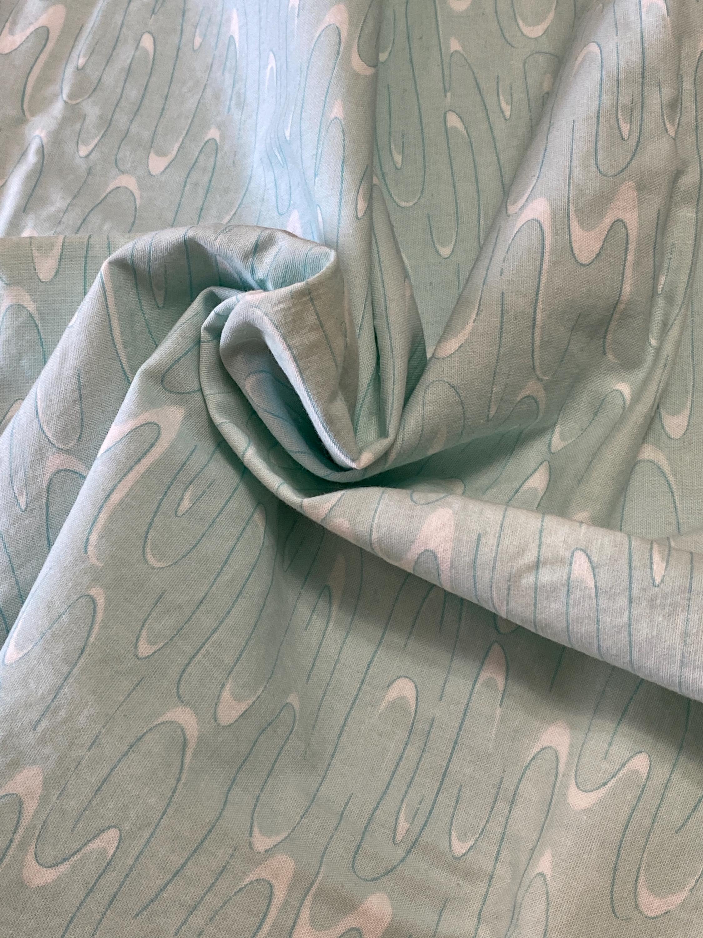 It is made of 100% Super Combed Cotton grown in the USA. It was designed for Connecting Threads by Melissa Burt in 2010. A light, icy mint green with swirls of white.