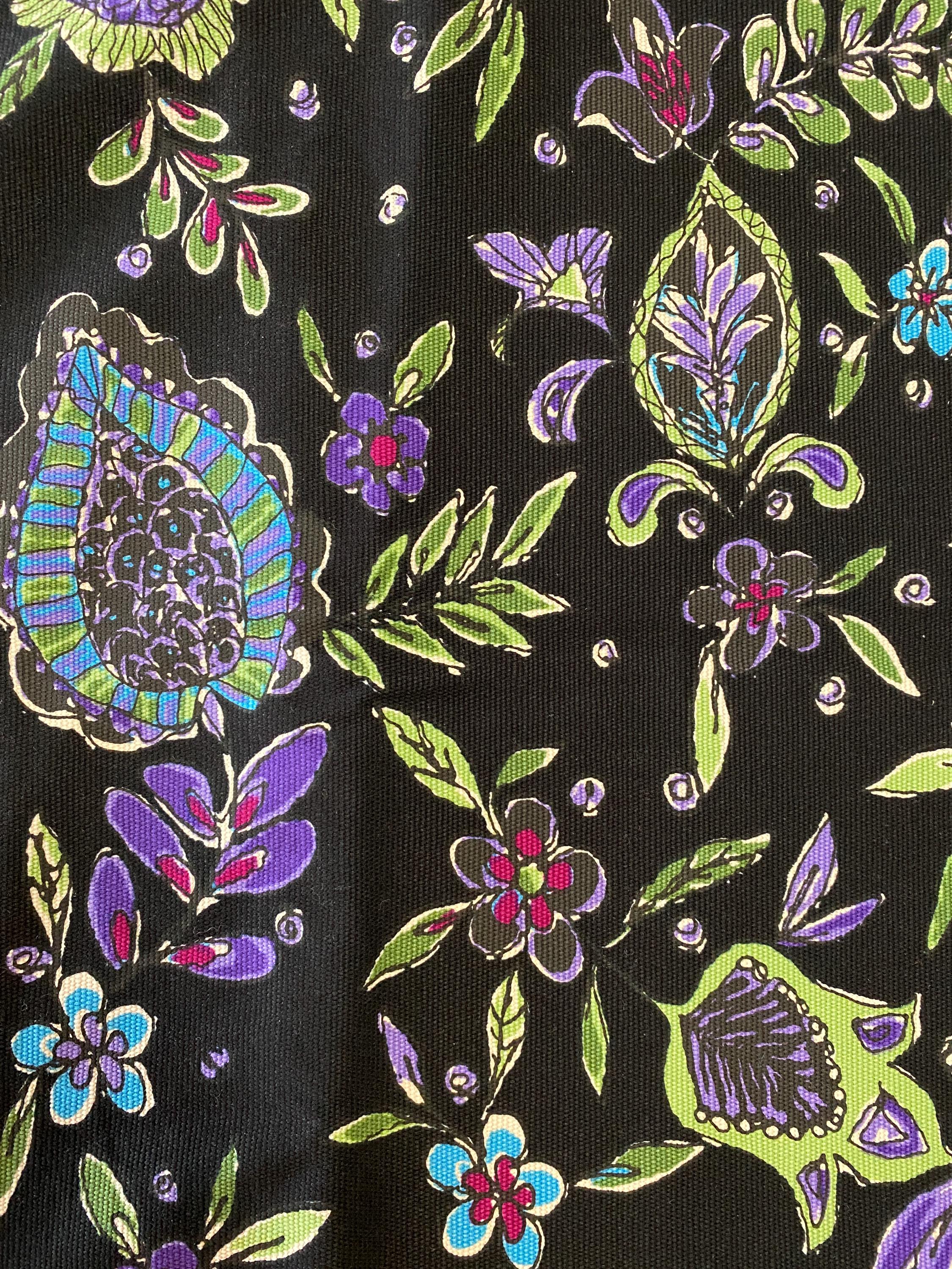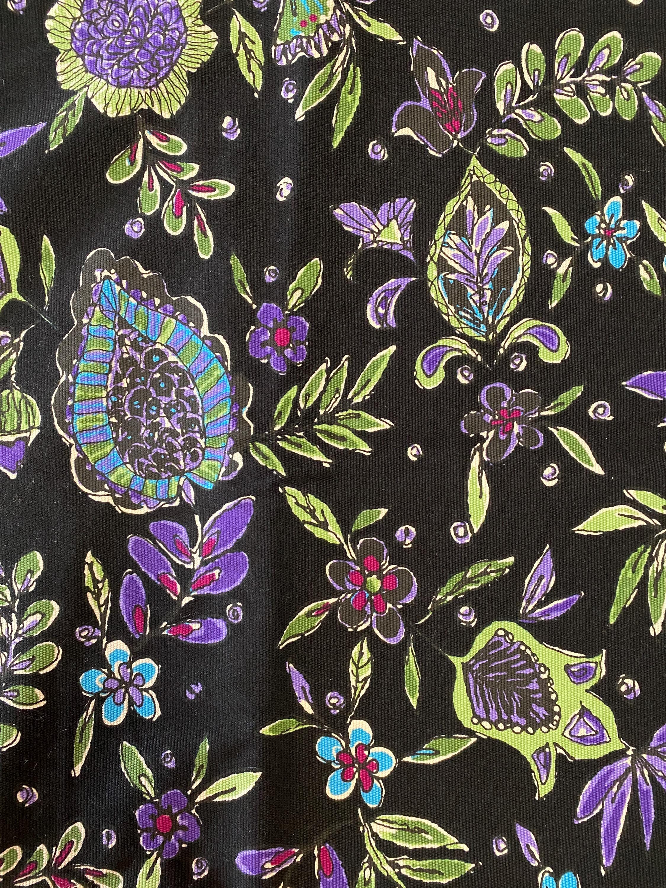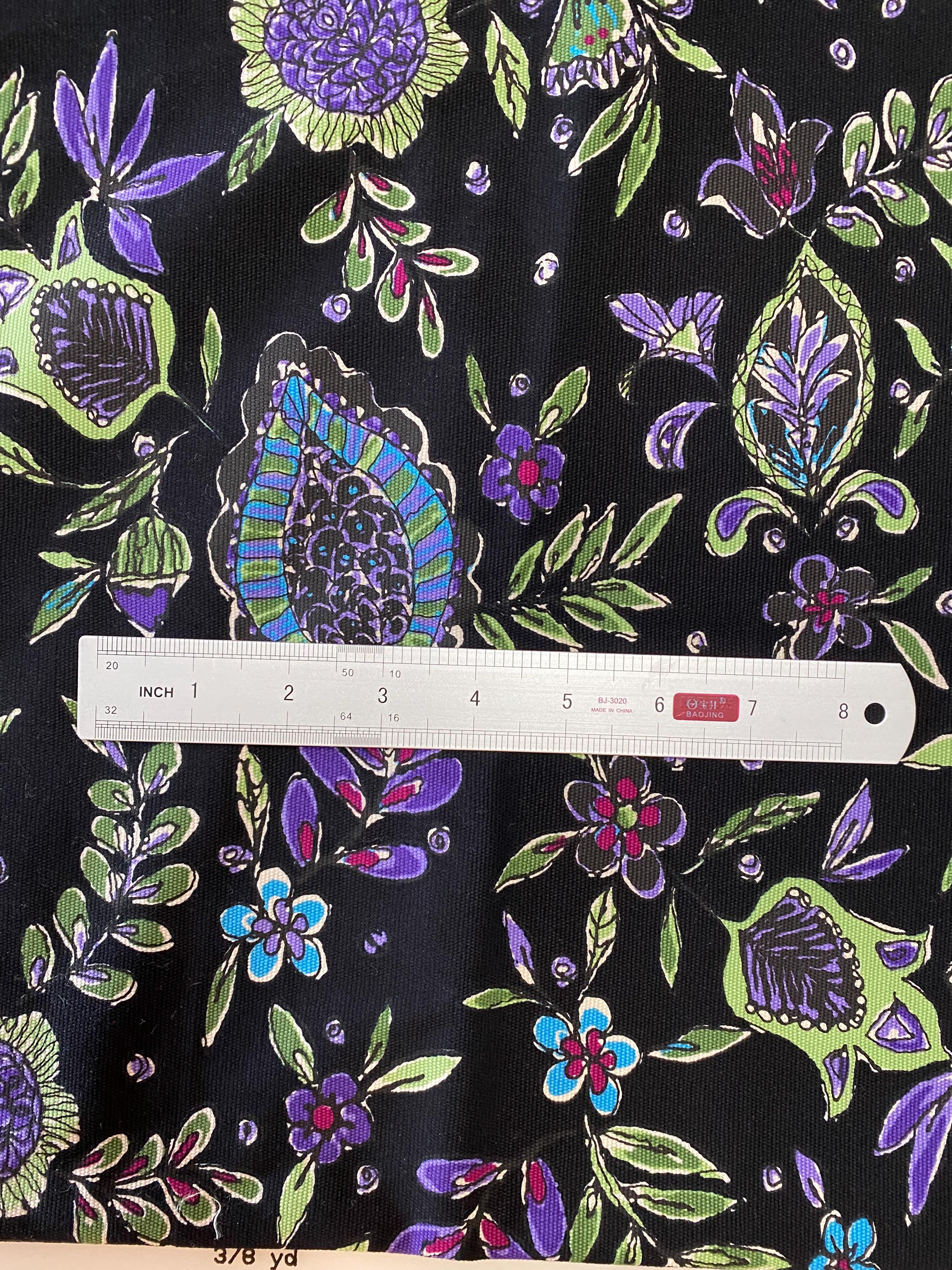It is 56" wide by 3/8 yards (13.5") long. A retro floral design in purples, greens, blues and cranberry on a black background.
