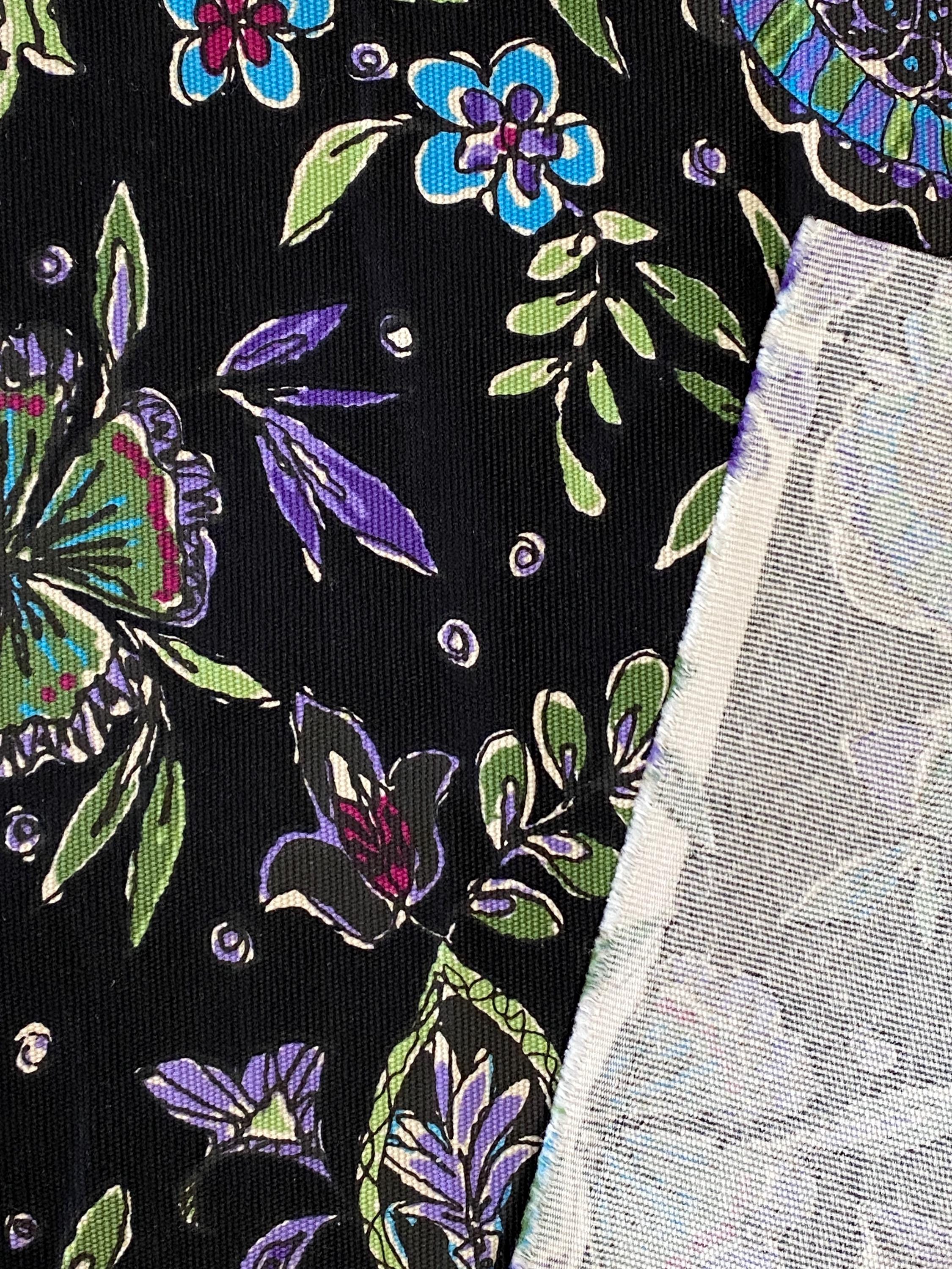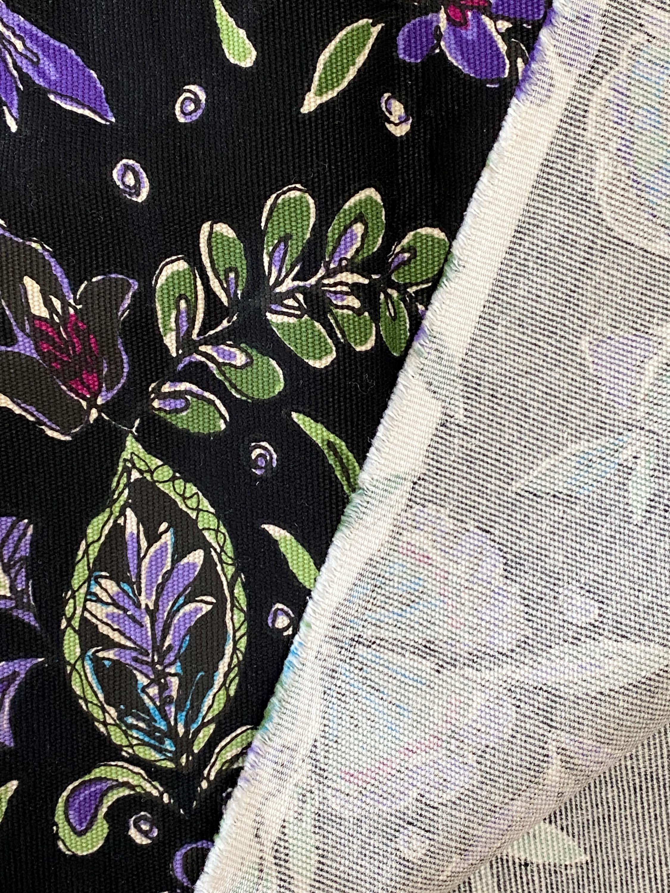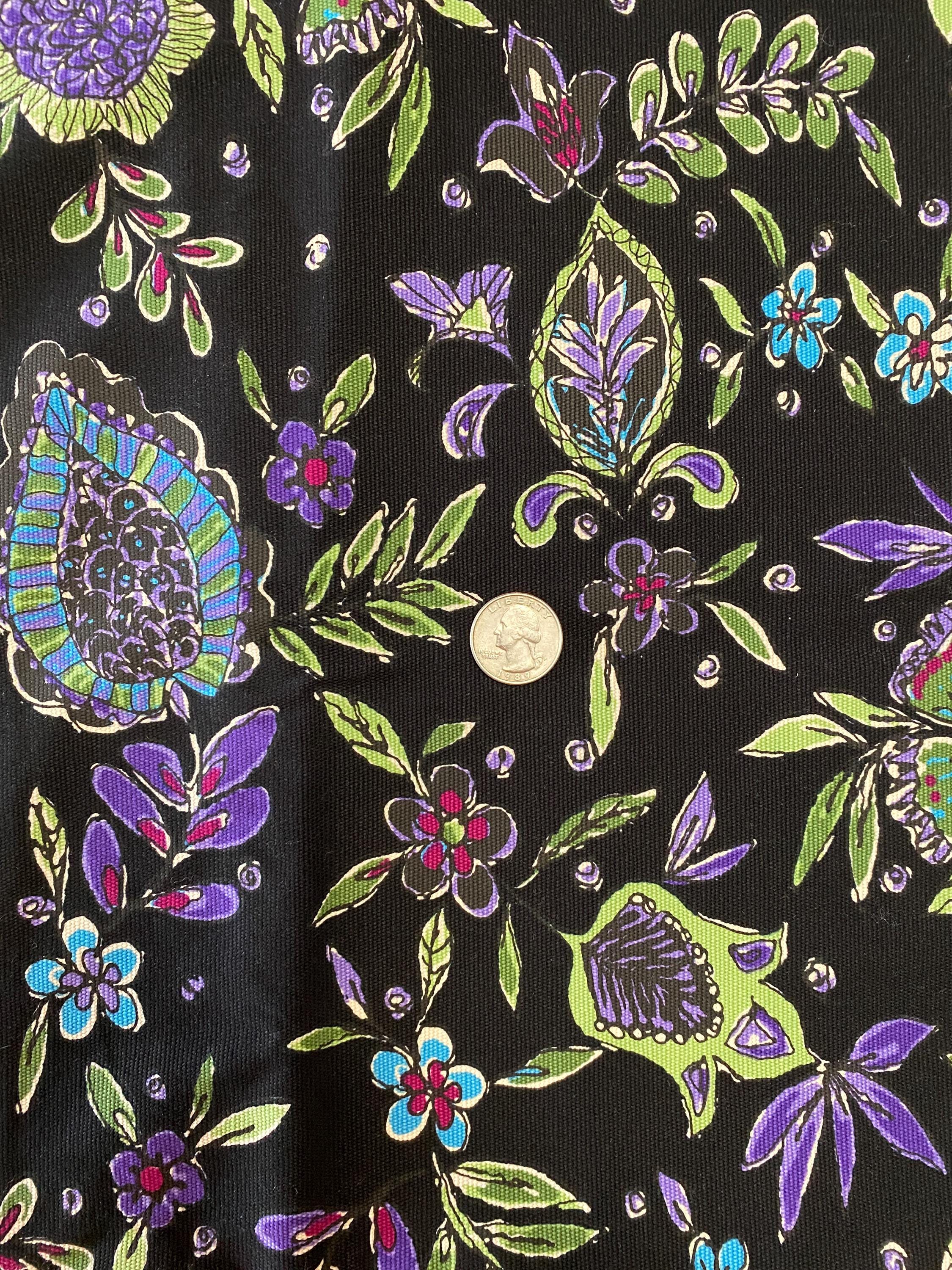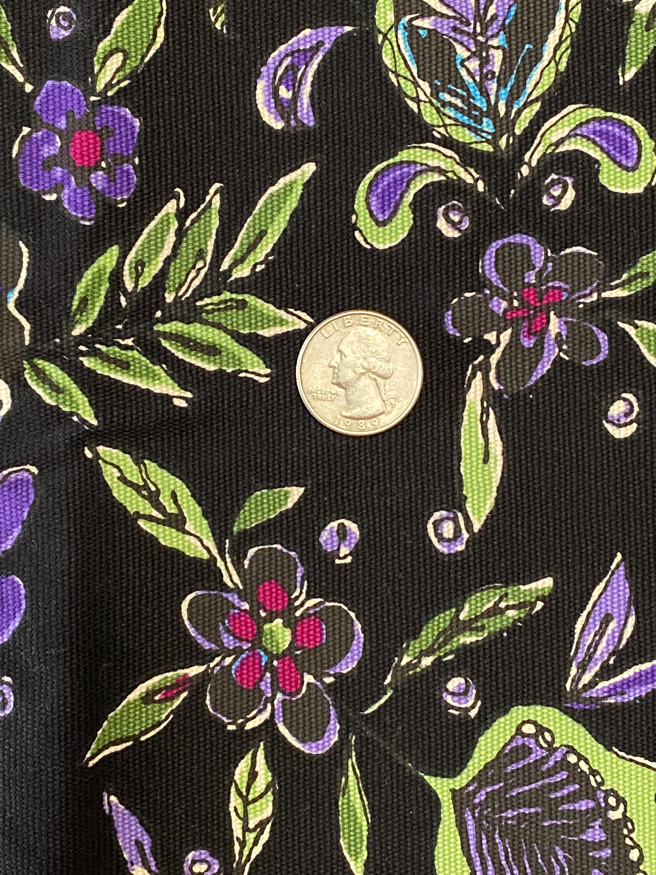 It is 56" wide by 3/8 yards (13.5") long. A retro floral design in purples, greens, blues and cranberry on a black background.