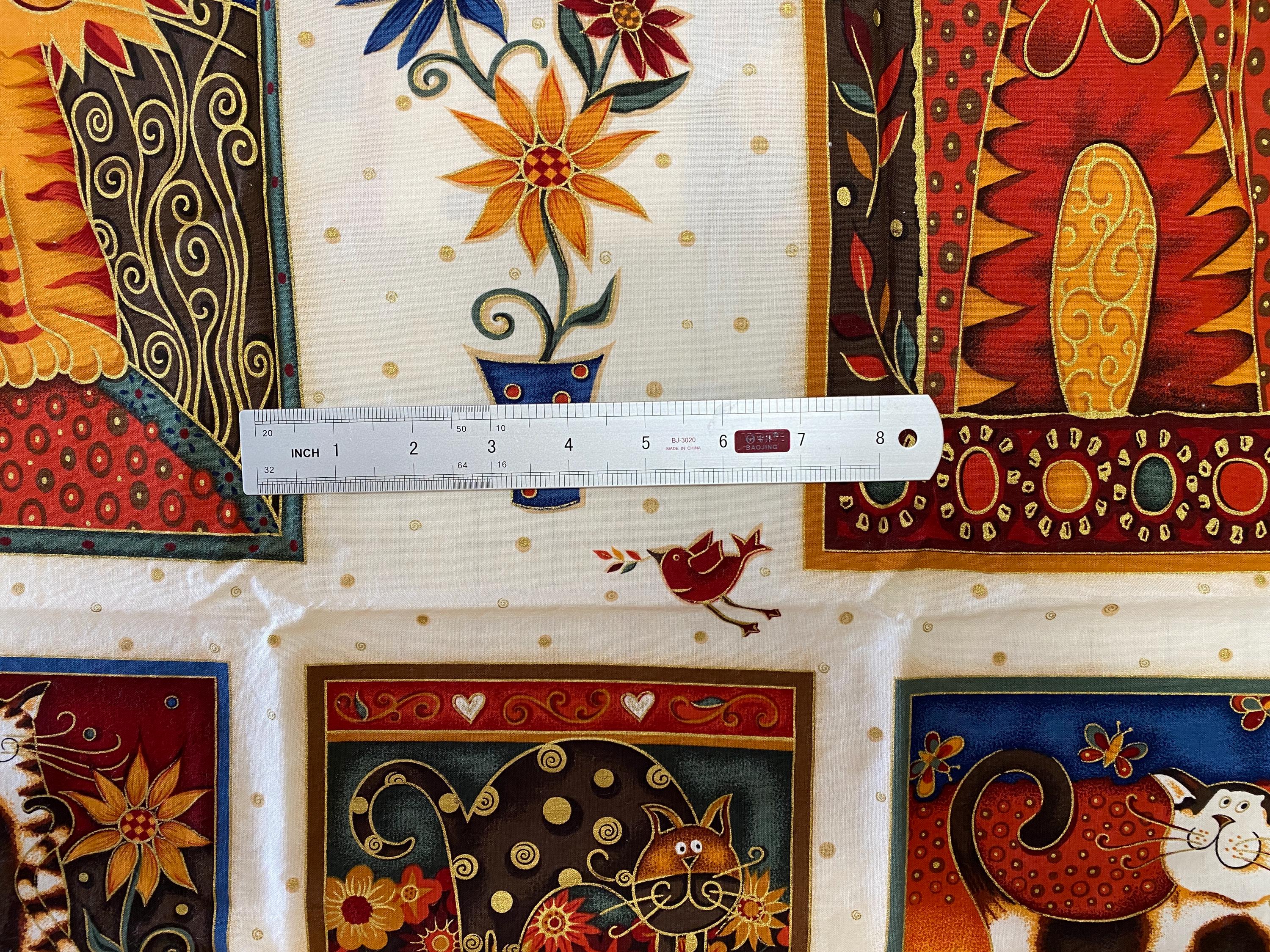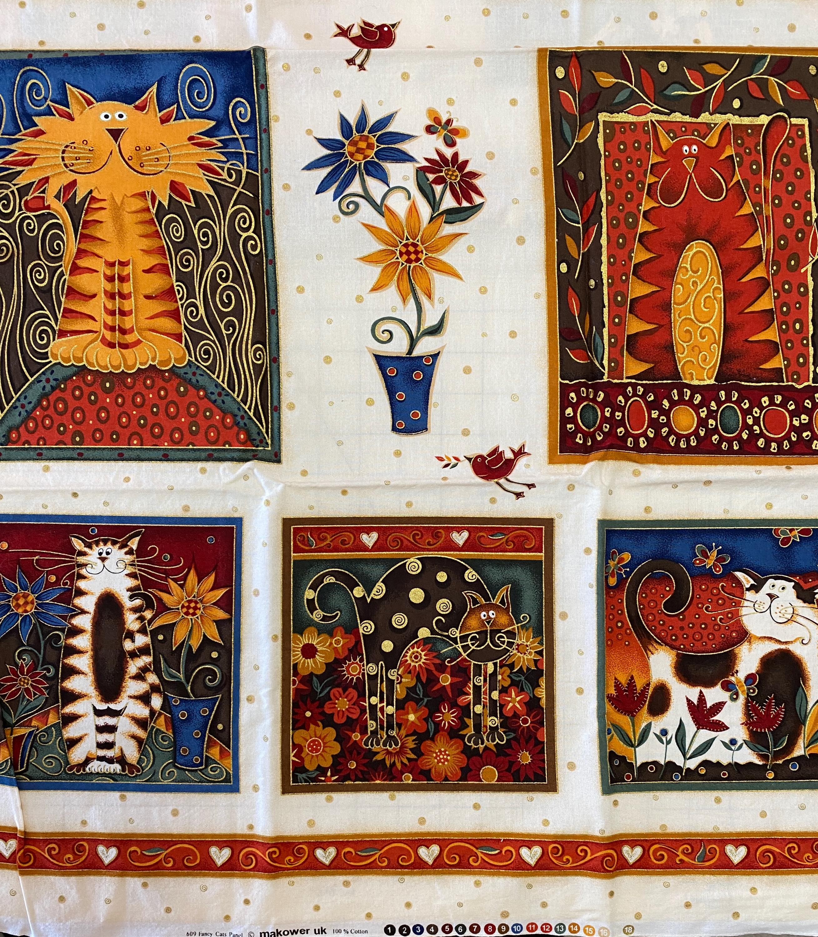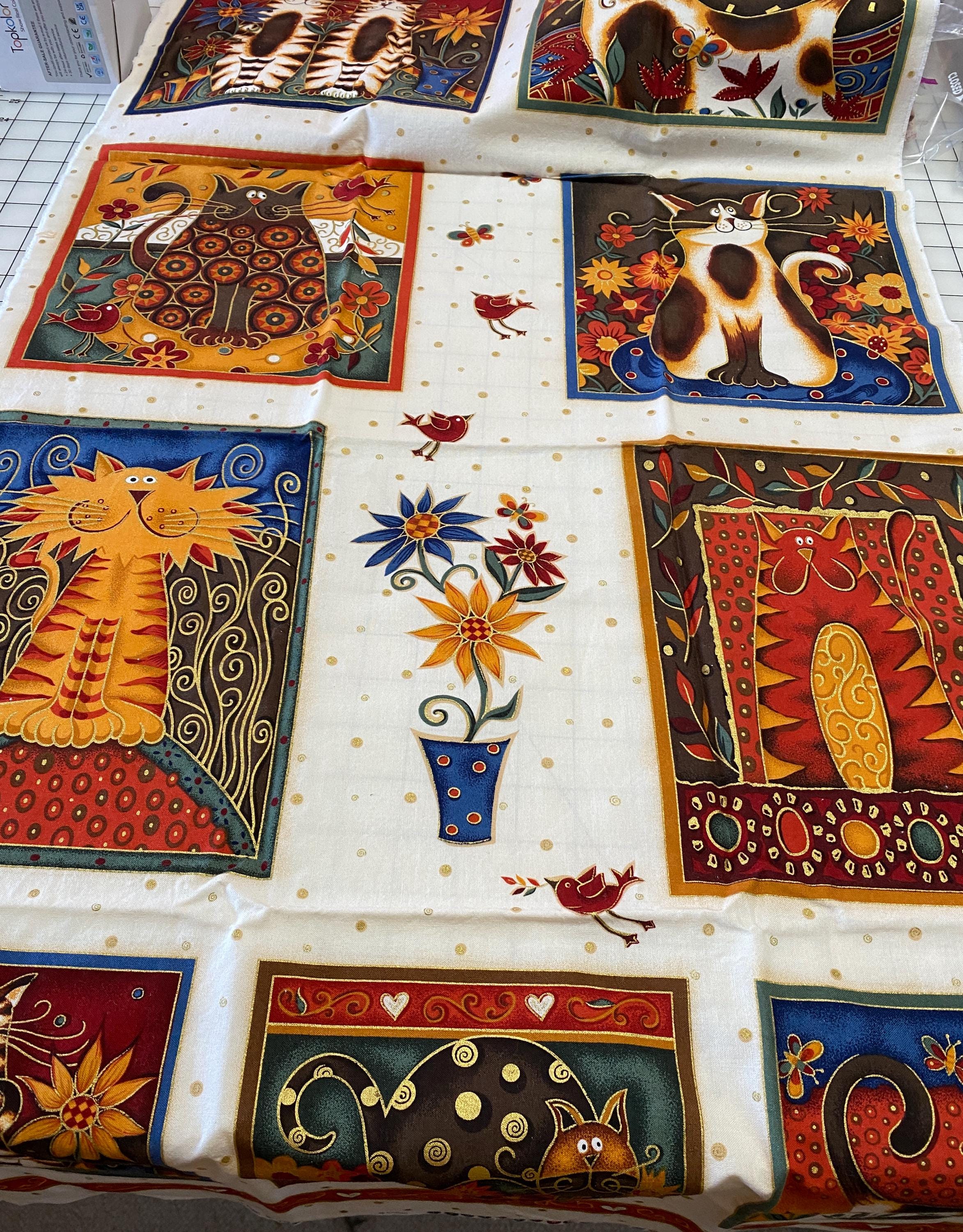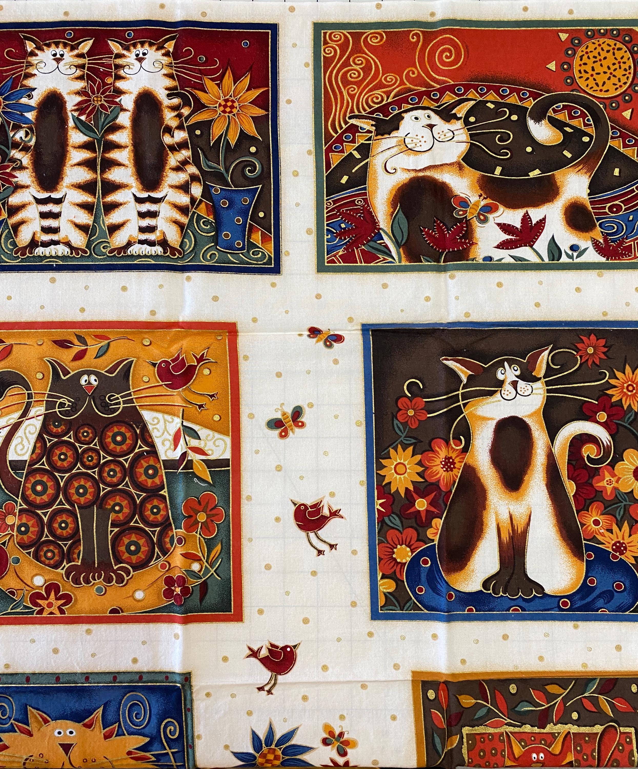 The panel is 42/43" wide by 23" long and has 9 individual cat blocks. Three of the blocks are about 6.5" square, 2 are about 8" X 10", 2 are about 9" square and 2 are about 7.75" X 10.5". Plenty of seam space.