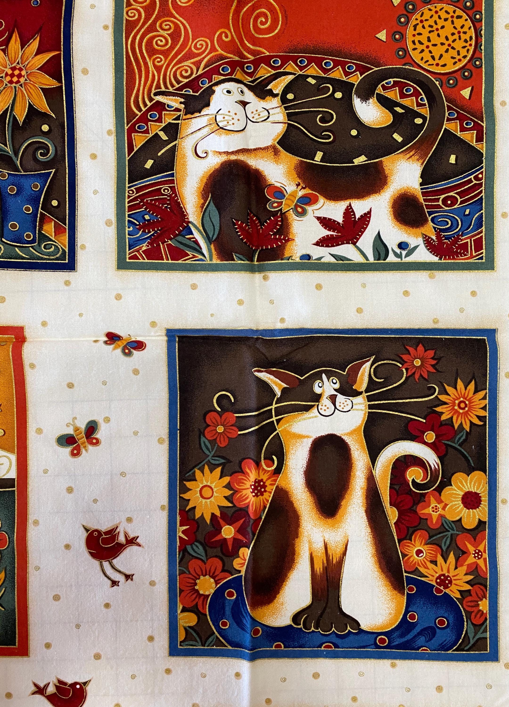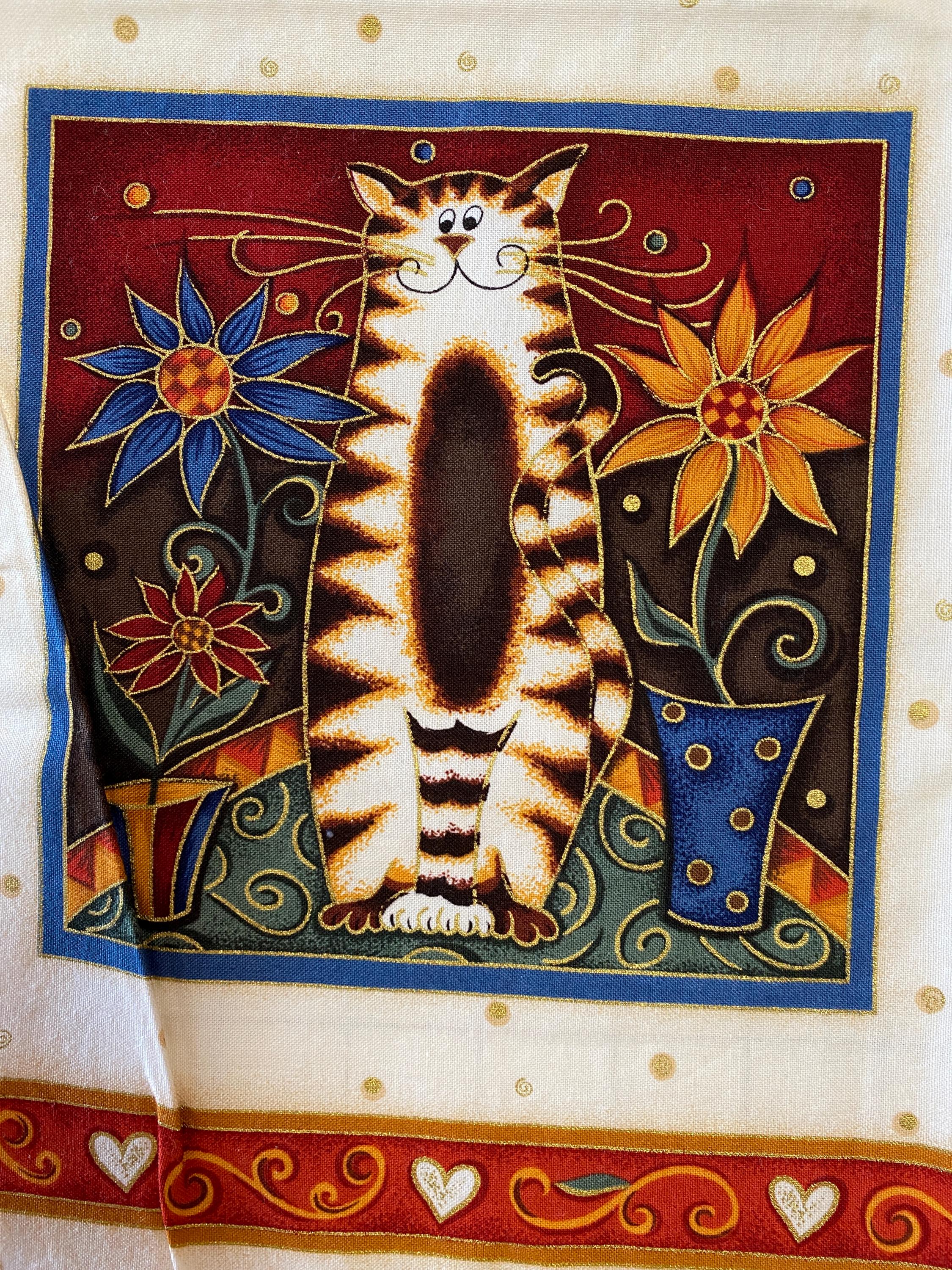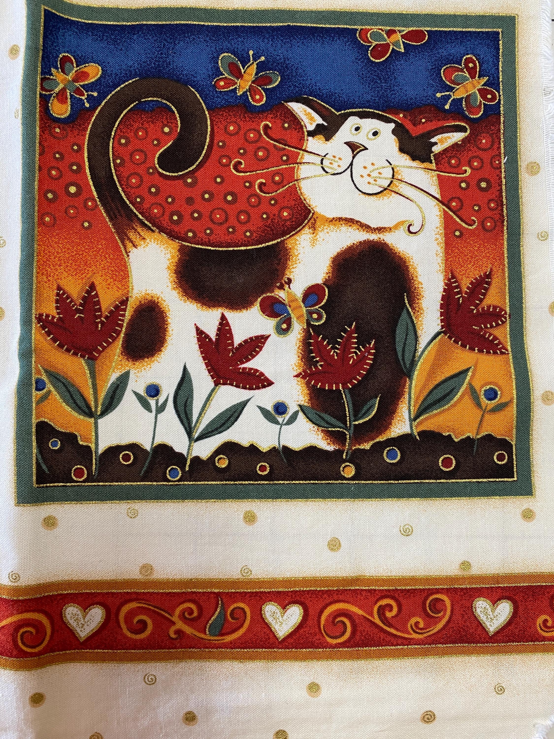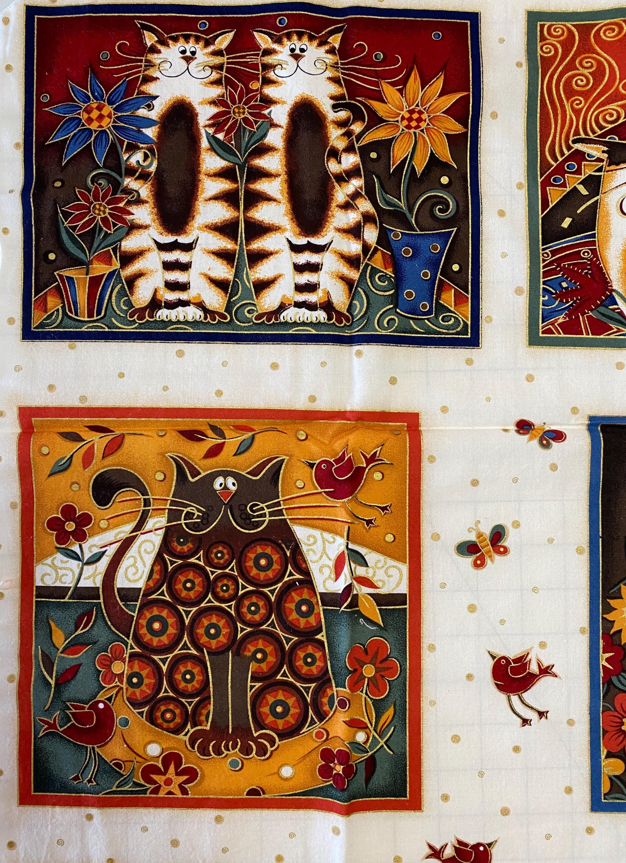 The panel is 42/43" wide by 23" long and has 9 individual cat blocks. Three of the blocks are about 6.5" square, 2 are about 8" X 10", 2 are about 9" square and 2 are about 7.75" X 10.5". Plenty of seam space.