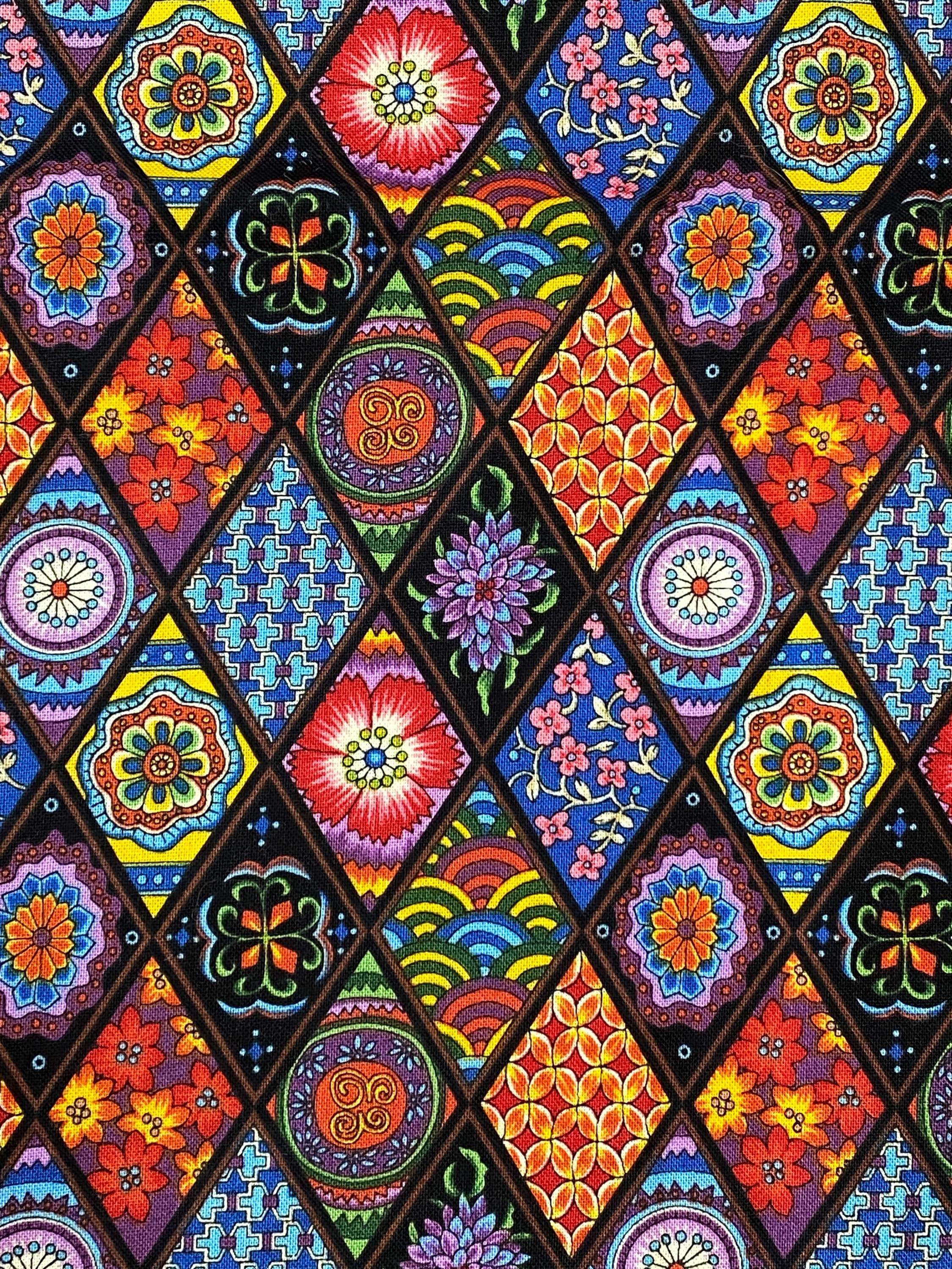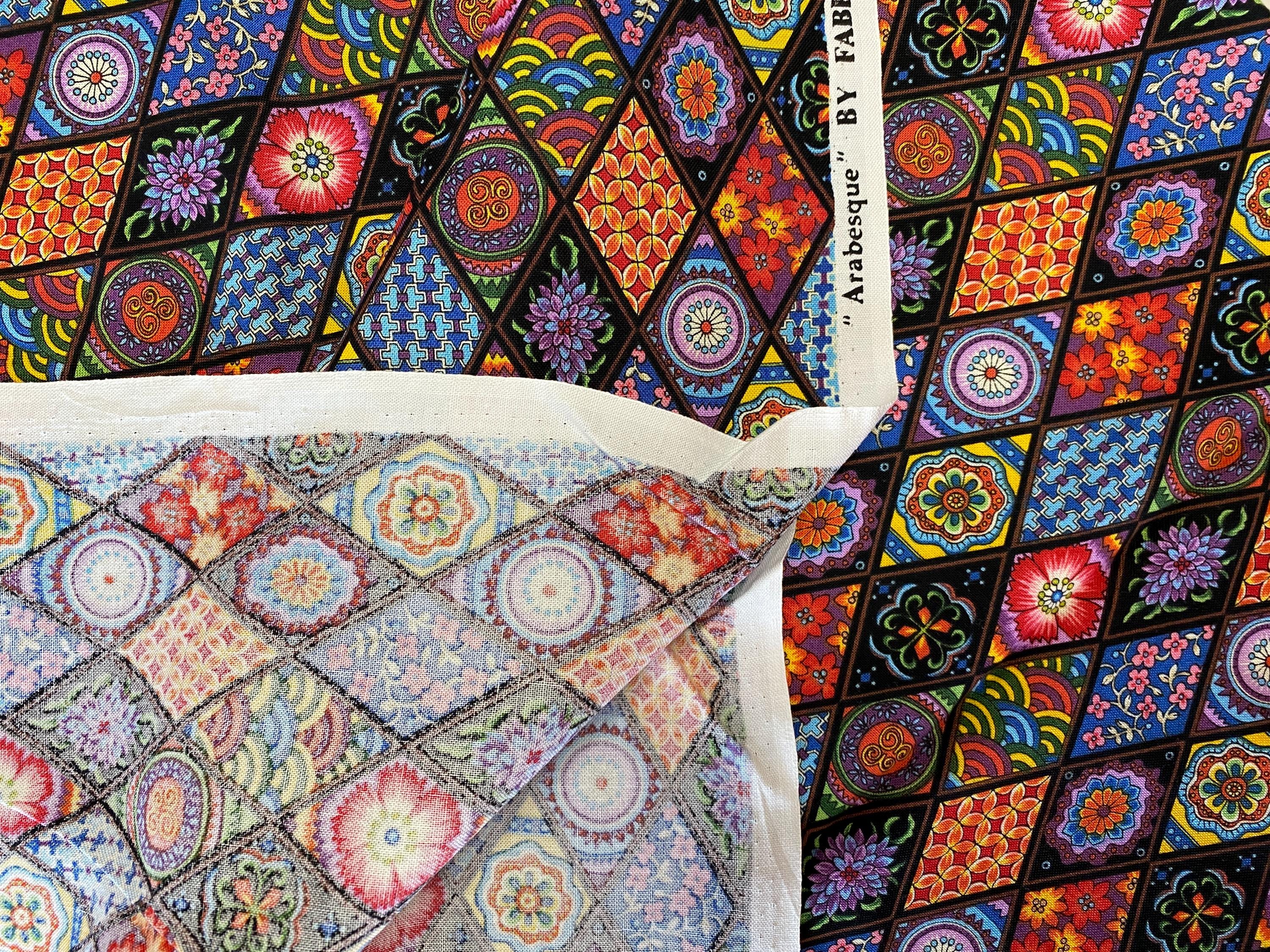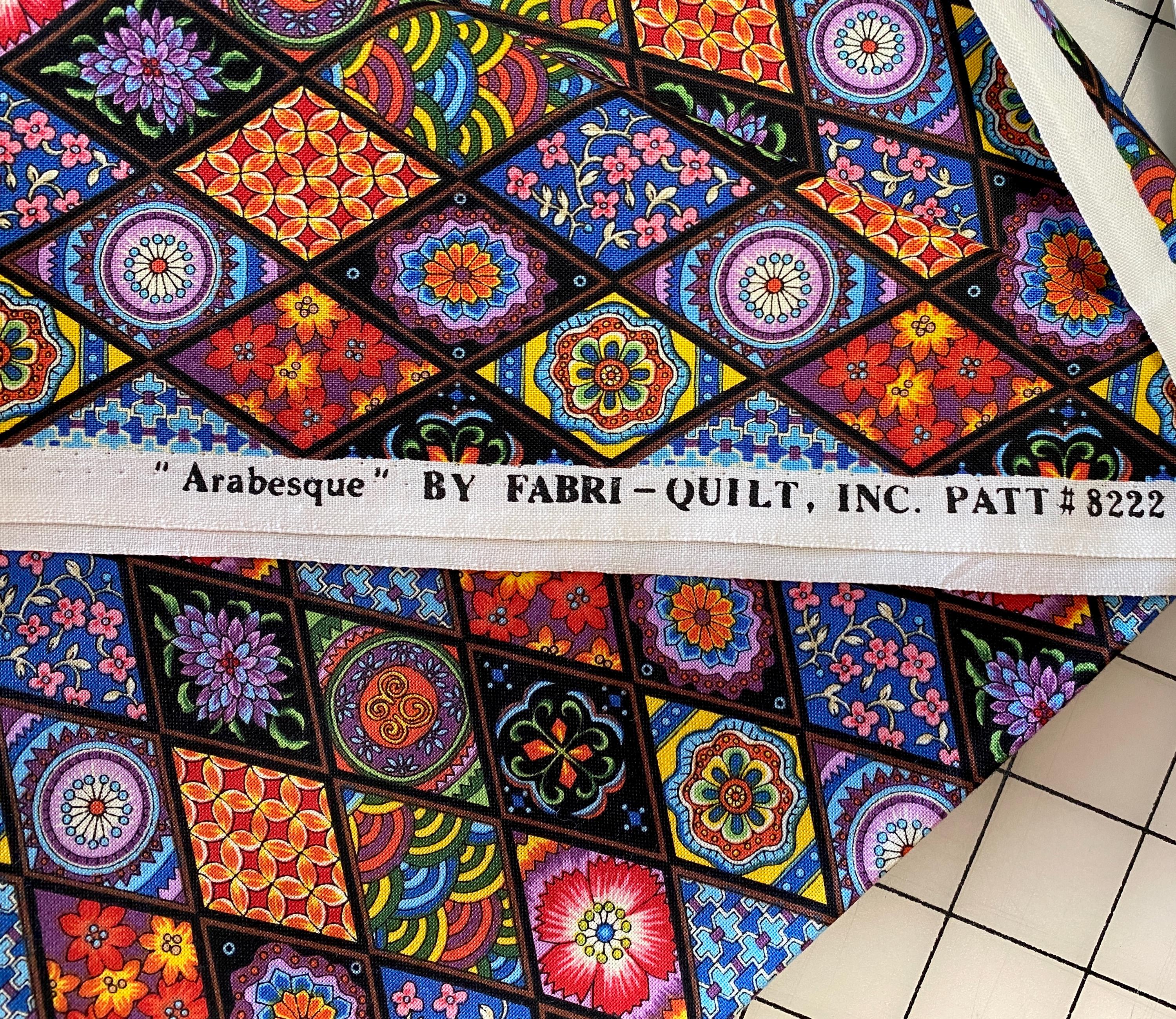 All cotton & lots of color! It is called Arabesque and it's from Fabri-Quilt, Inc, (Pattern #8222). Also, called Captivity Design.