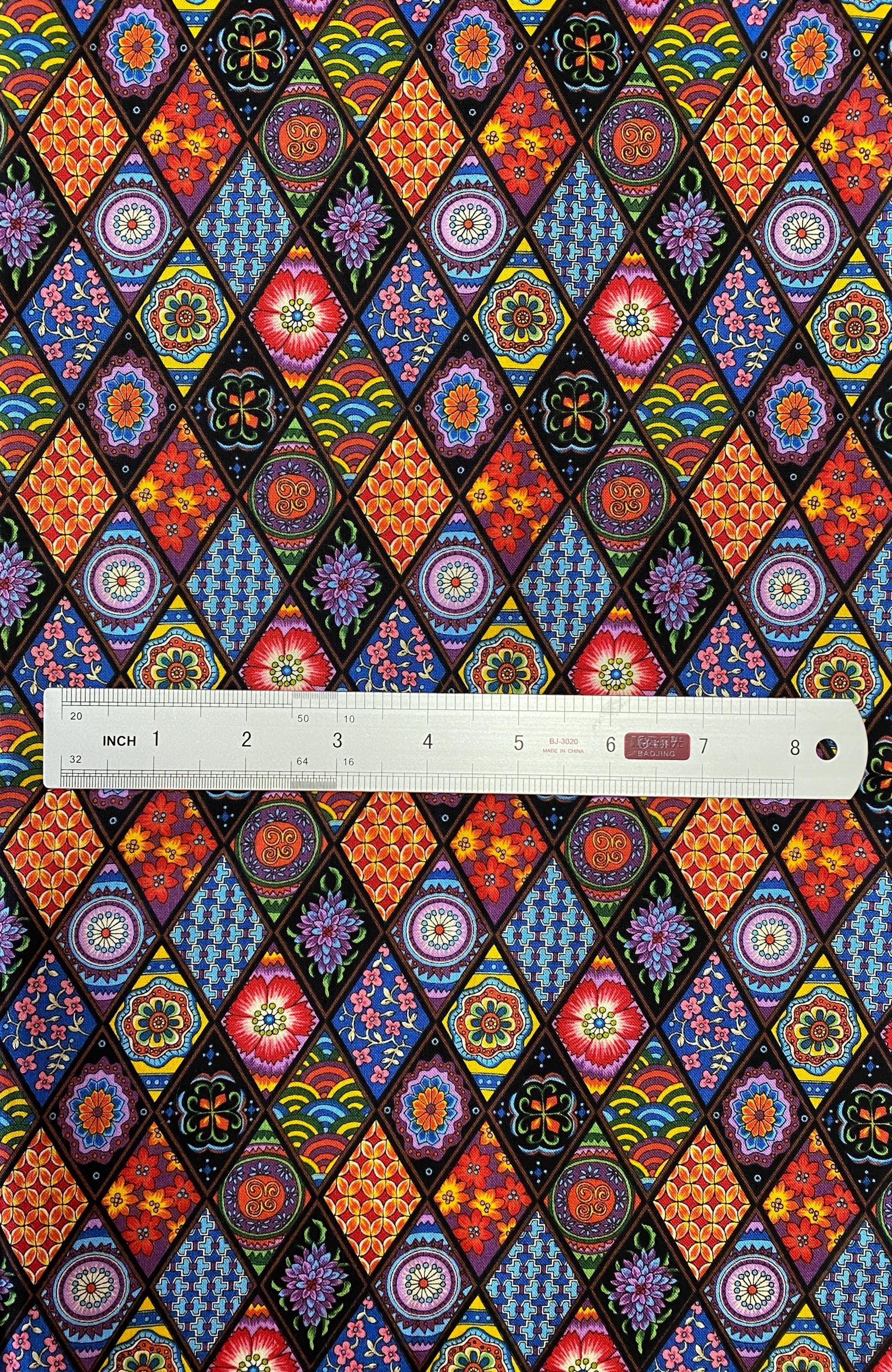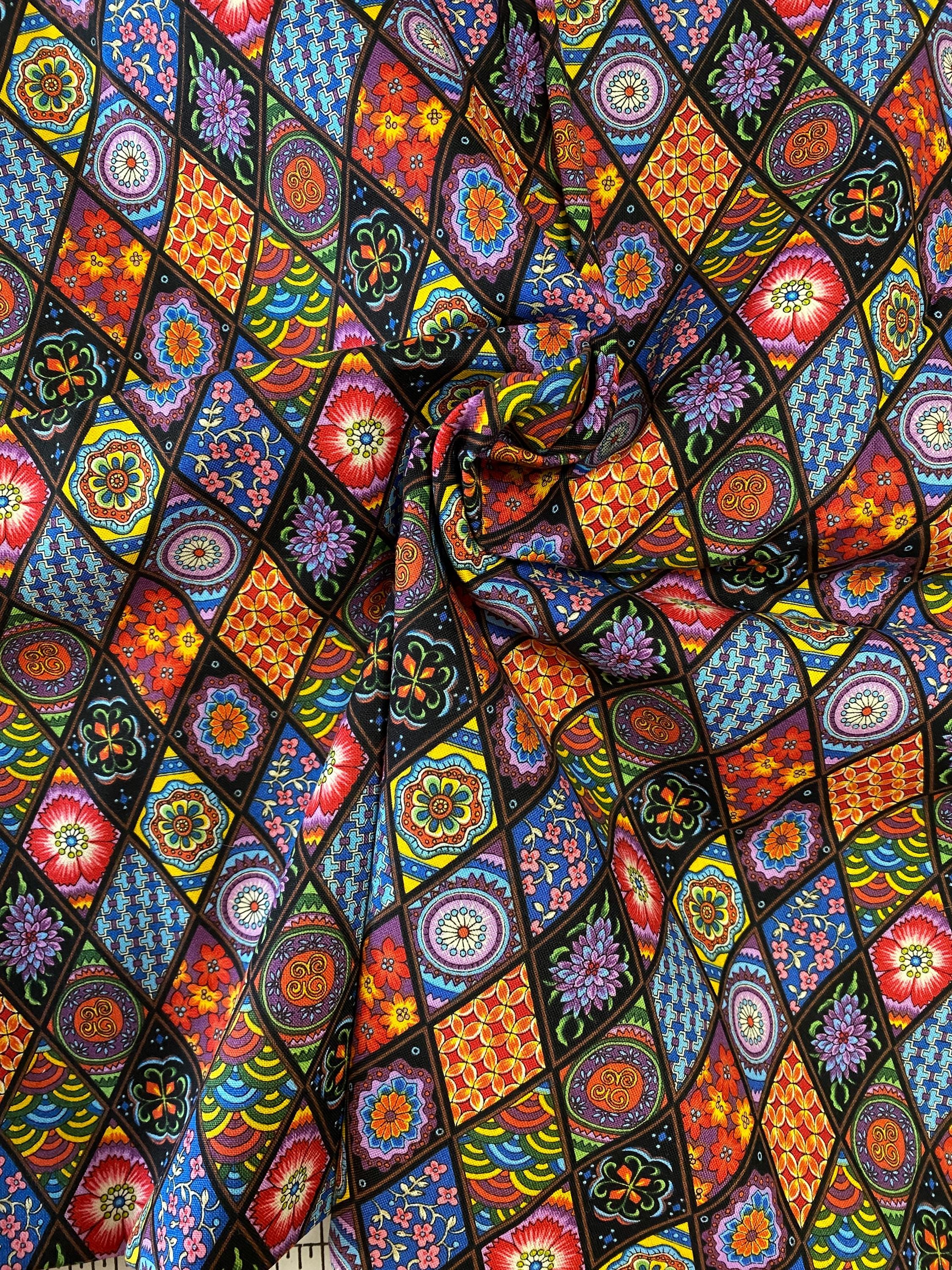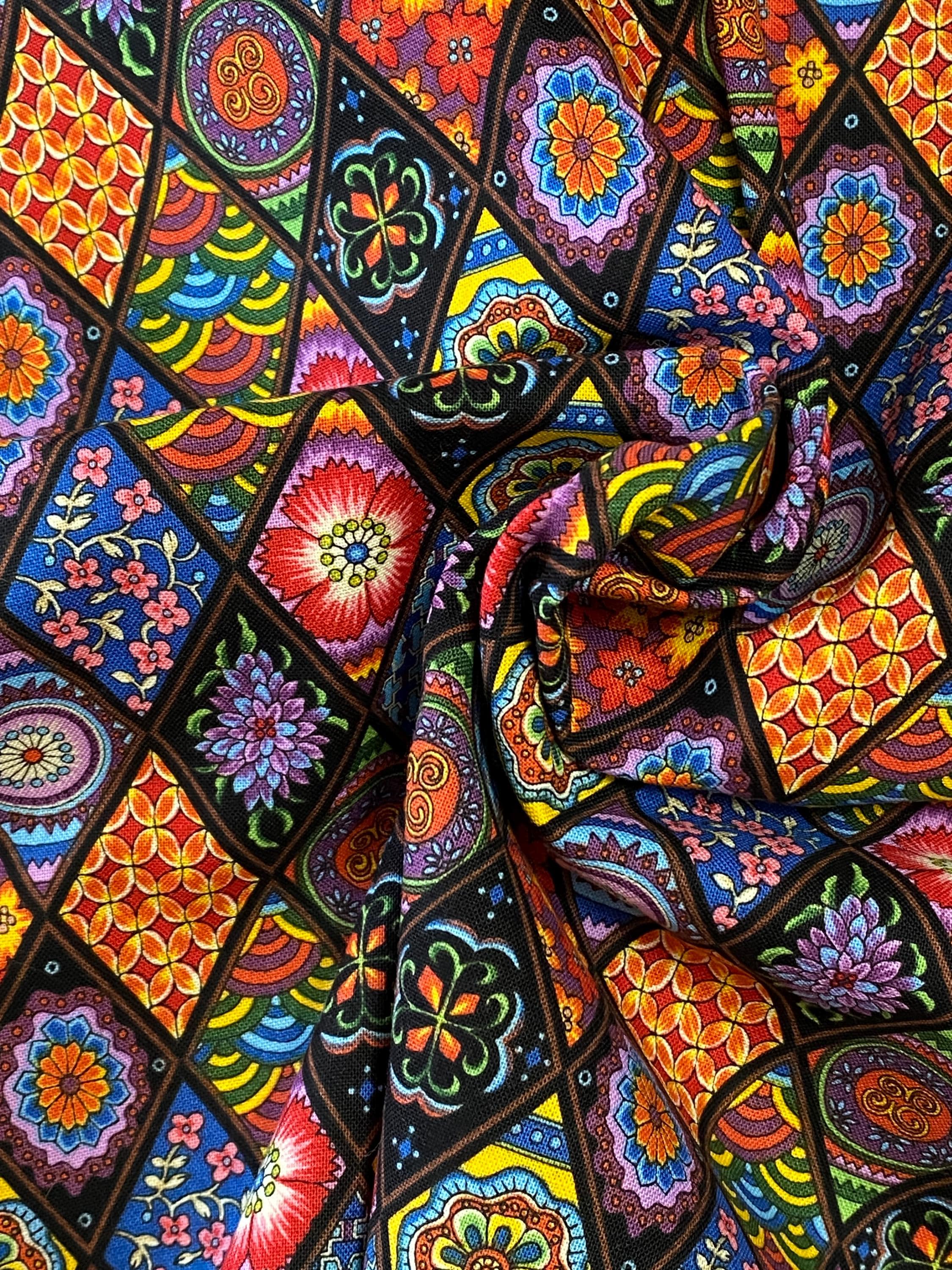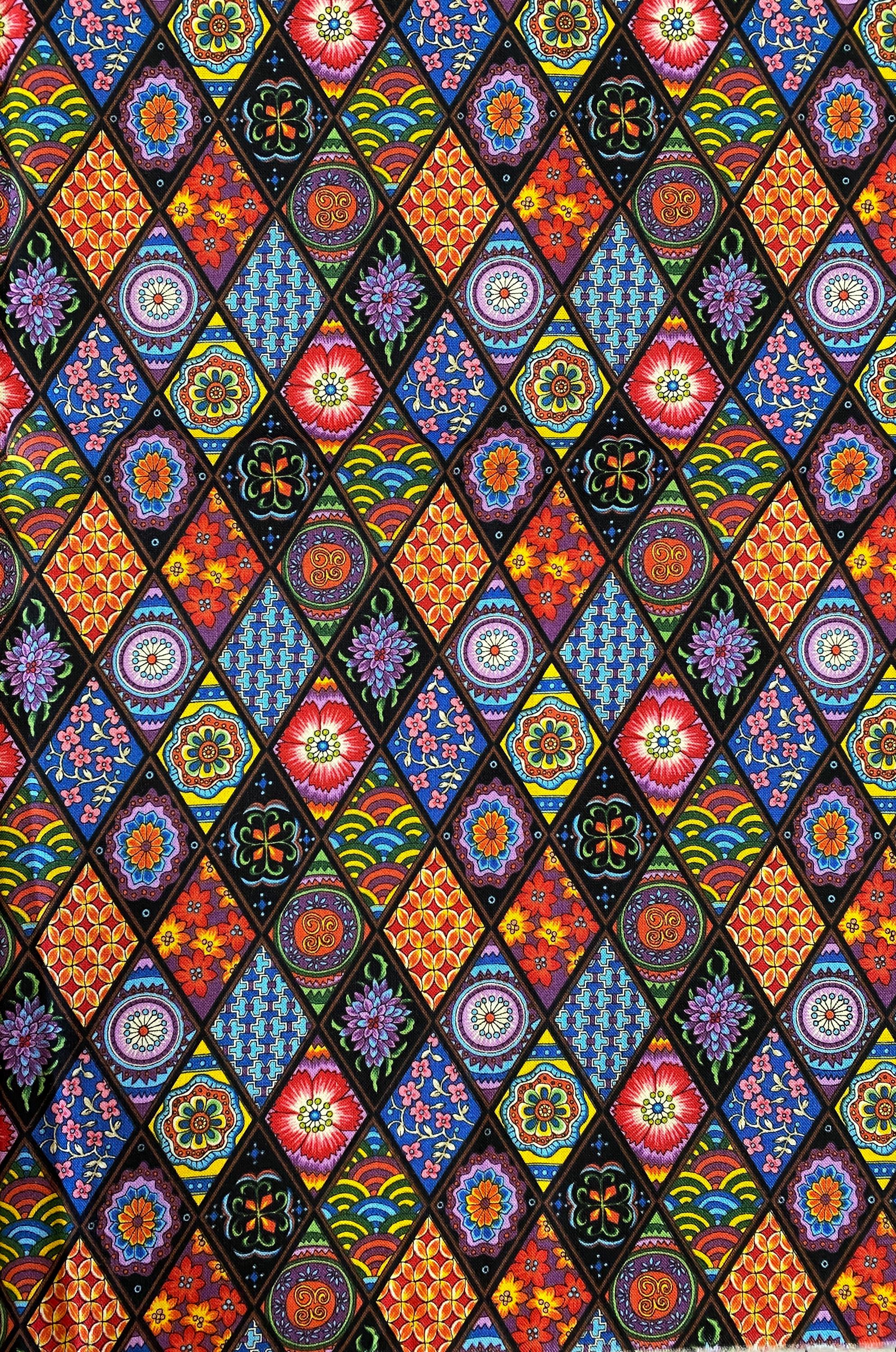 All cotton & lots of color! It is called Arabesque and it's from Fabri-Quilt, Inc, (Pattern #8222). Also, called Captivity Design.