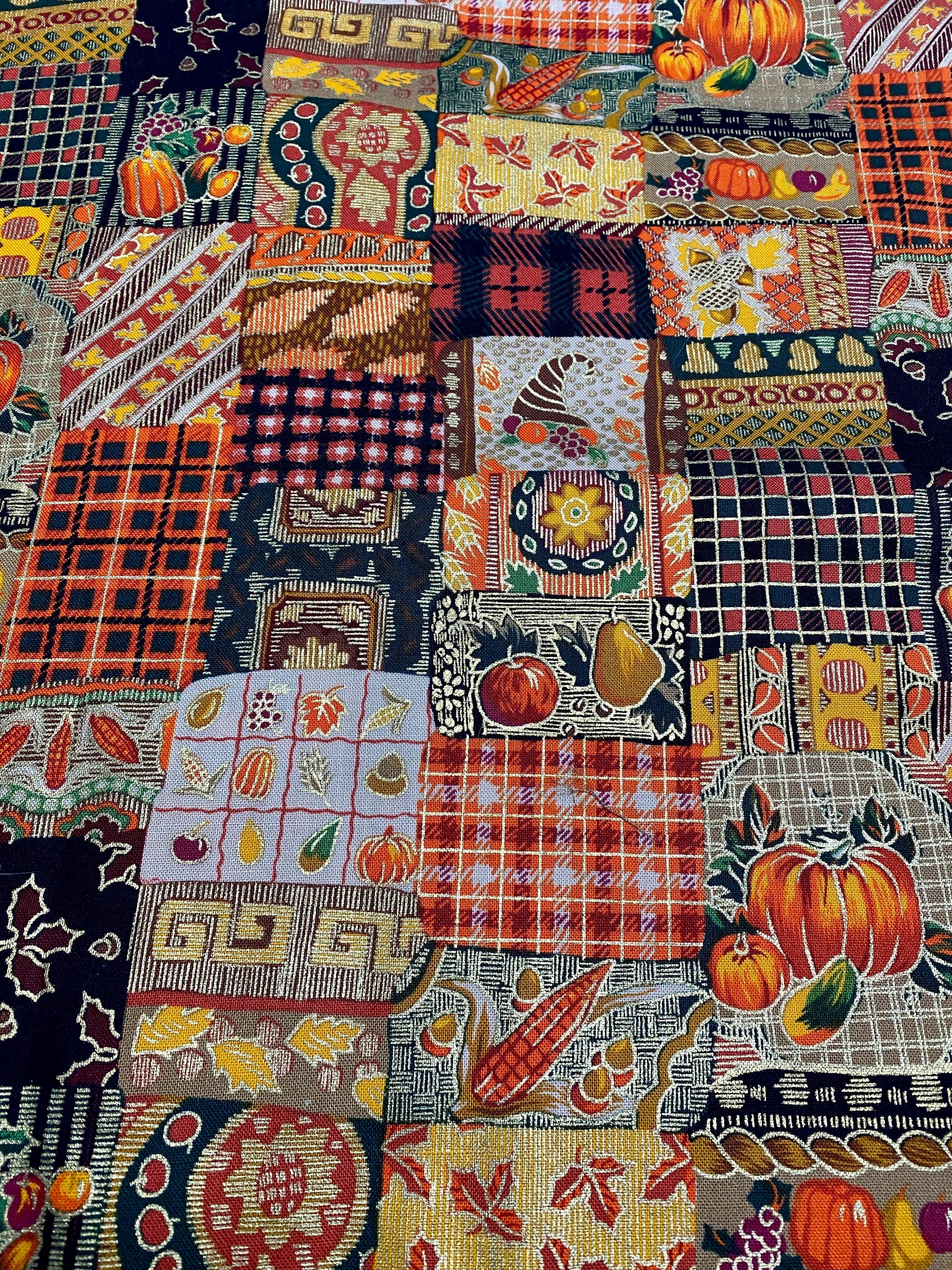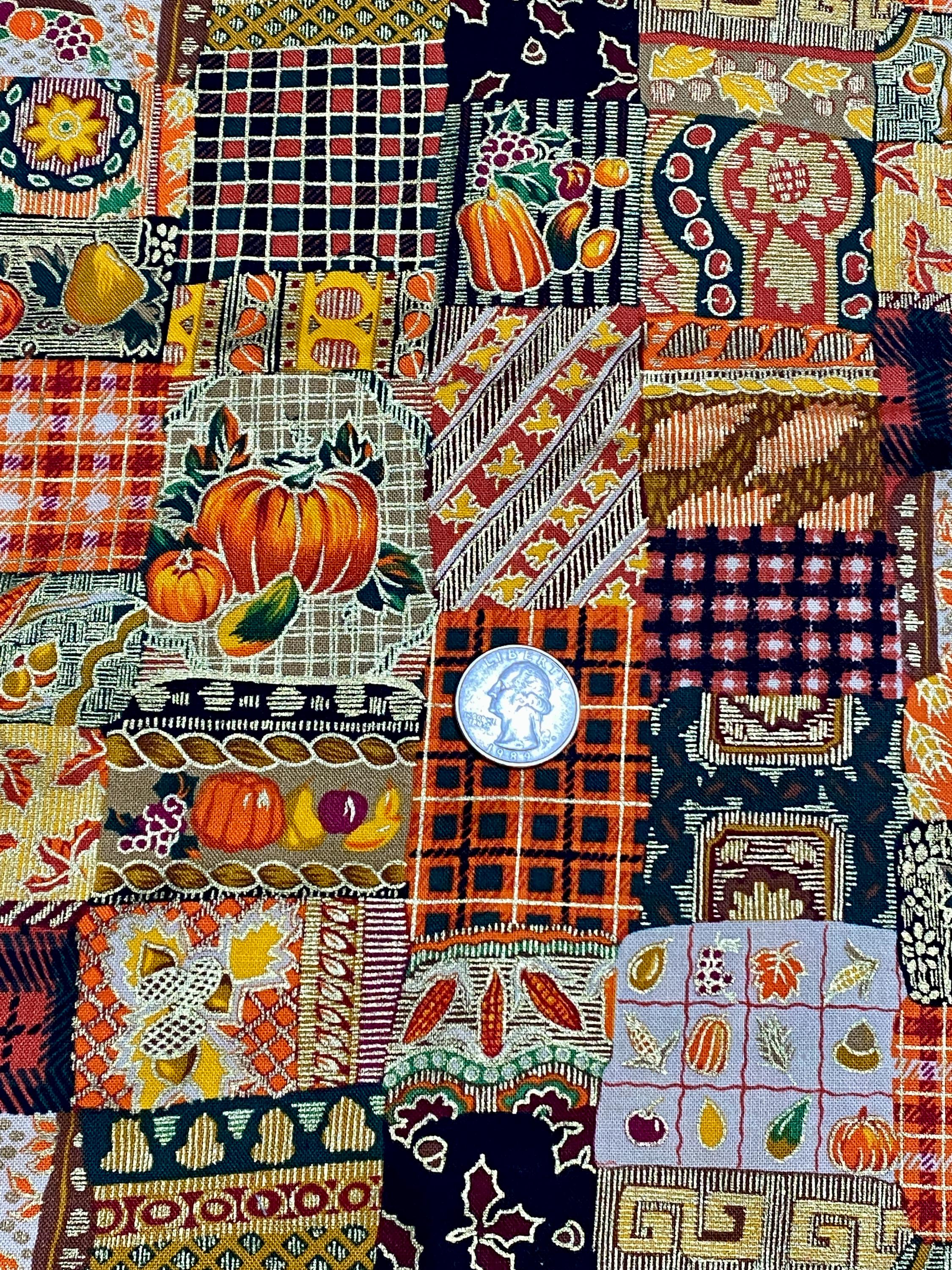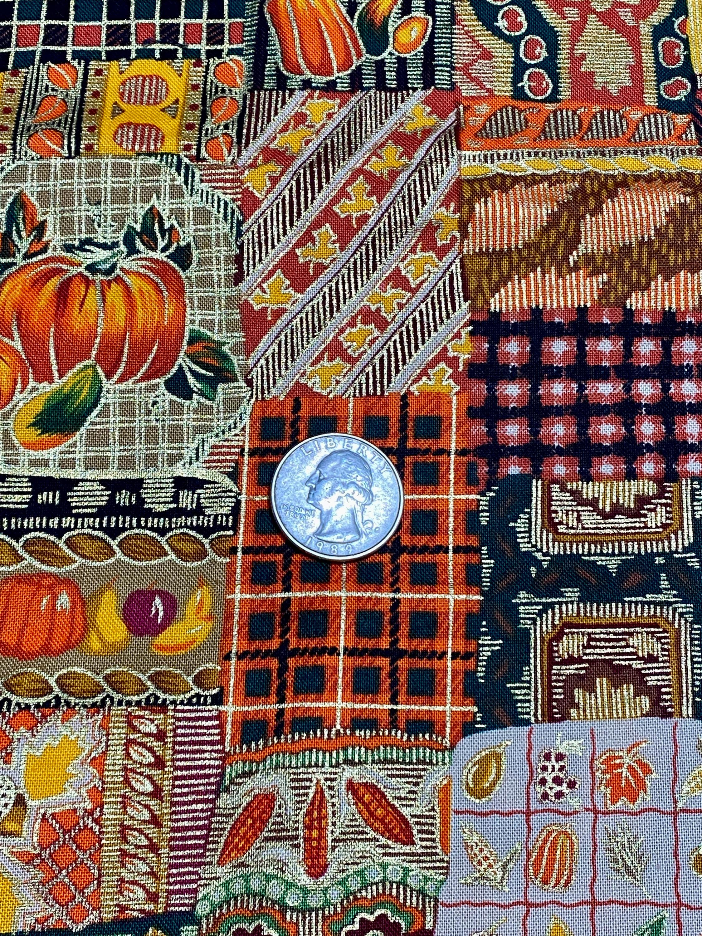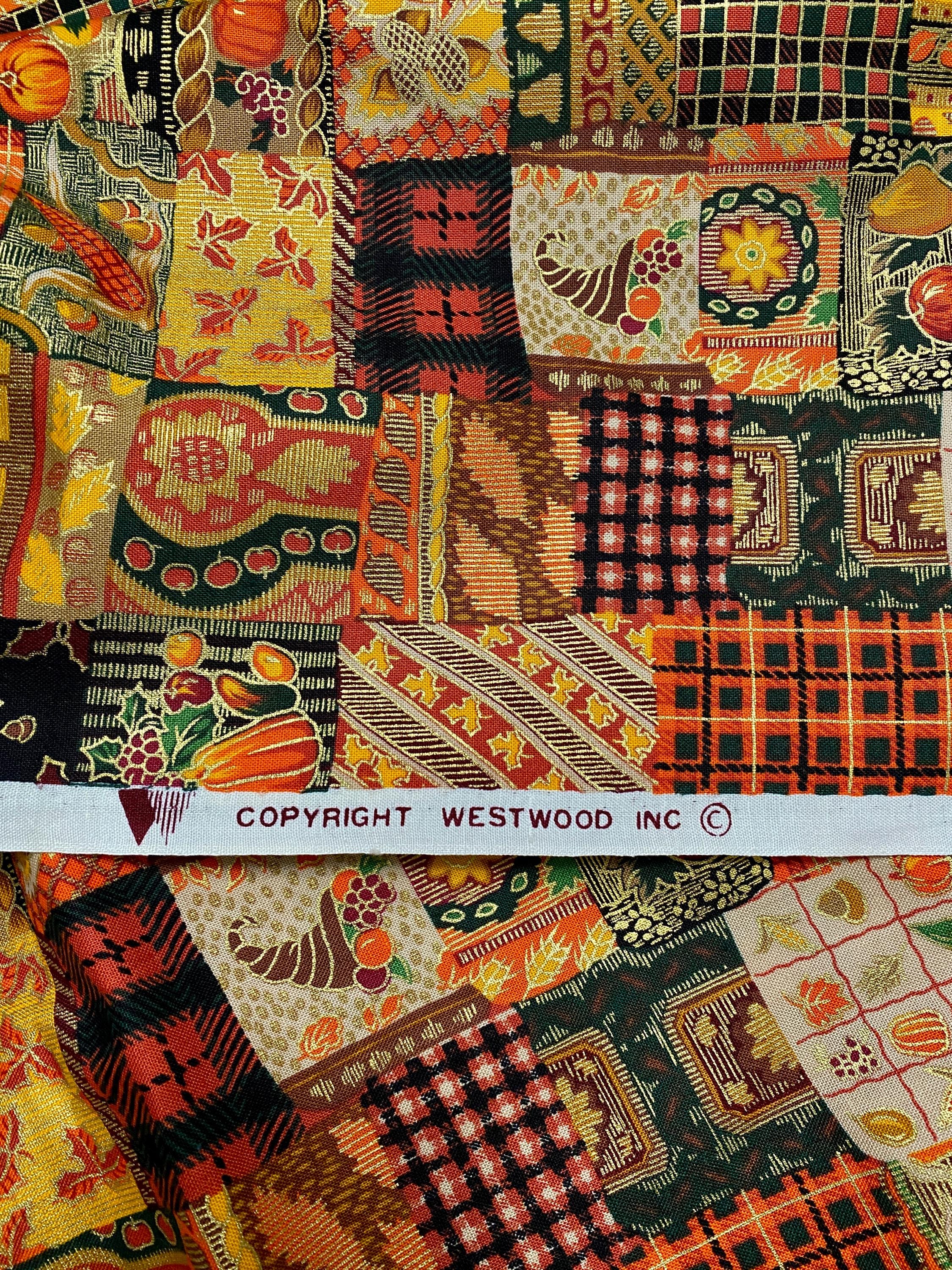 This is from Westwood, Inc, from the '90s; lots of squares with Fall themes...pumpkins, plaids, leaves, fruit, corn and abstract designs in orange, brown, black, green, burgundy...the selvage colors show a dozen colors are printed into the design PLUS a metallic gold.