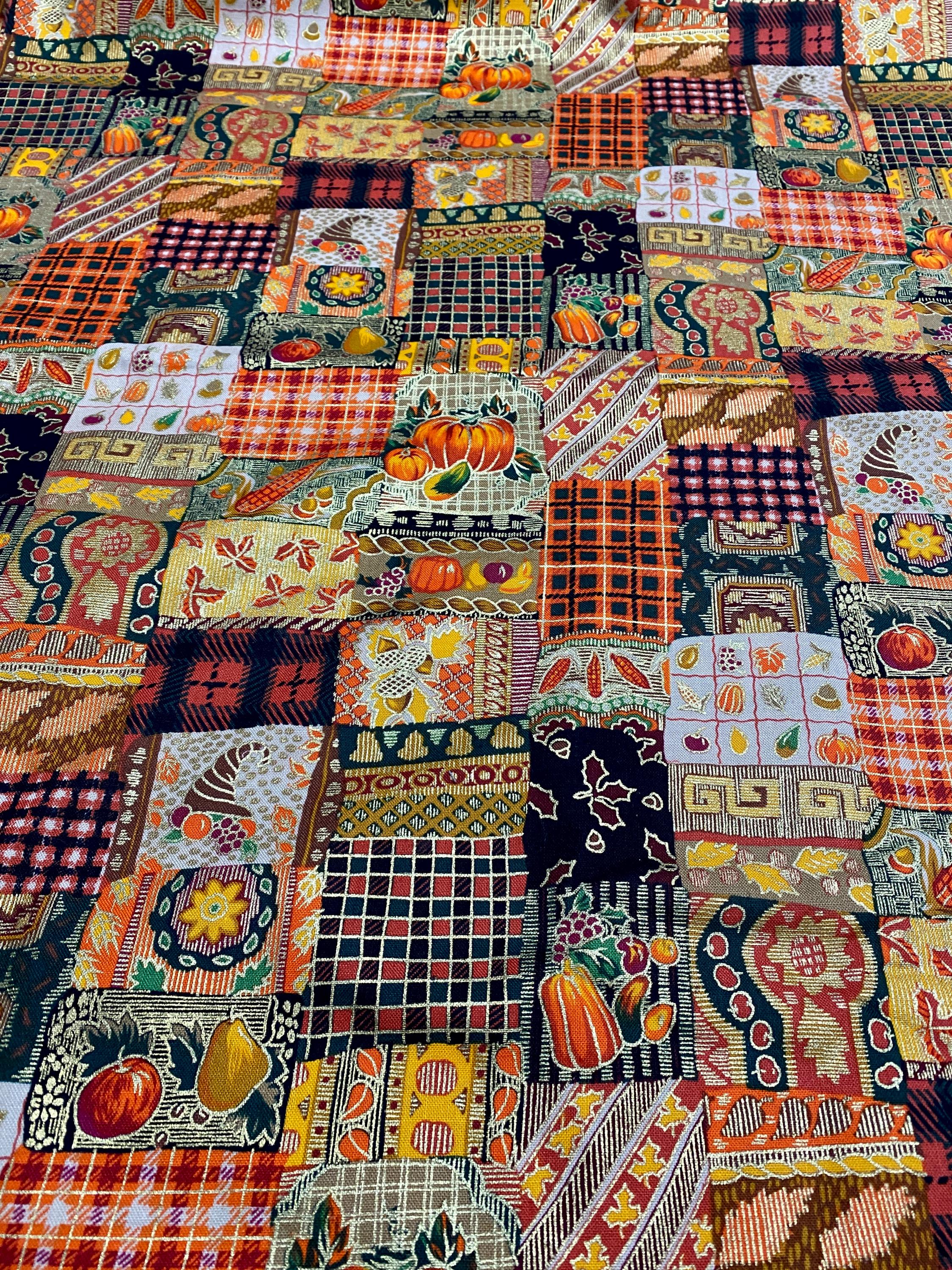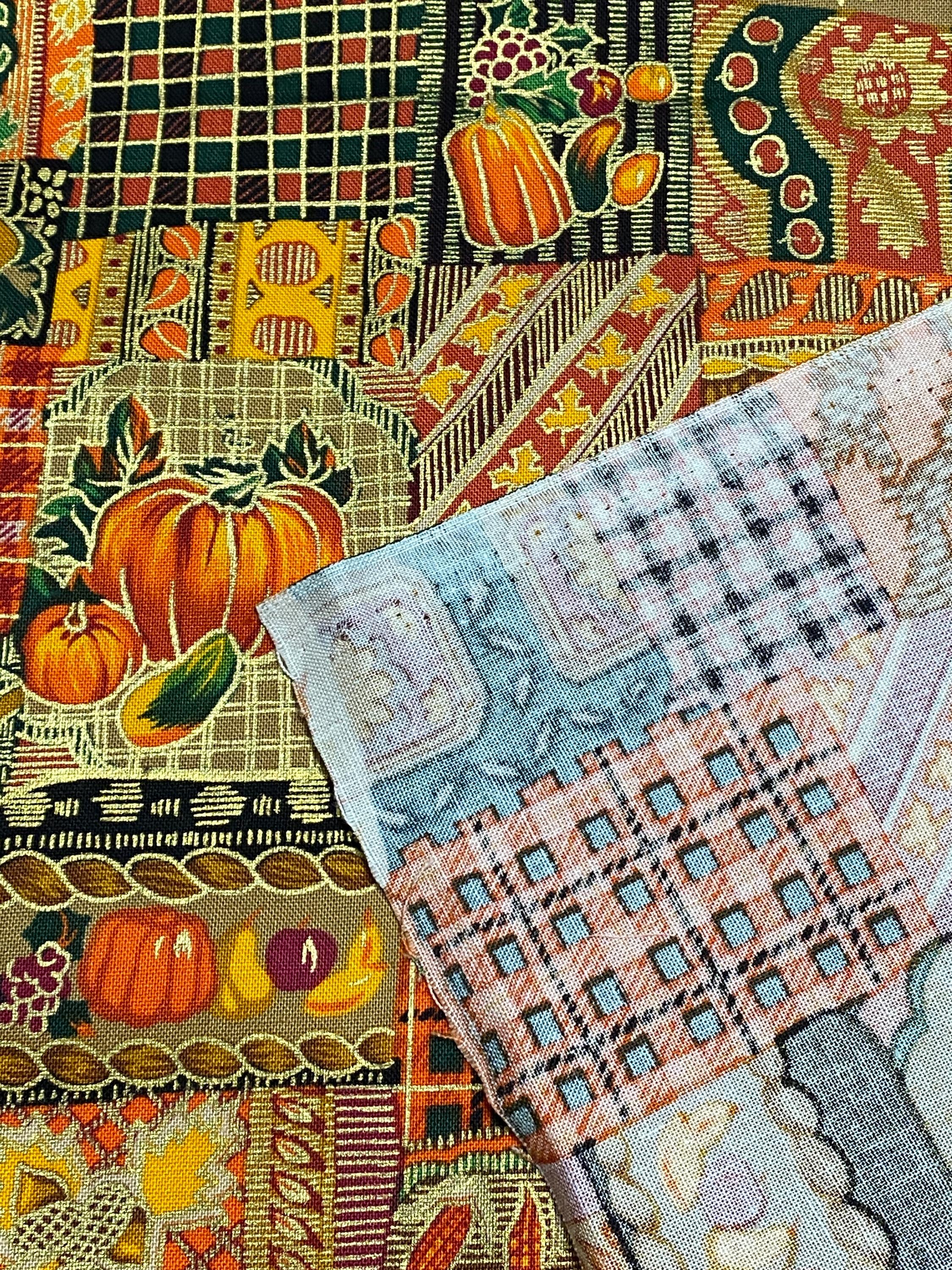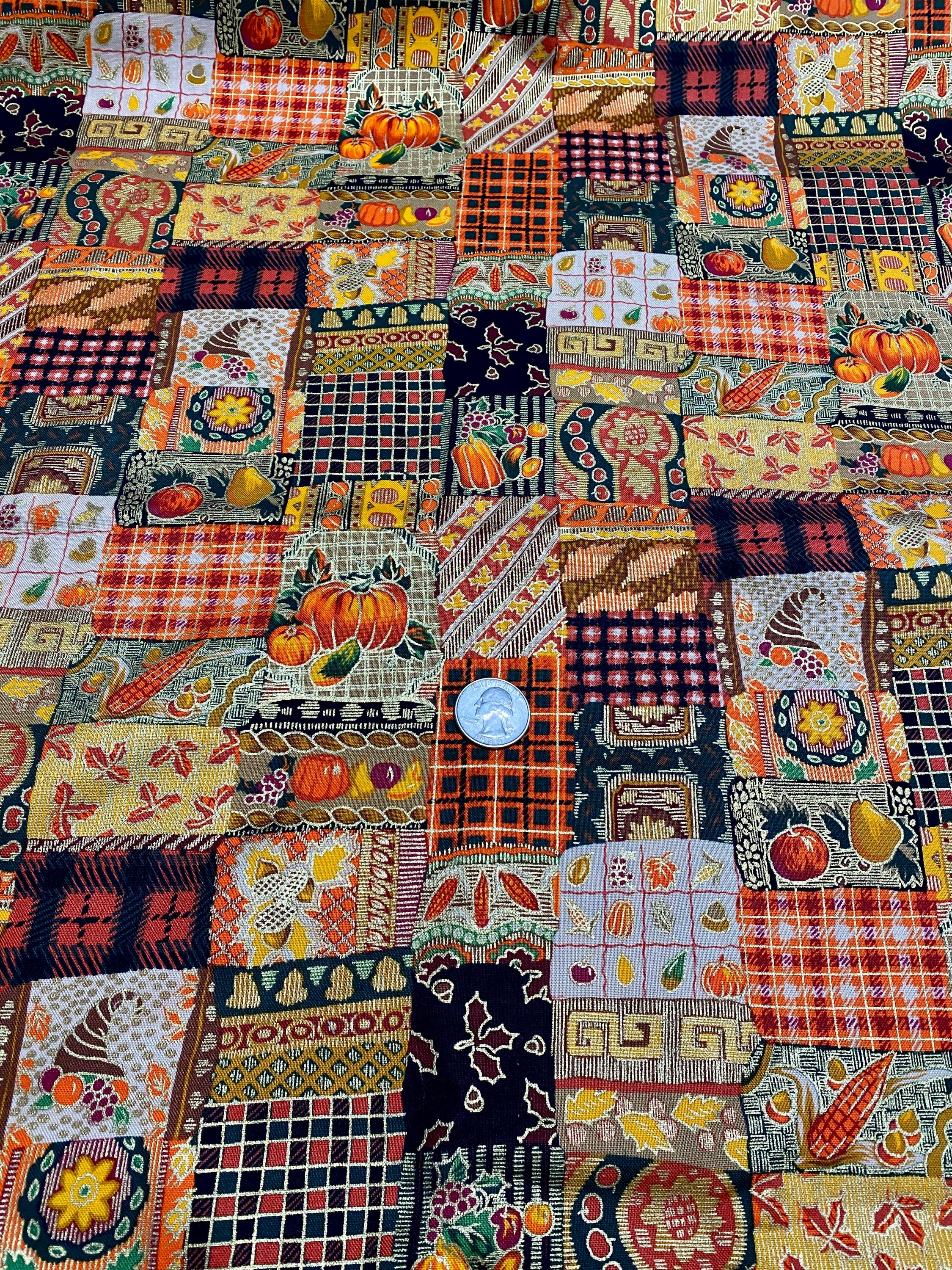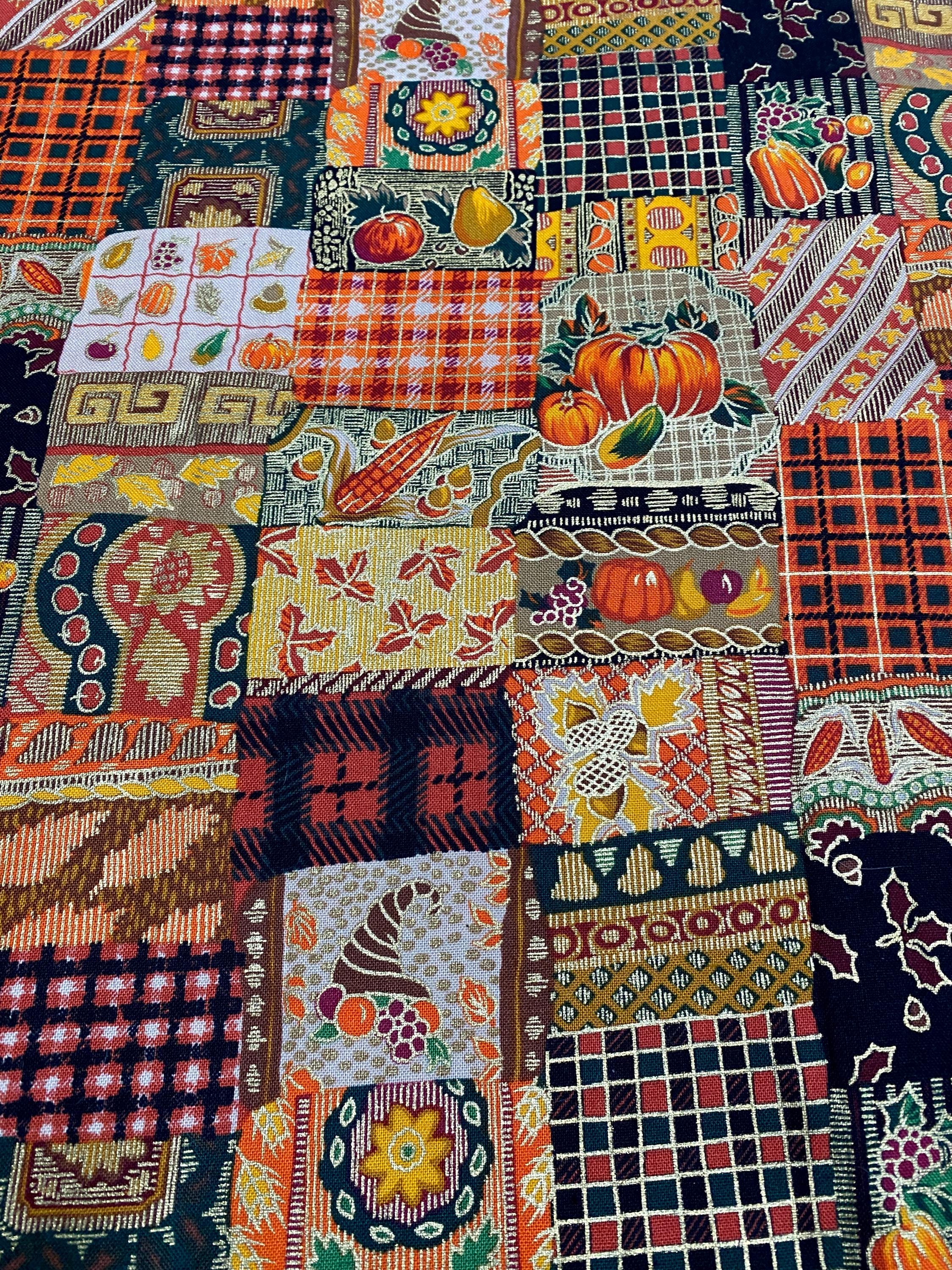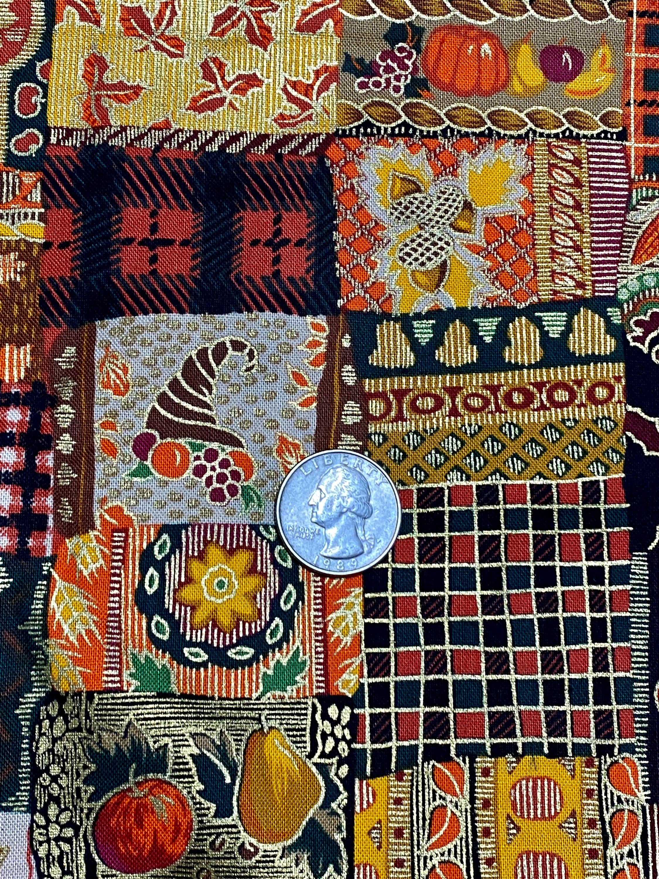 This is from Westwood, Inc, from the '90s; lots of squares with Fall themes...pumpkins, plaids, leaves, fruit, corn and abstract designs in orange, brown, black, green, burgundy...the selvage colors show a dozen colors are printed into the design PLUS a metallic gold.