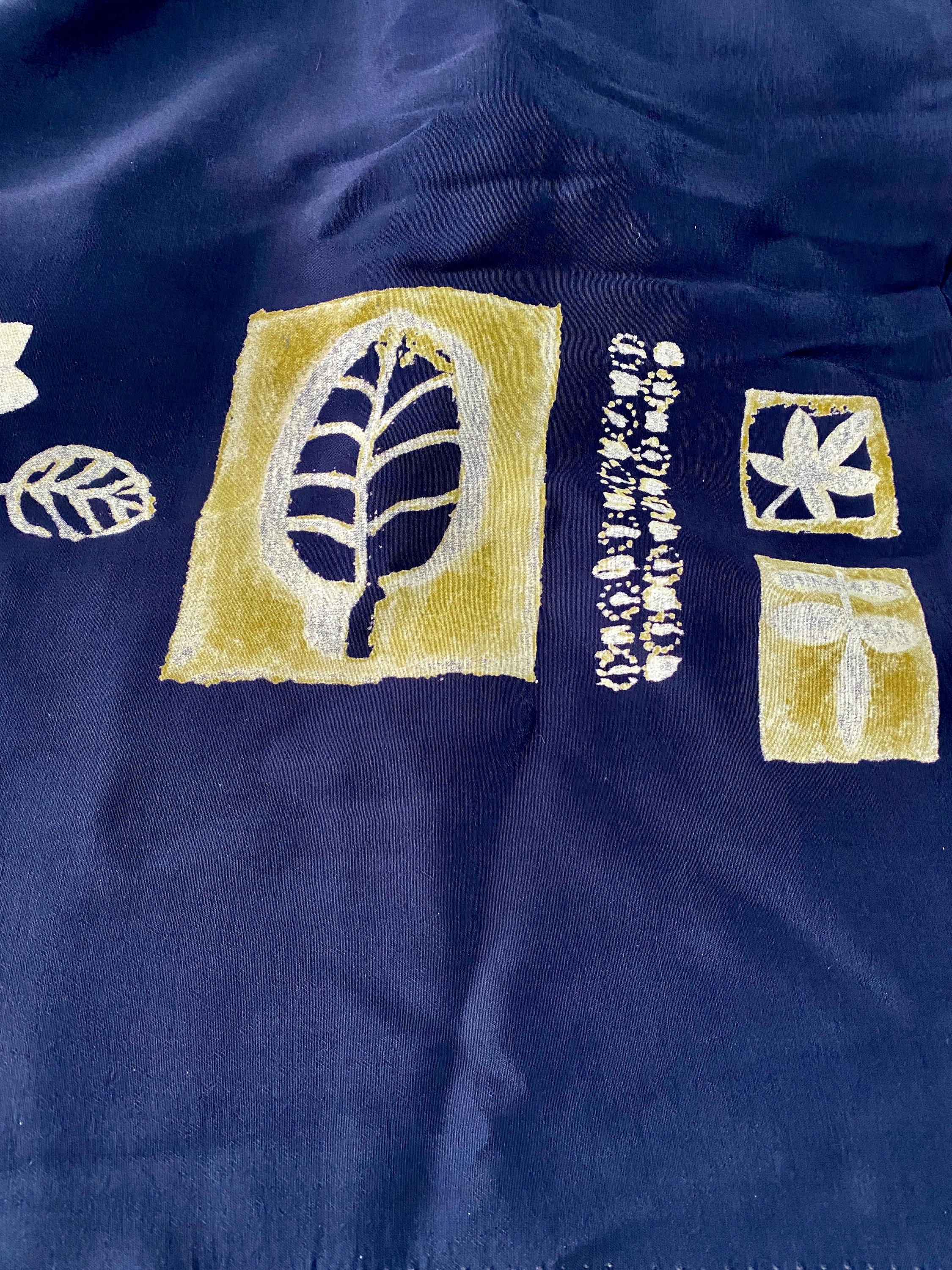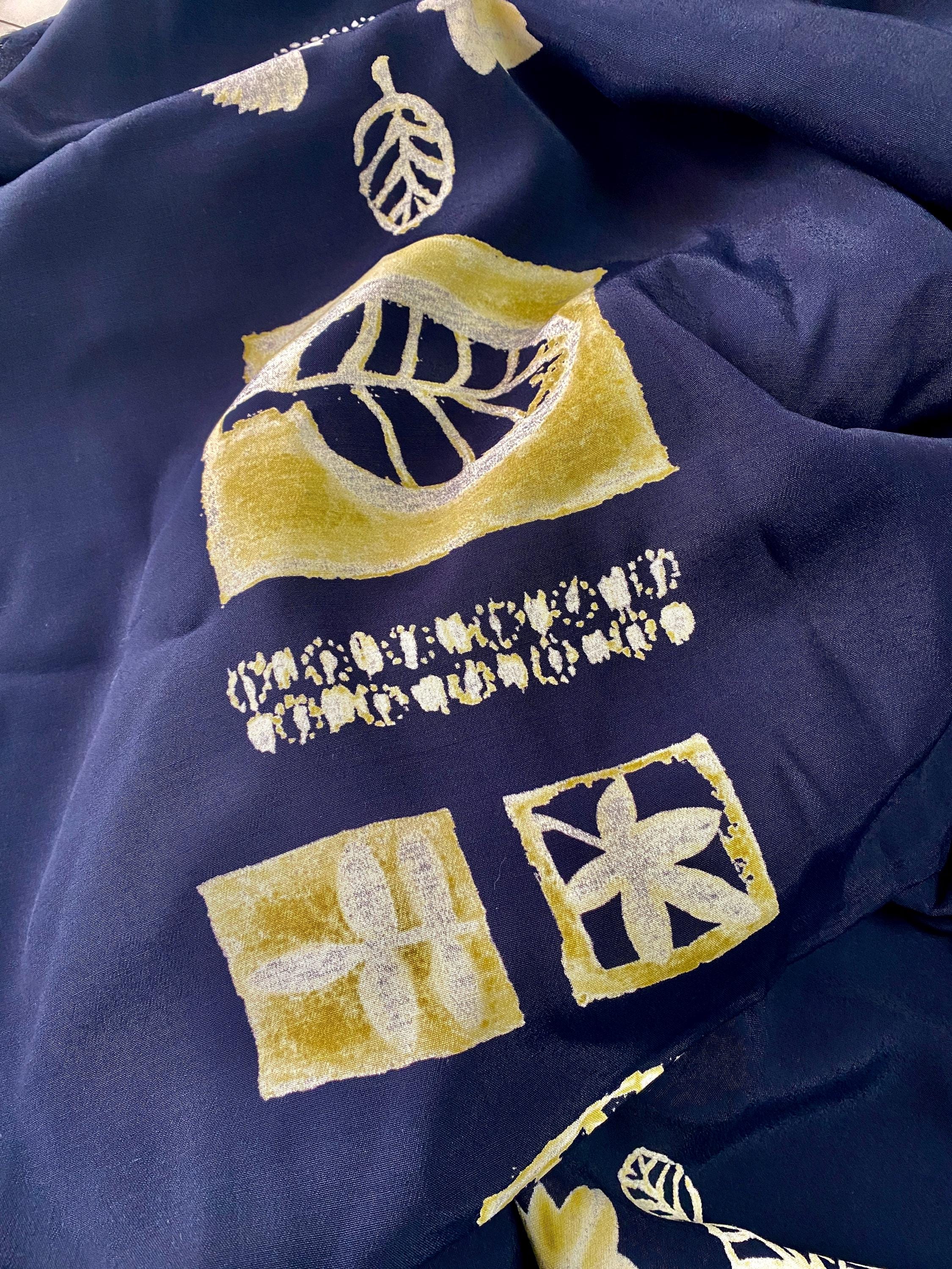 100% Rayon Shirting in Navy with a Cream & Gold border design on each selvedge edge of the 60" wide fabric.
