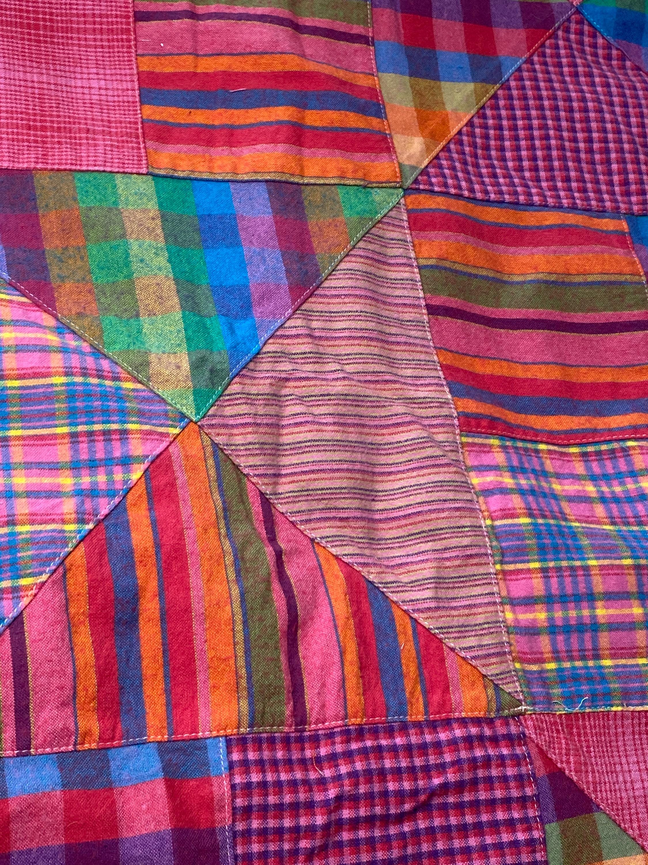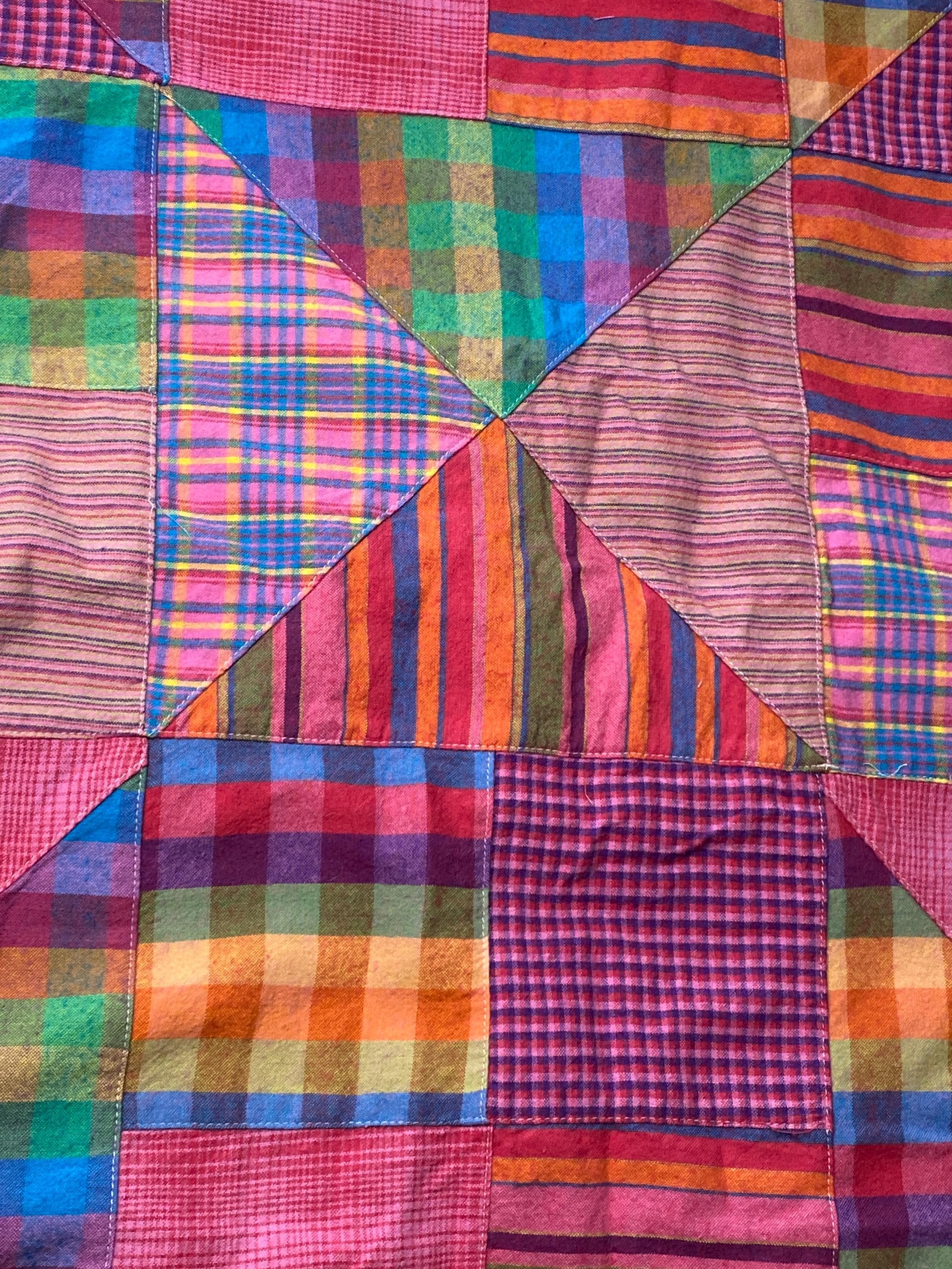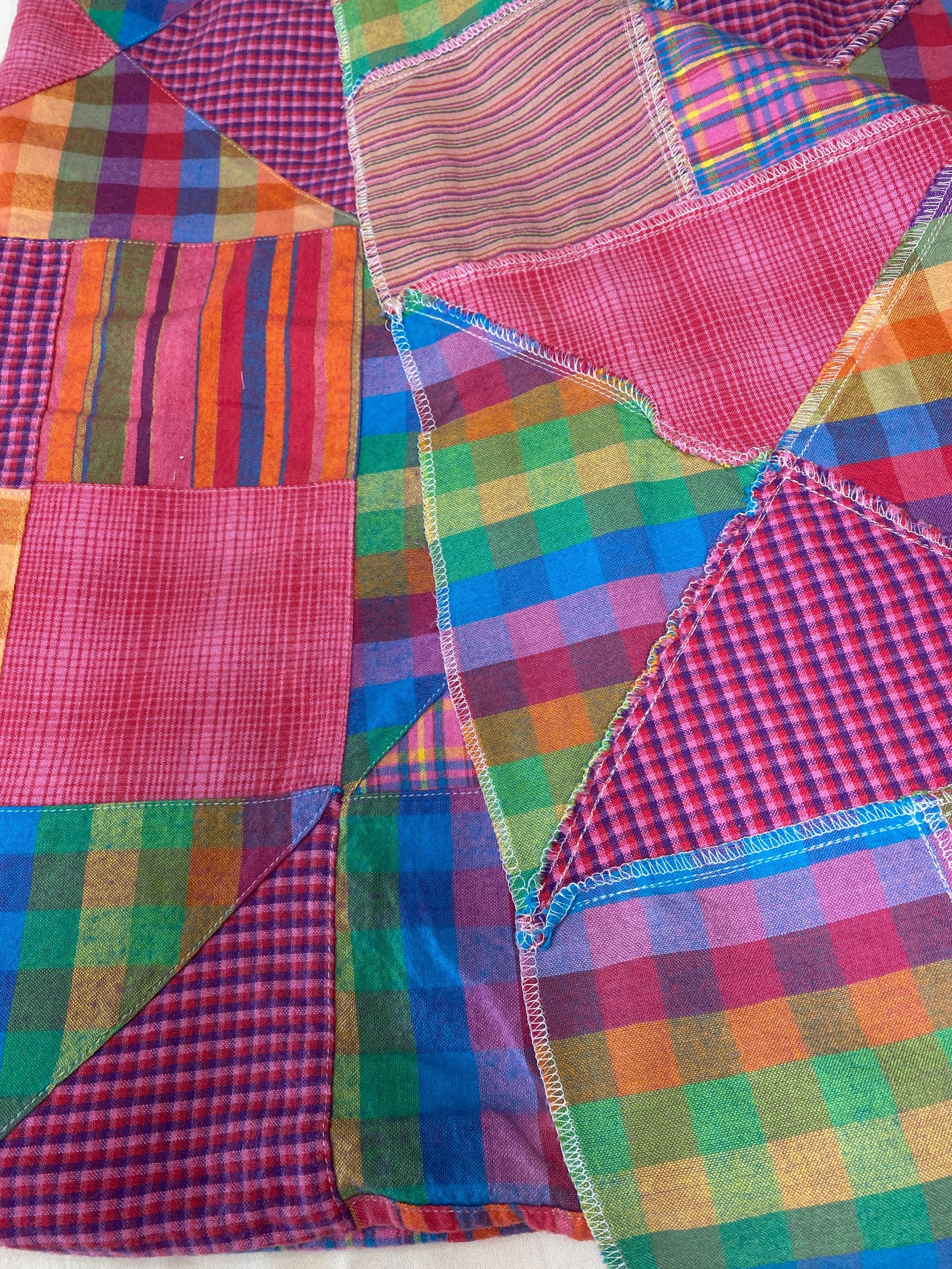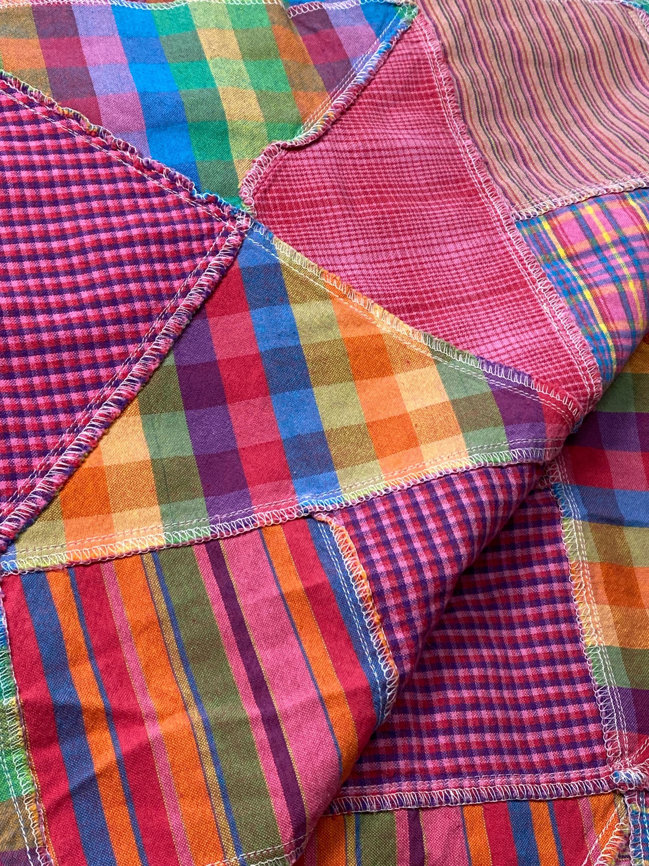 Squares & triangles, bright & muted, plaids & stripes; please see the pictures. It is hard to describe.