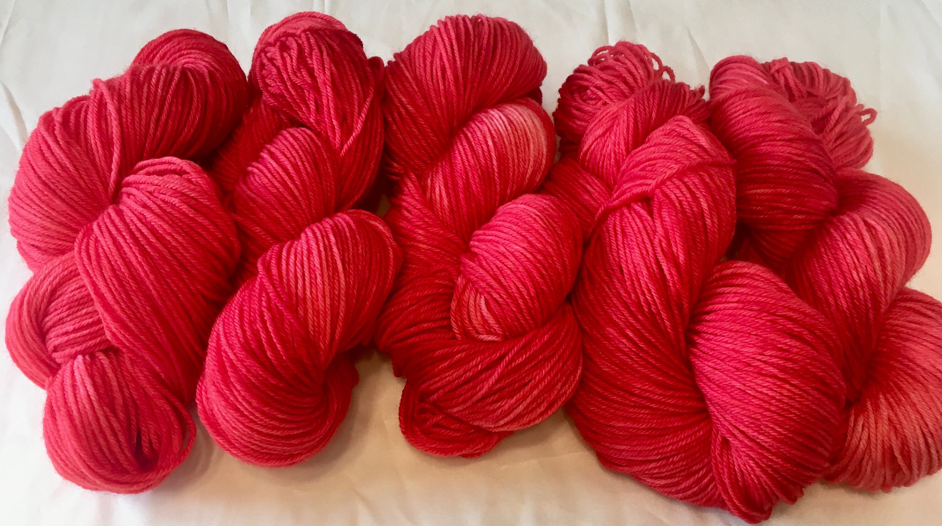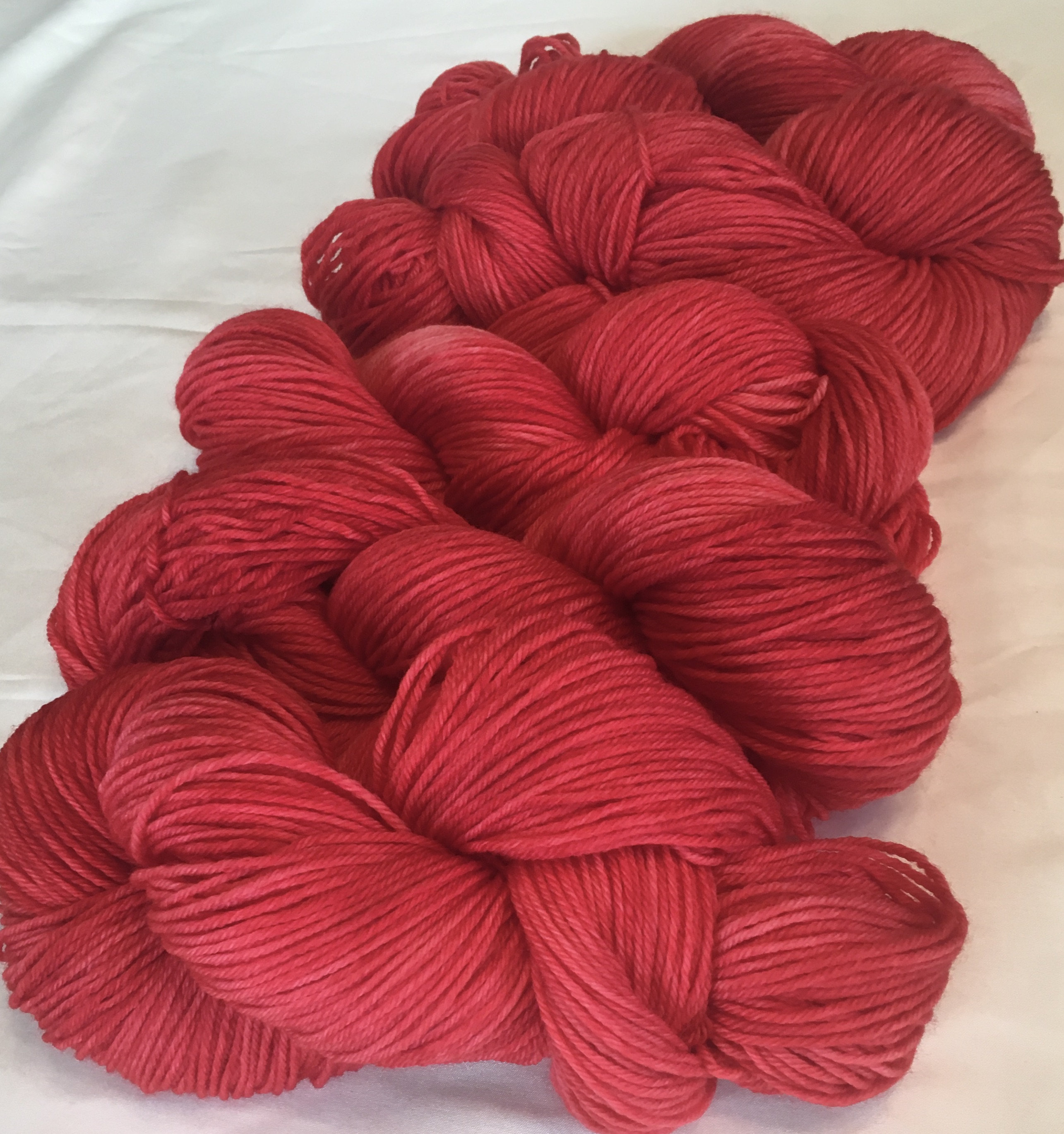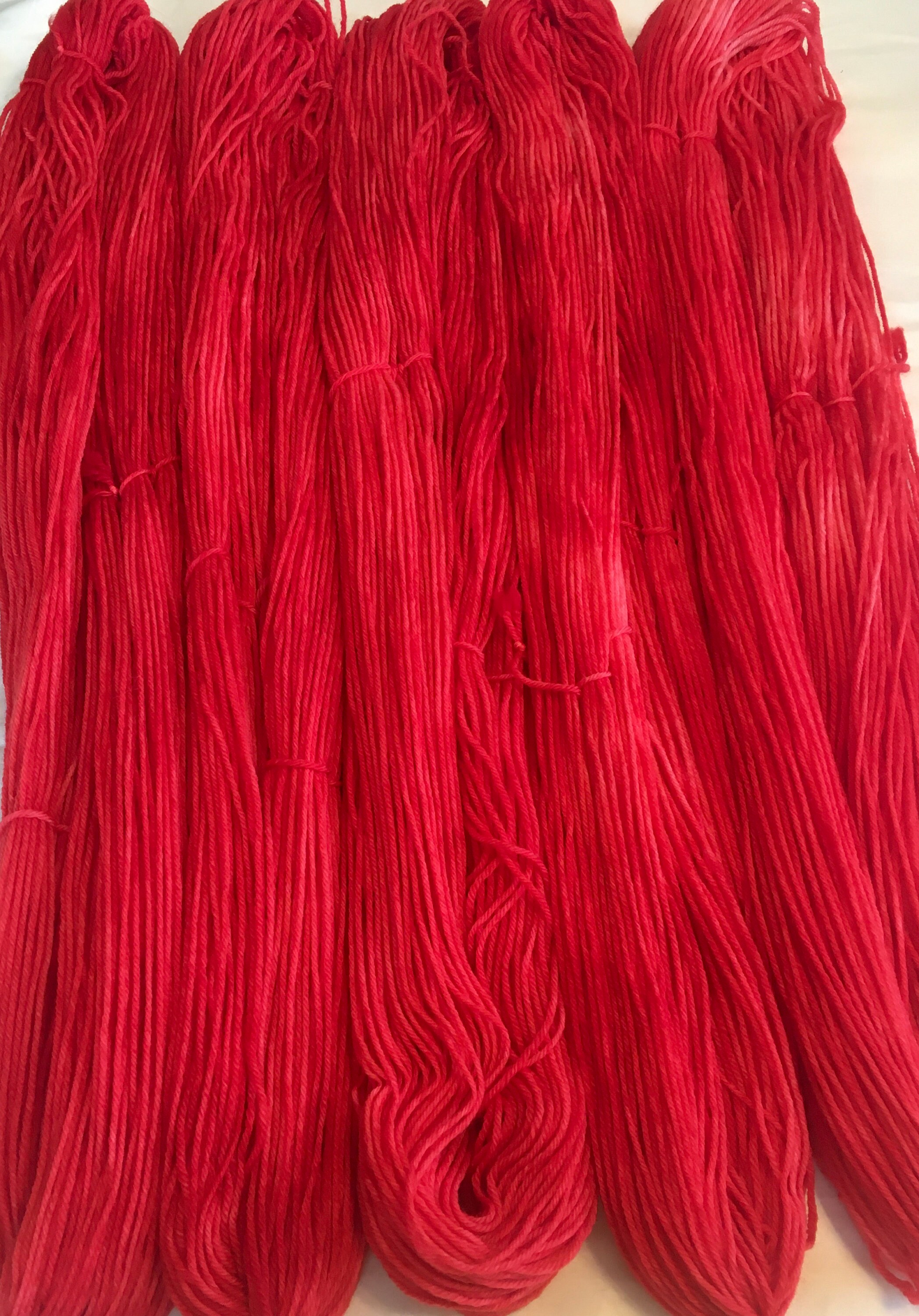 Kettle-Dyed 100% superwash Merino yarn in a bright, cheery red color. And not just red, a fabulous candy apple red! You won't feel blue knitting with this yarn!