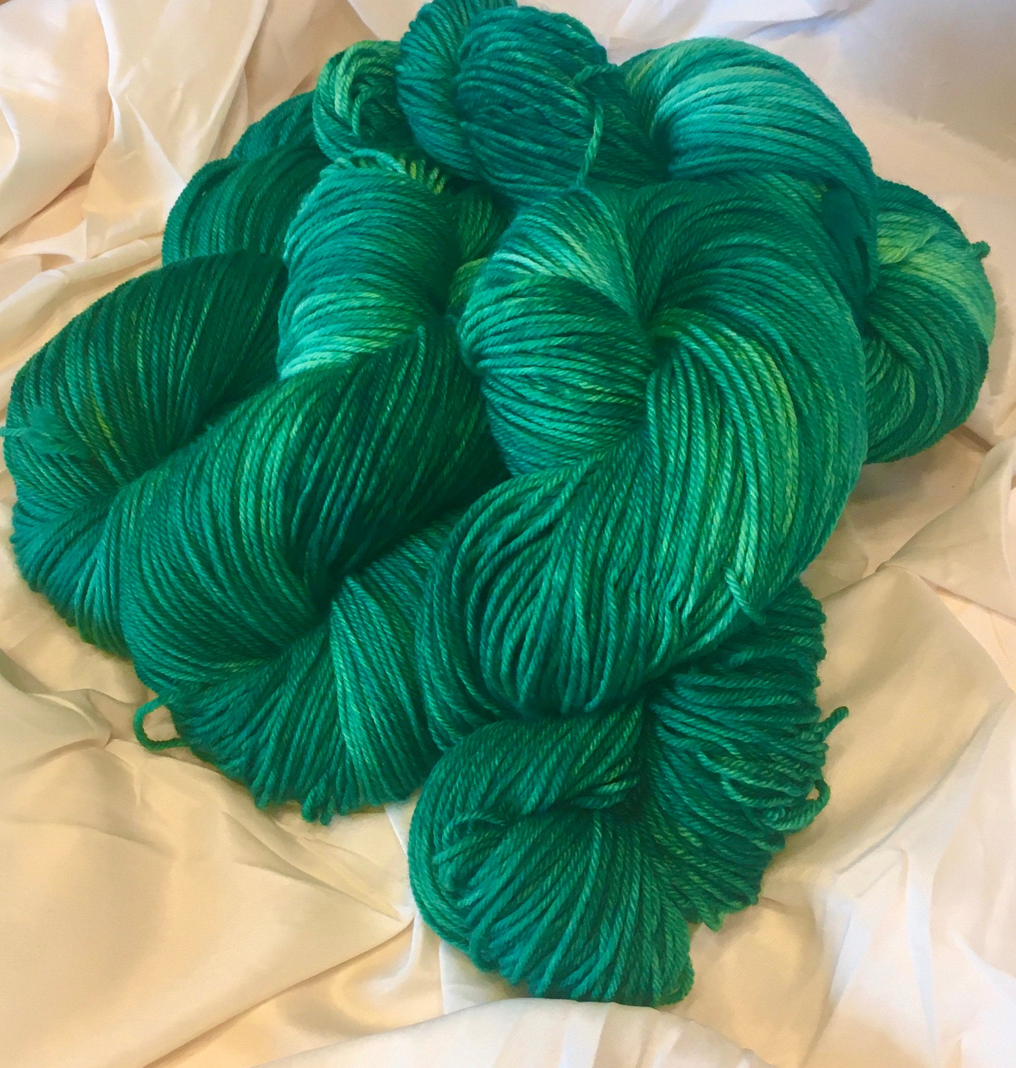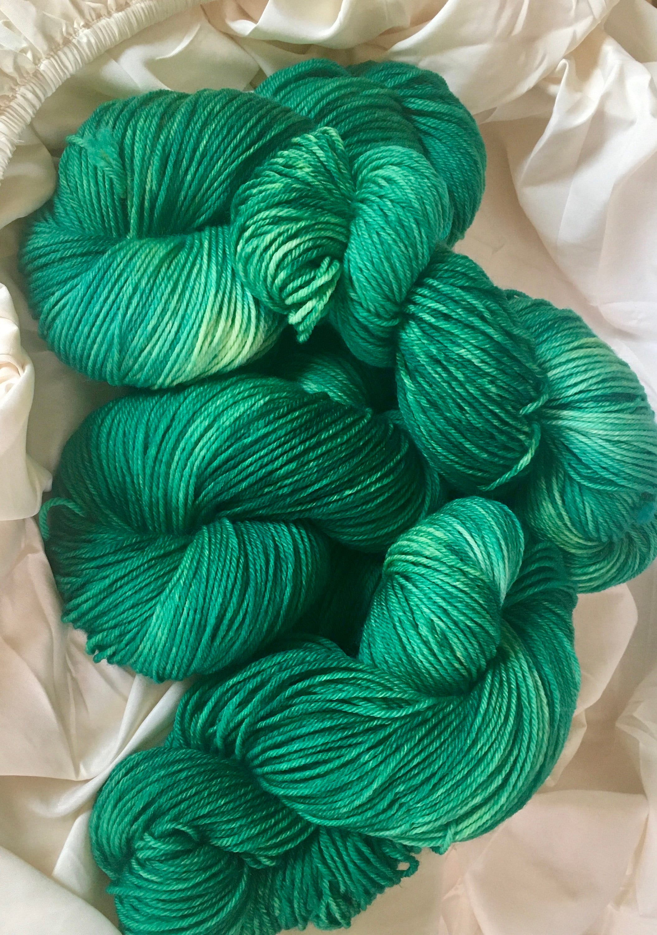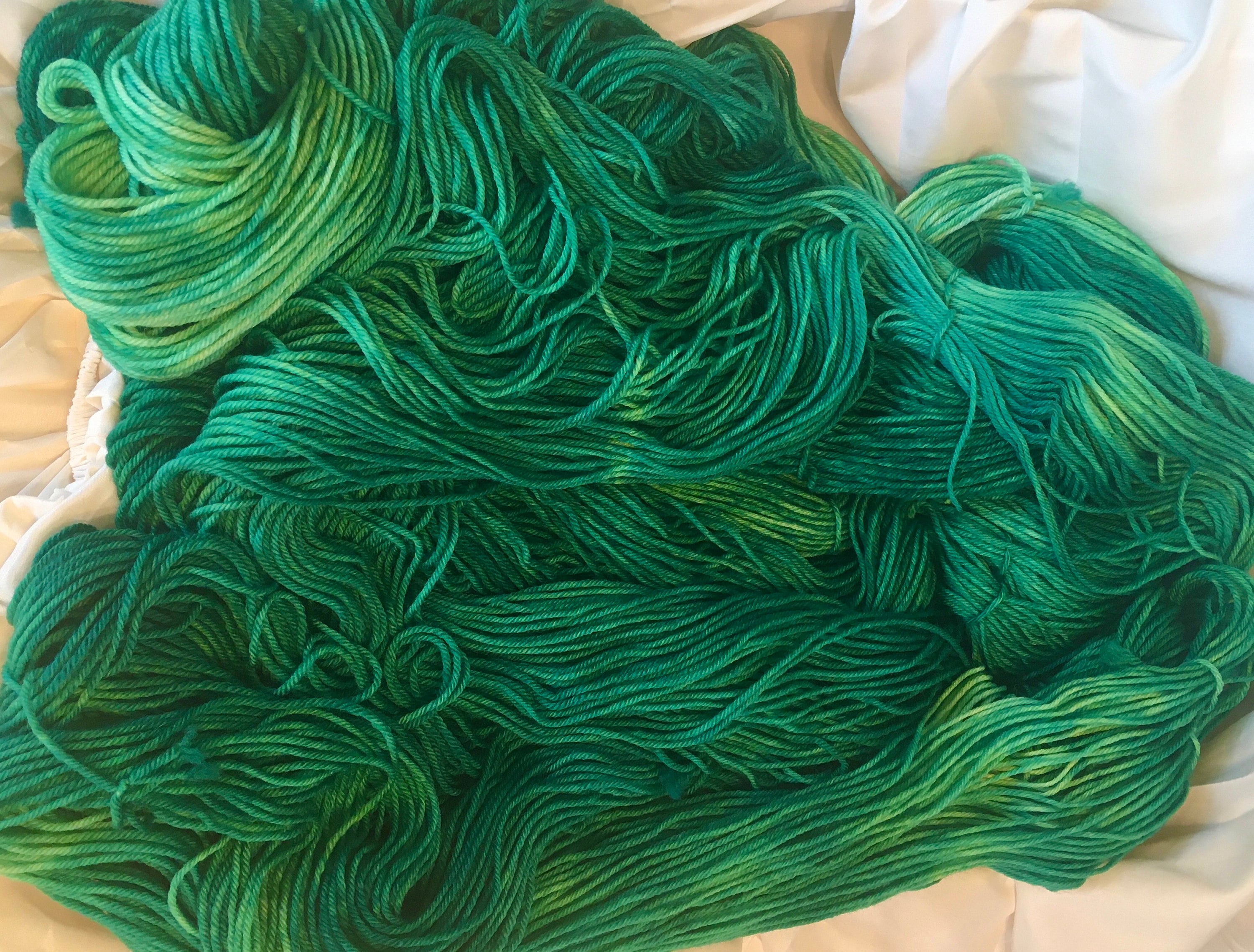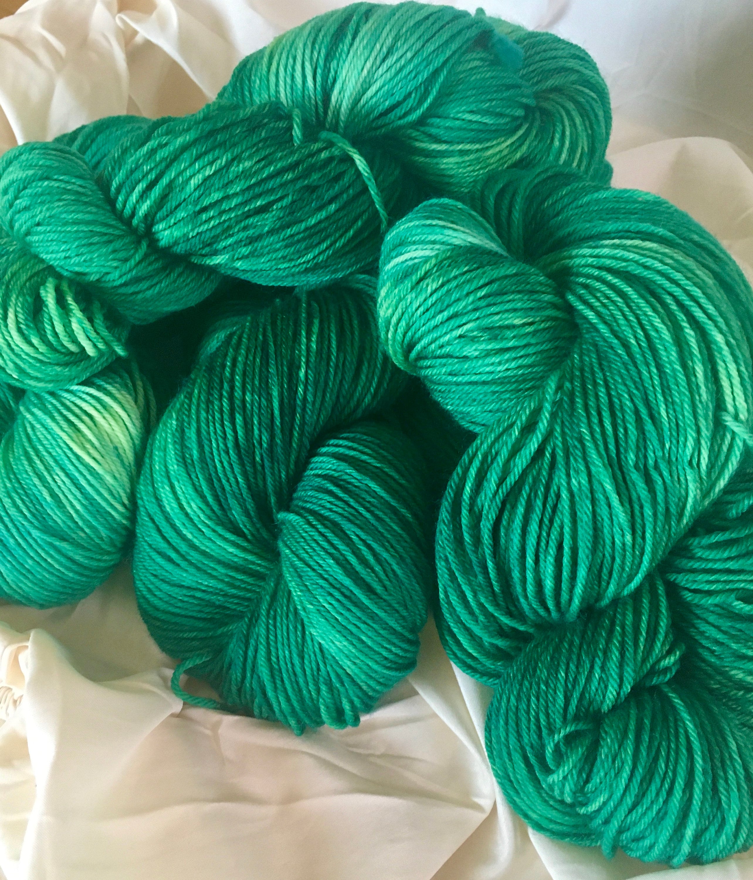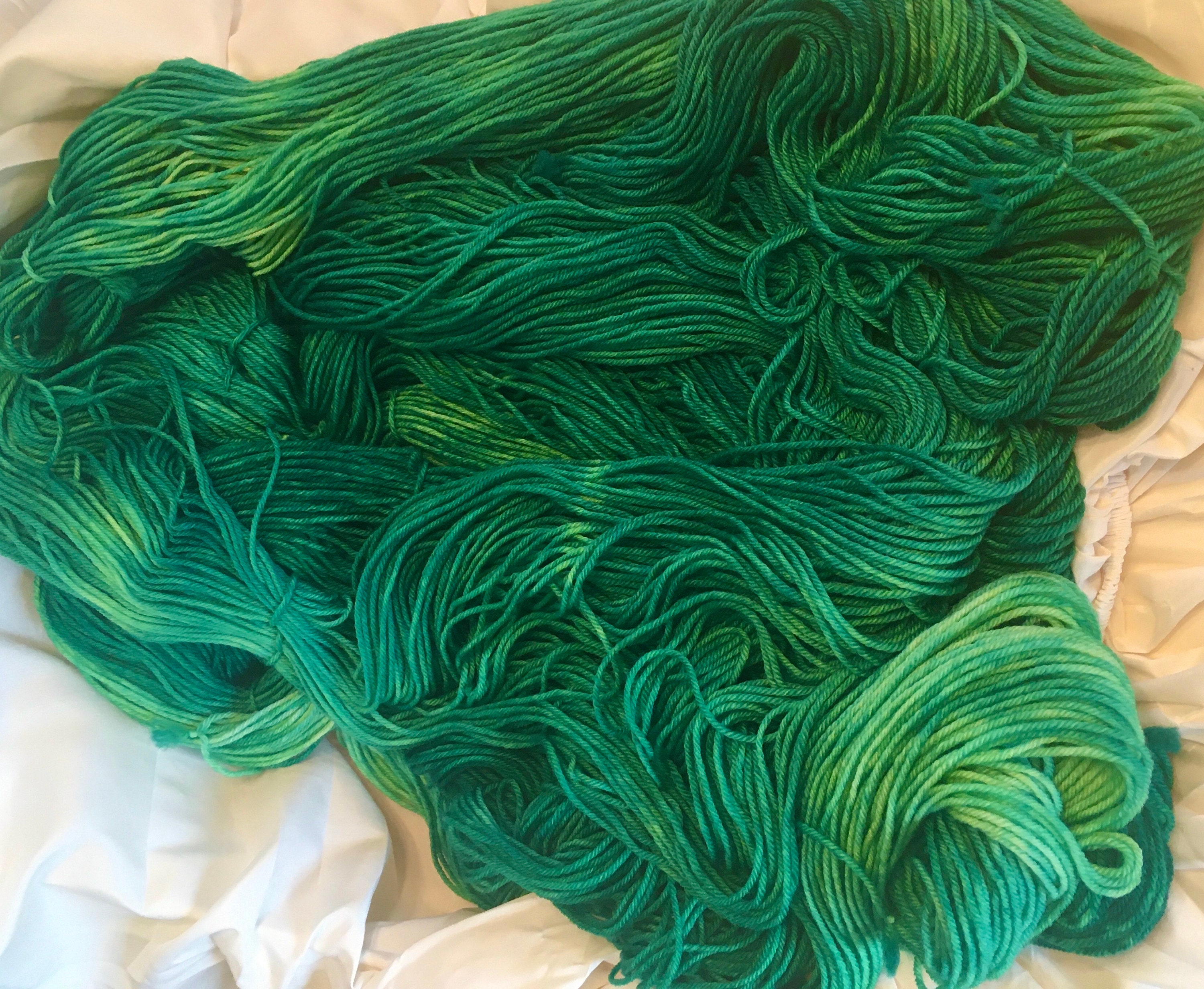 Kettle-Dyed 100% super wash Merino yarn In a sparkling emerald green color with added splashes of yellow. Kettle-dyeing creates a unique finished product and no two skeins of yarn are exactly alike. This is a soft yarn and would make delicious and warm mittens, hats, scarves, sweaters, etc. 246 yards per 3.5 oz. hank of yarn.