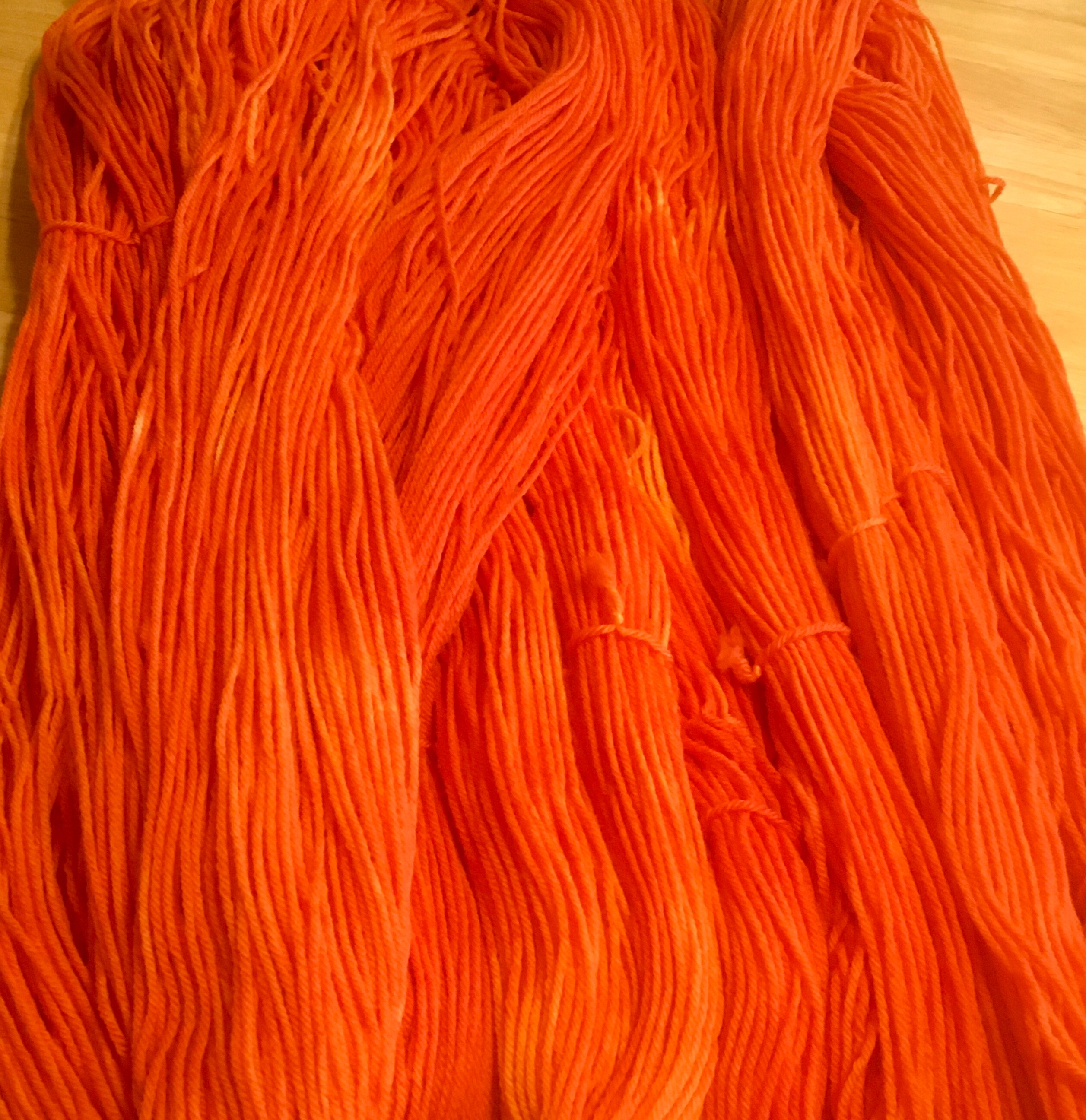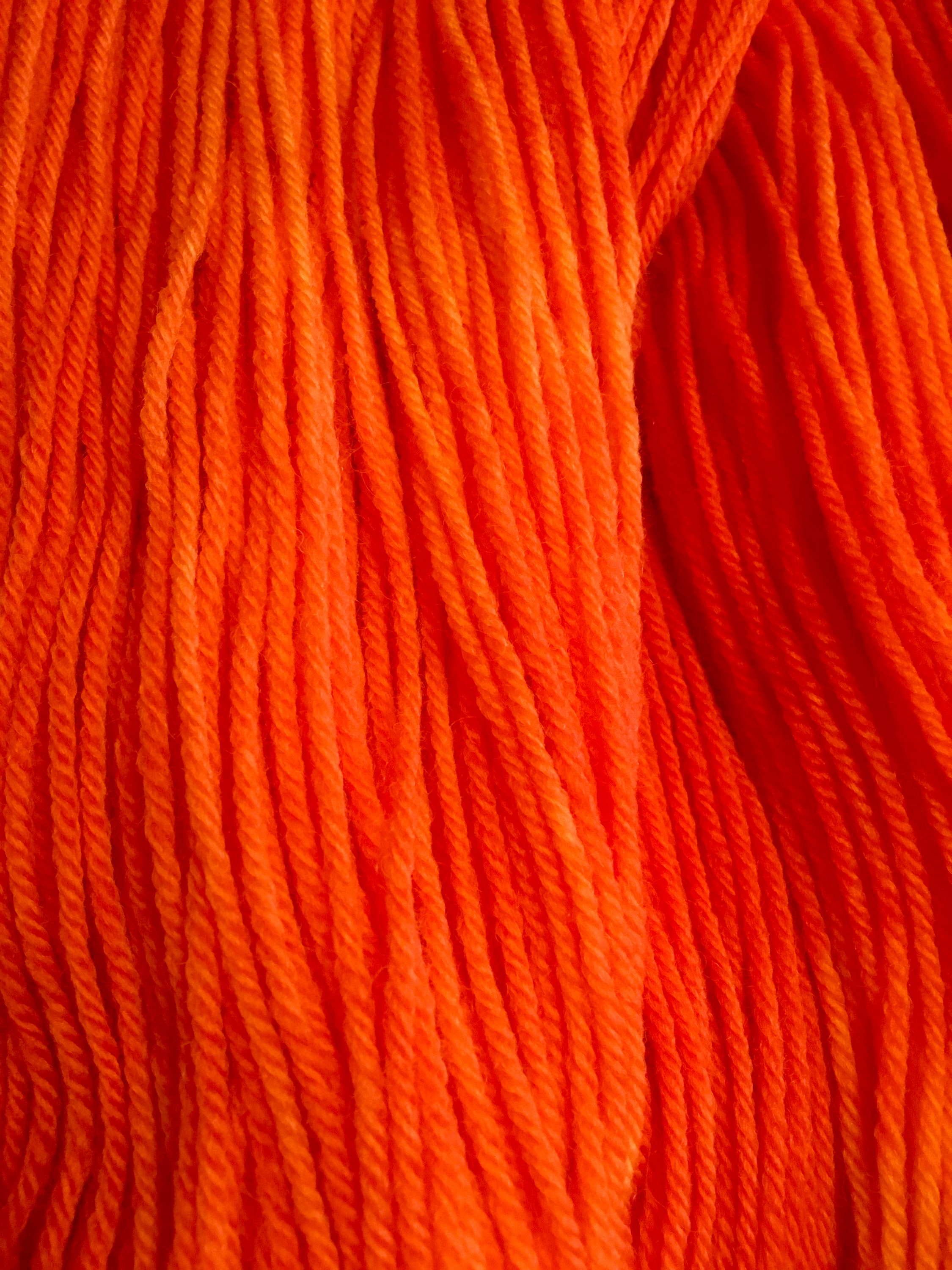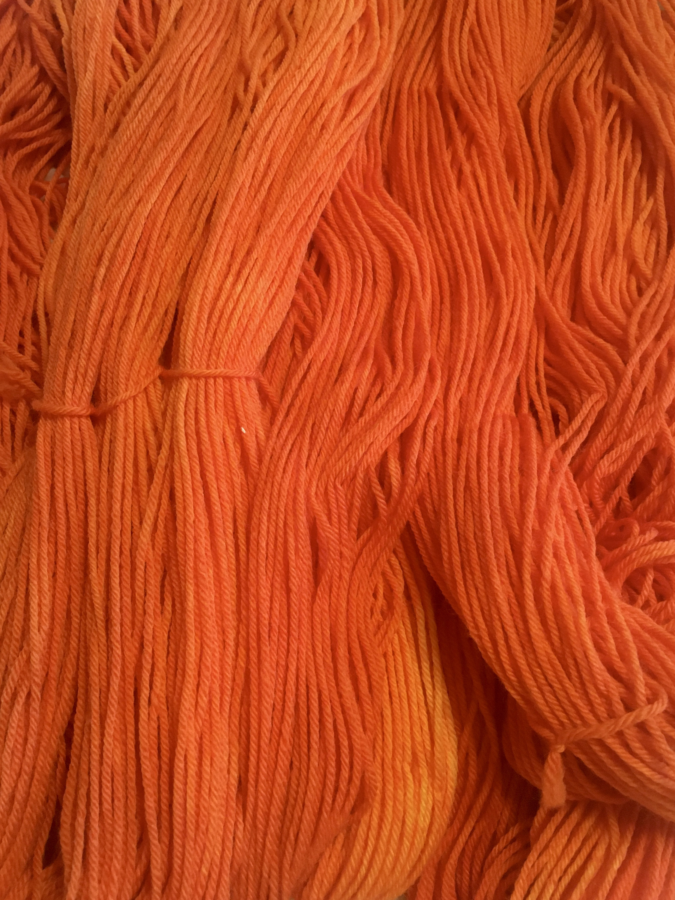 Kettle-Dyed 100% superwash Merino yarn in a bright, juicy orange color with added splashes of yellow. You might just get your RDA of Vitamin C knitting with this yarn!