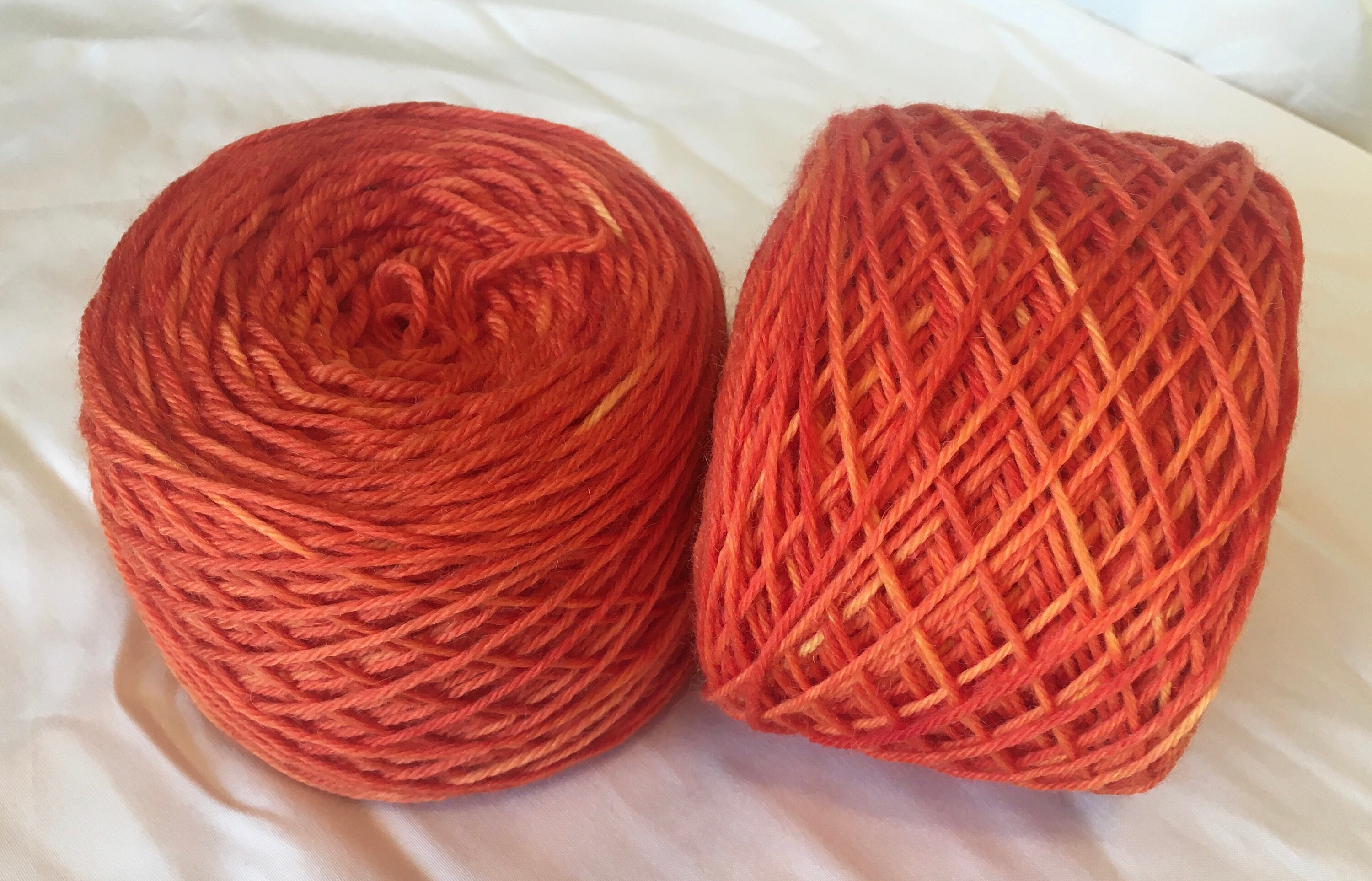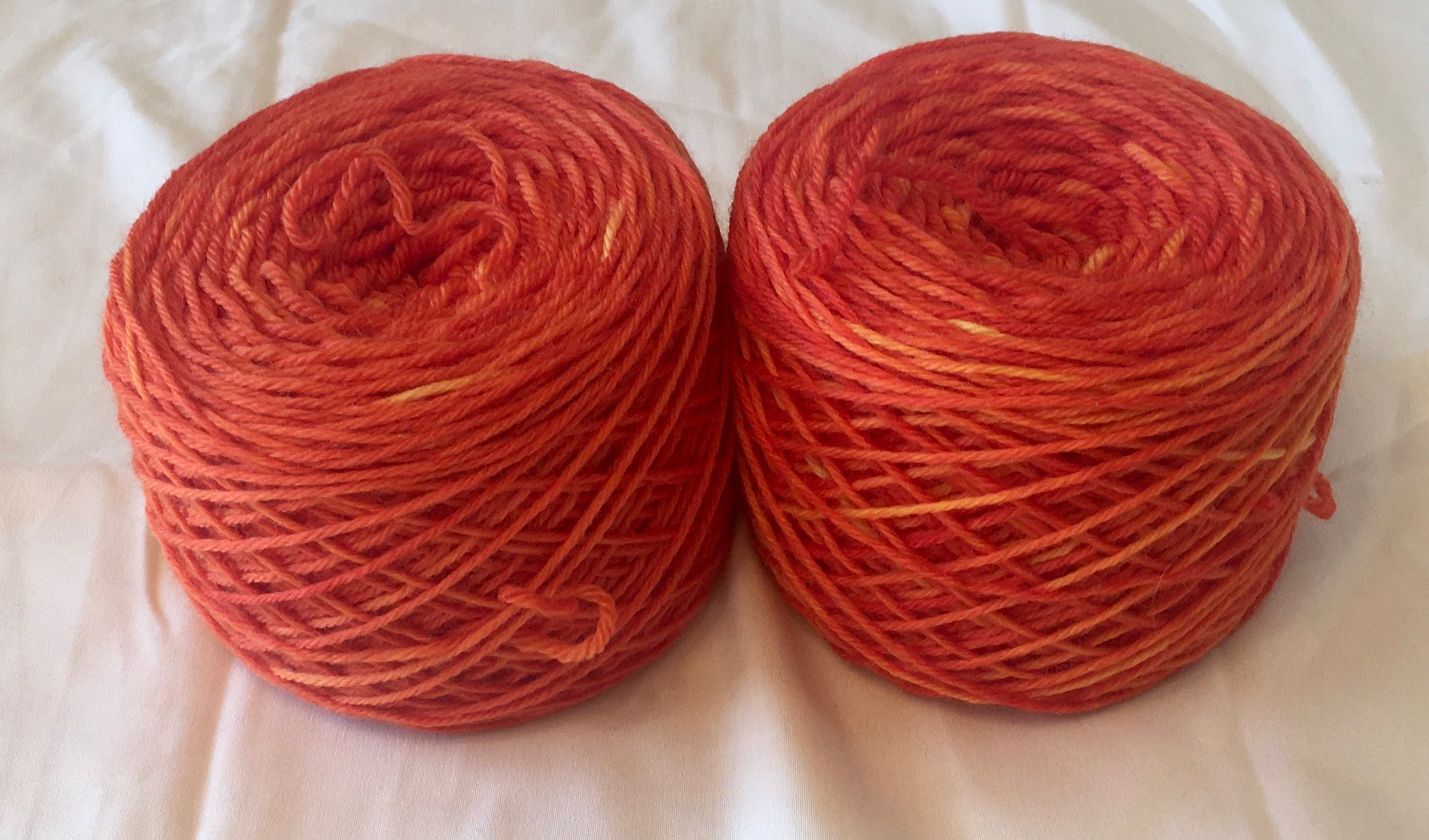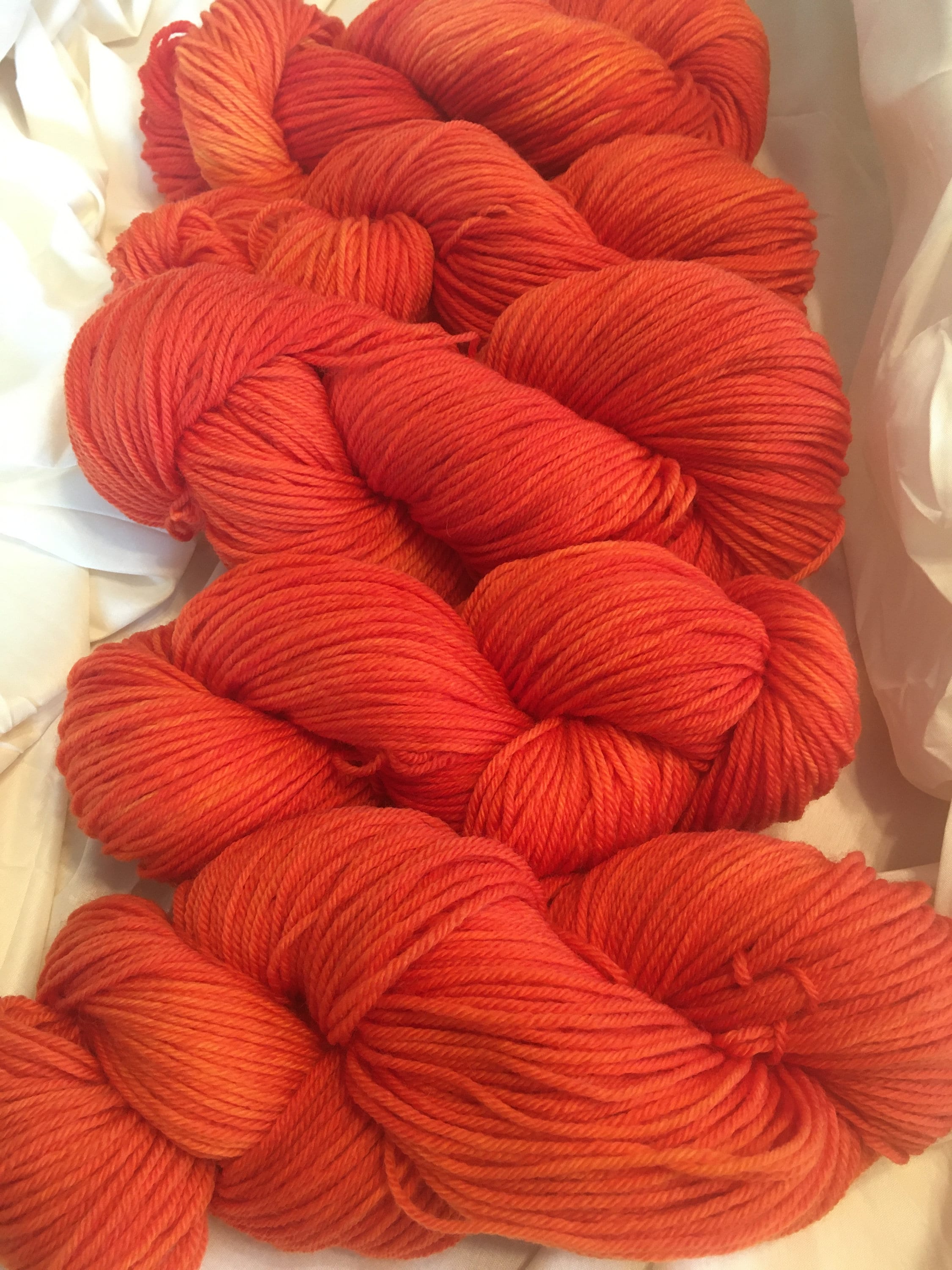 Kettle-Dyed 100% superwash Merino yarn in a bright, juicy orange color with added splashes of yellow. You might just get your RDA of Vitamin C knitting with this yarn!