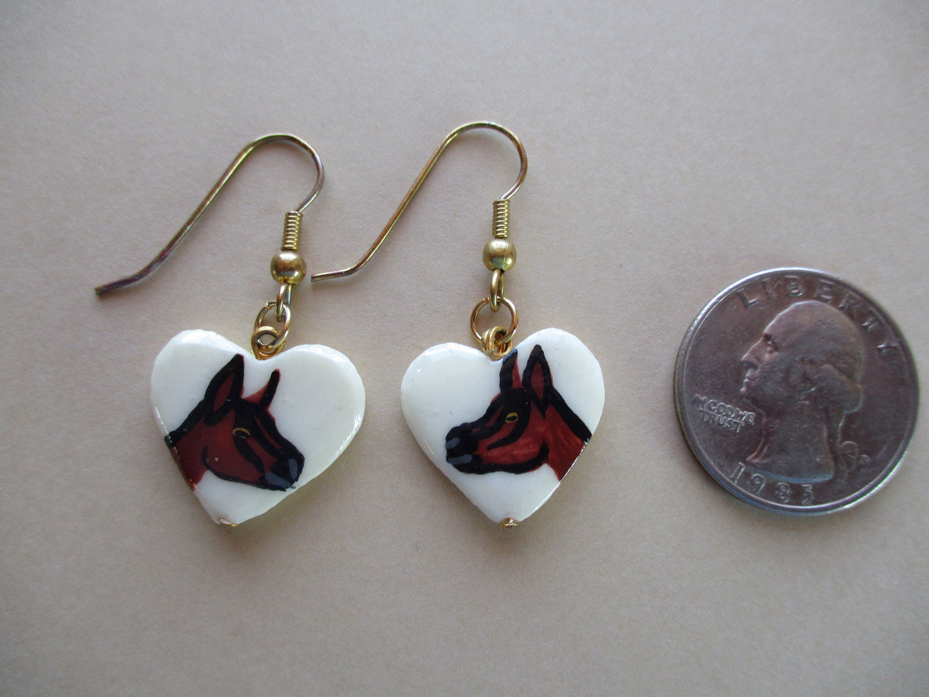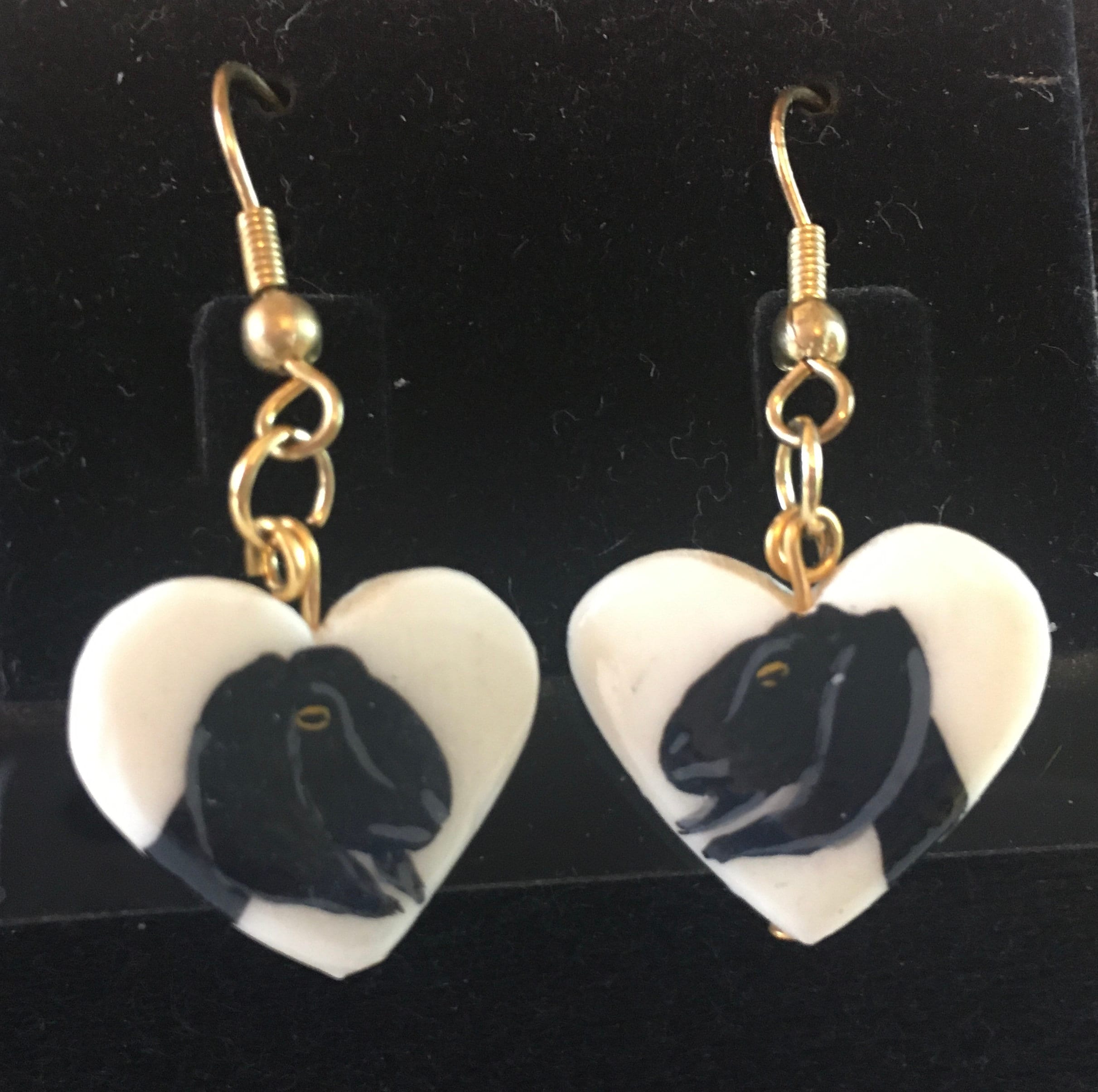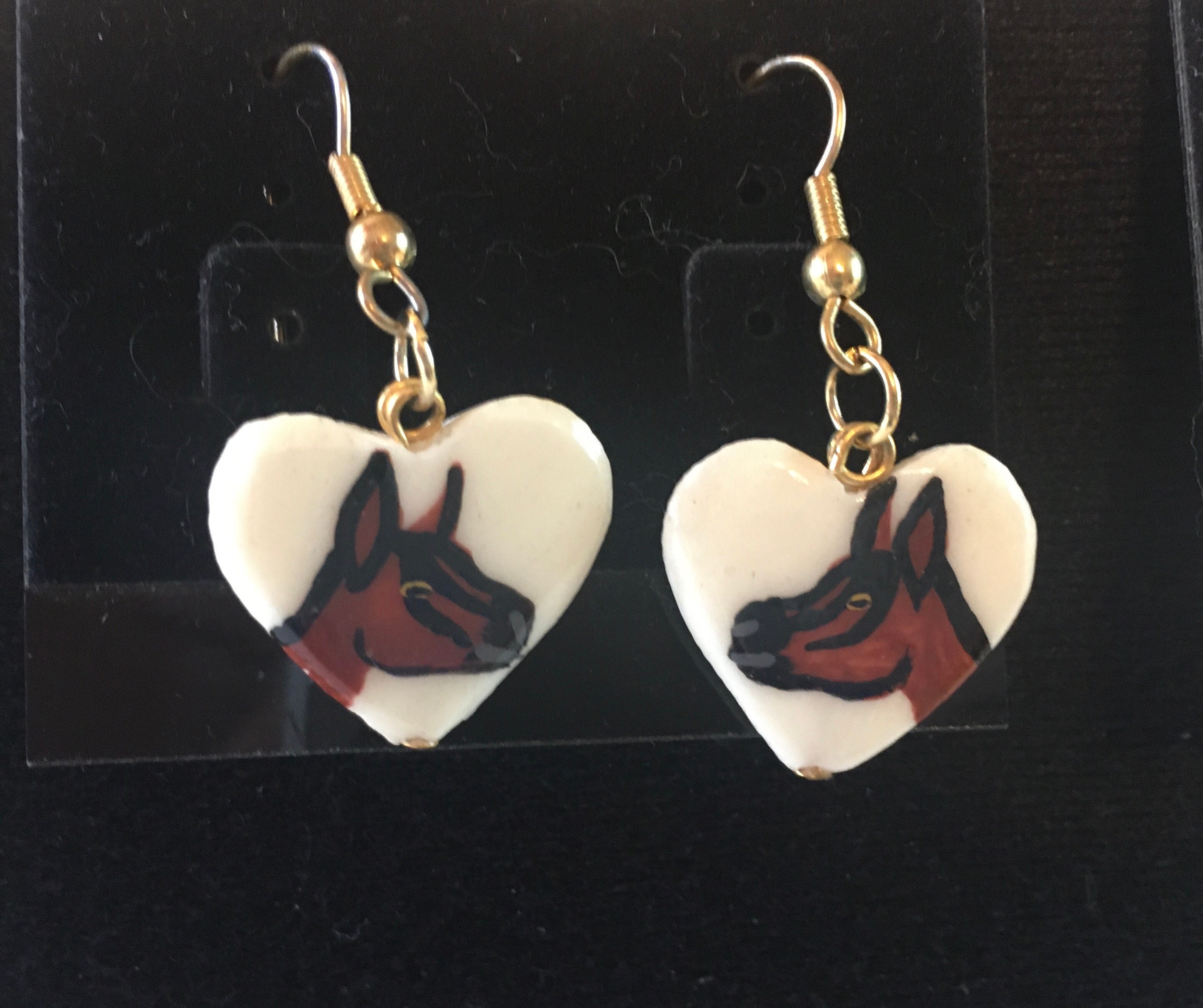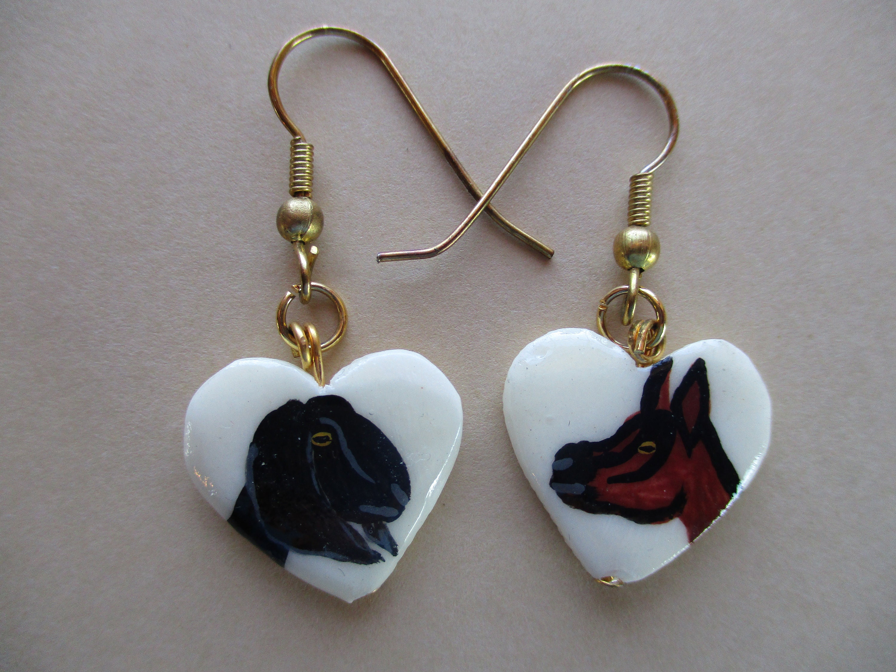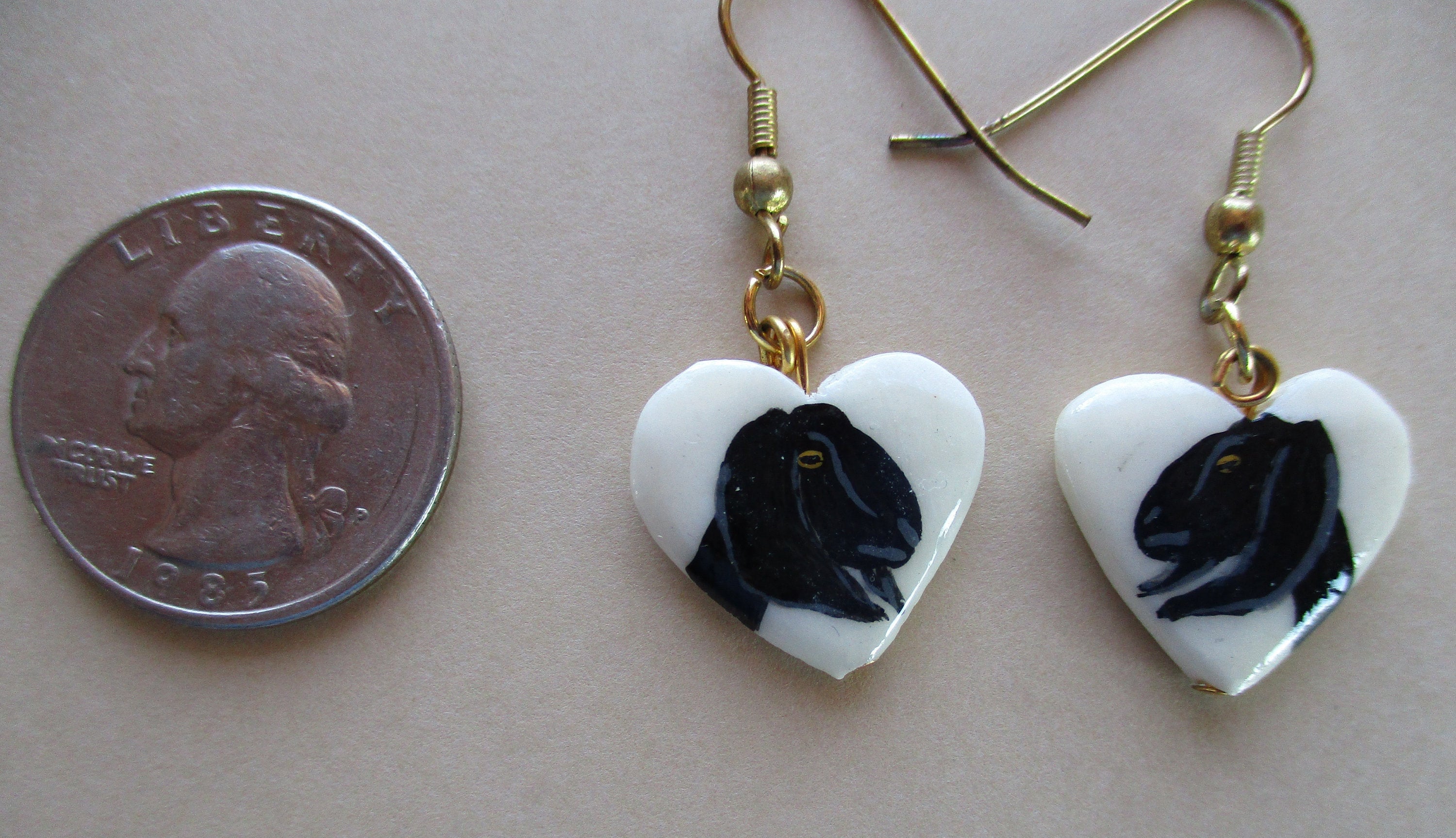 Wonderful hand painted left & right facing goat heads; painted on heart-shaped beads & hung on gold plated ear wires. Only one pair each of Nubian & Oberhasli is remaining.