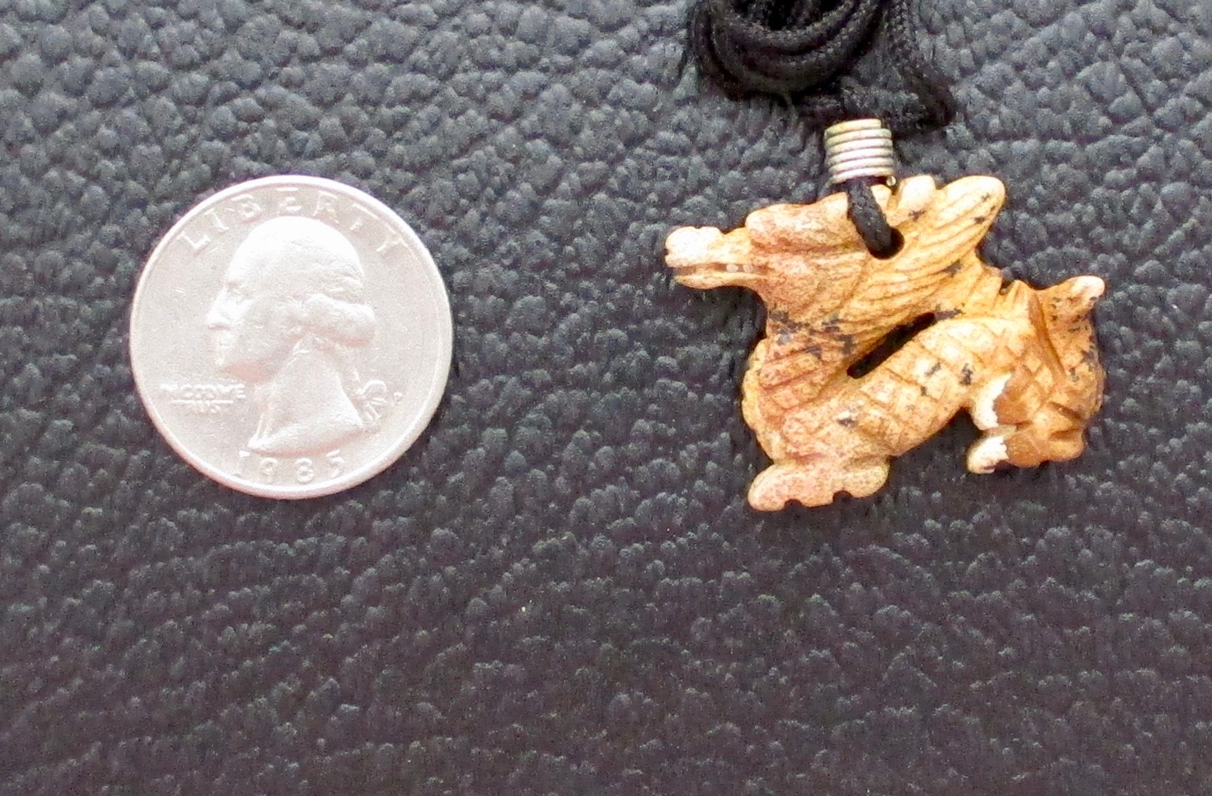 These fierce dragons were carved 20+ years ago. We have seen similar ones that aren't as detailed as these. These guardian dragons are 1.5" wide, 1" tall and 5/8" wide. They are hung on black satin cords.