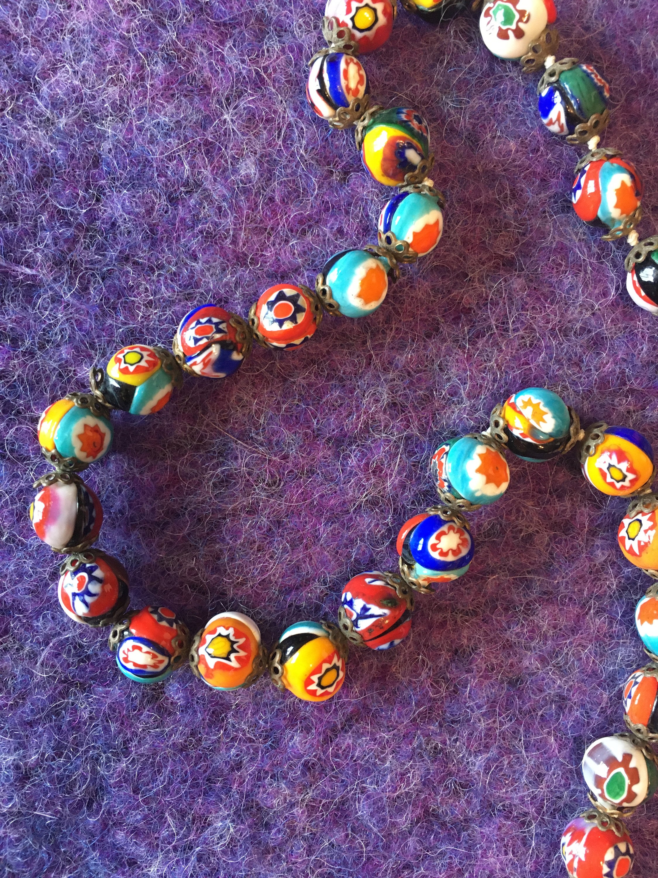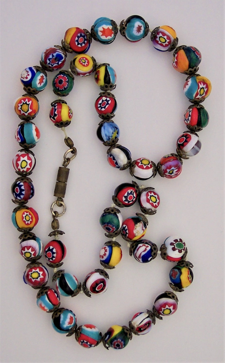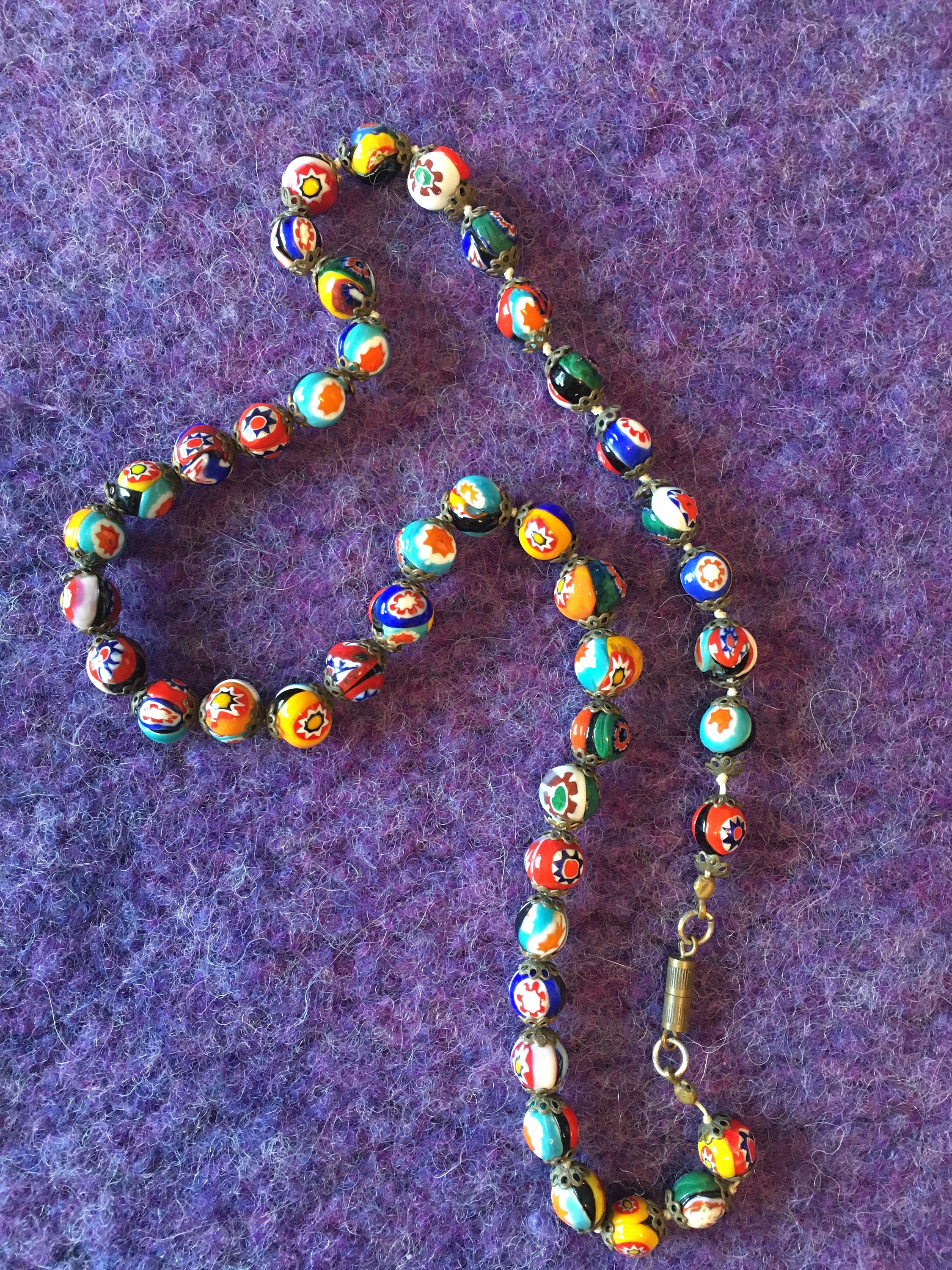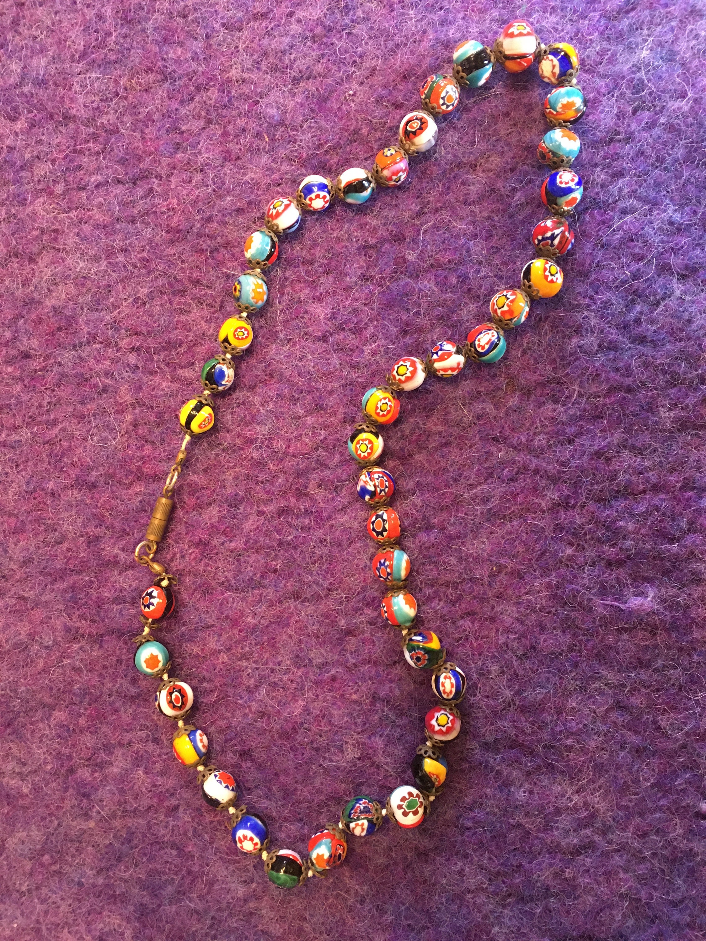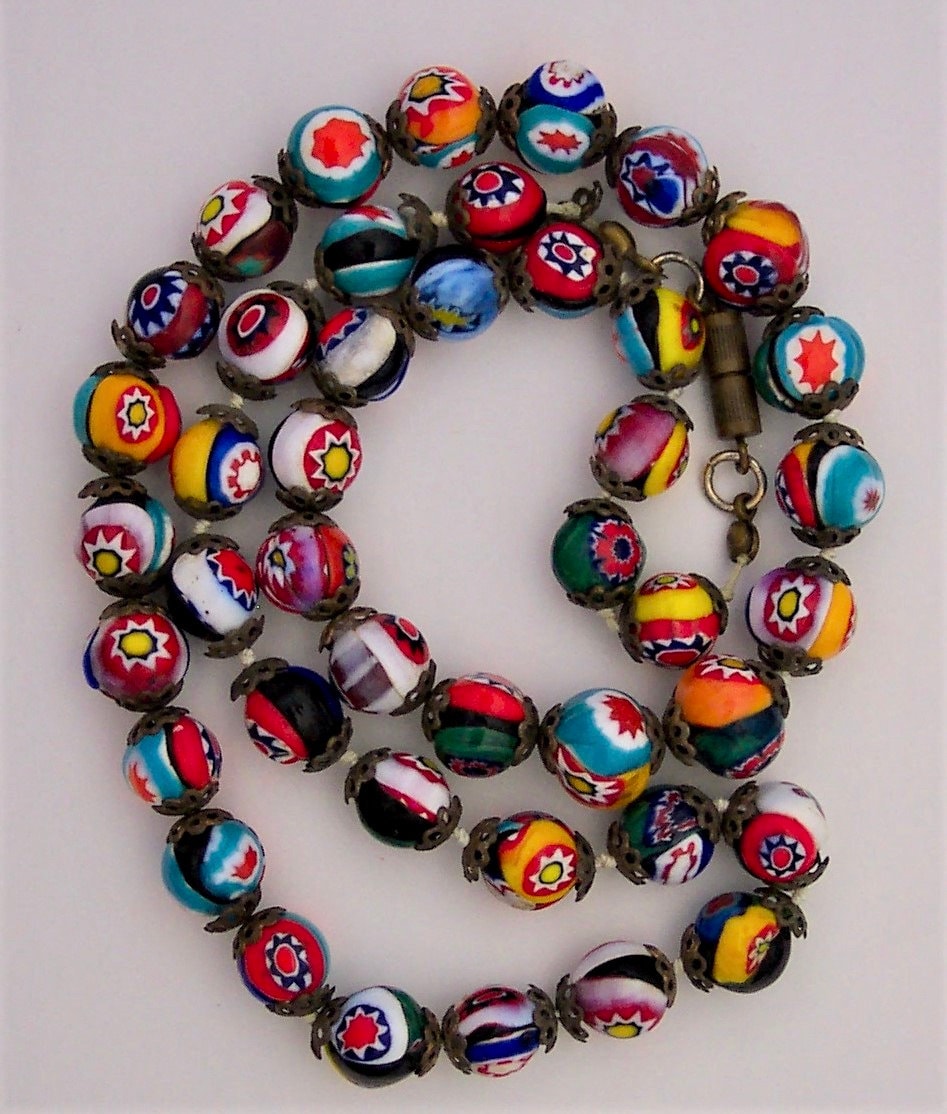 This is a vintage (1960's/'70's) glass millefiori bead necklace from Murano, Italy. Â Each bead is capped and the cord is knotted between each bead. Â There are 43 beads total and the necklace is 19" in circumference. Â Bead size varies between 1/4" & 3/8" in diameter. Â The screw clasp is original. Â We have not attempted to clean the necklace; we will leave that to the buyer's discretion.