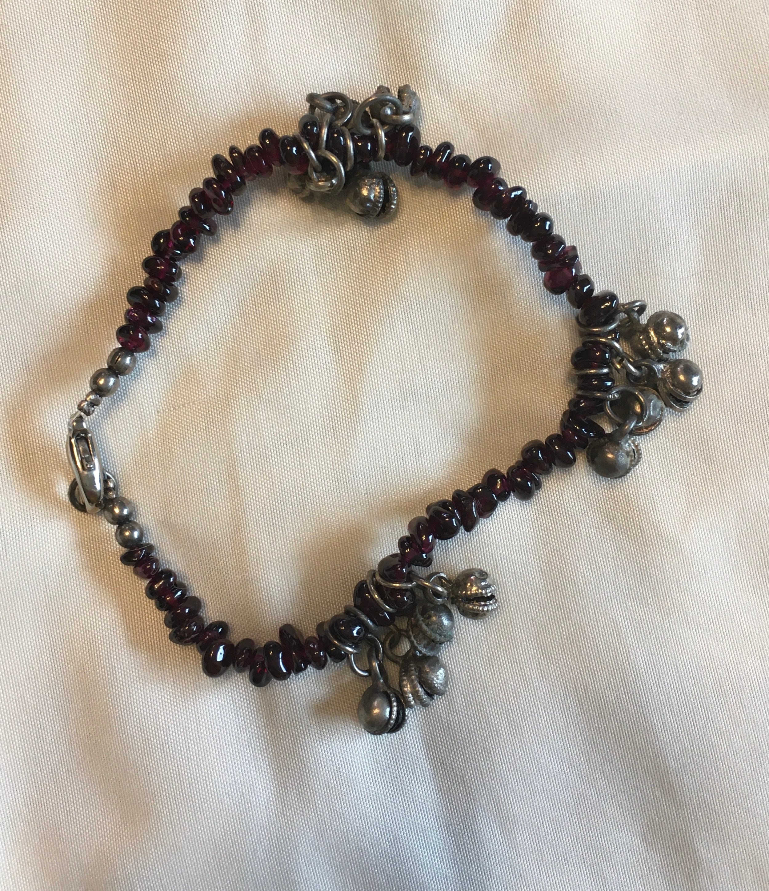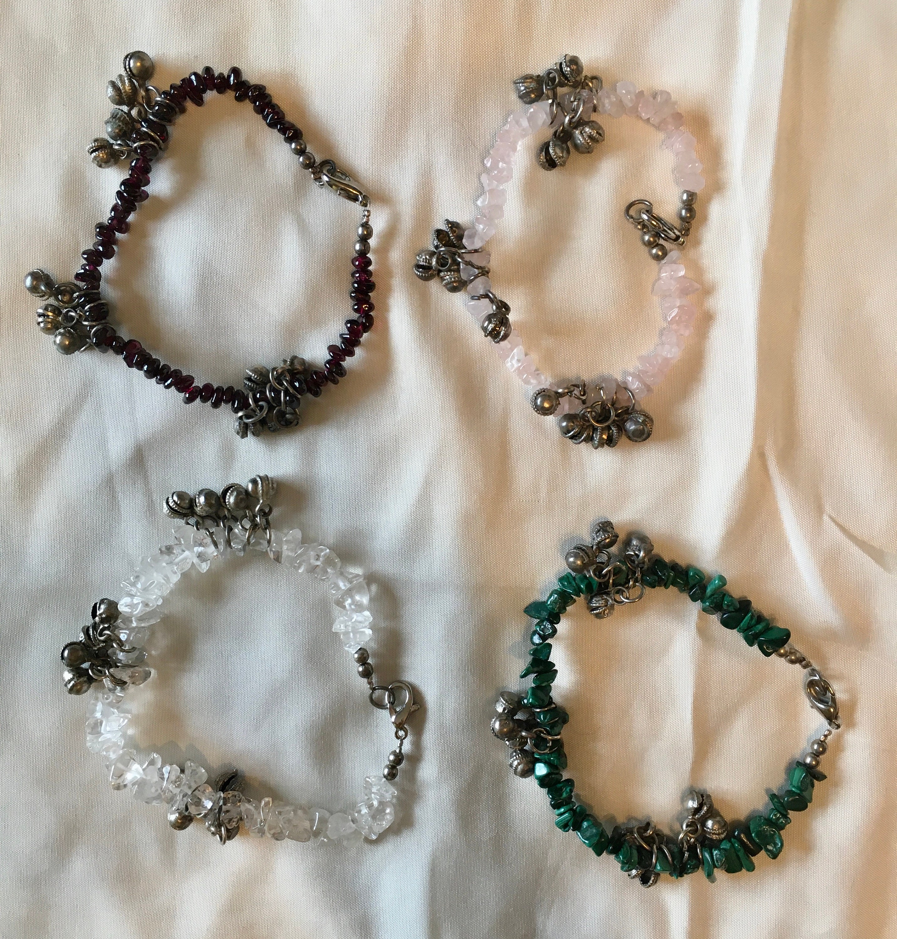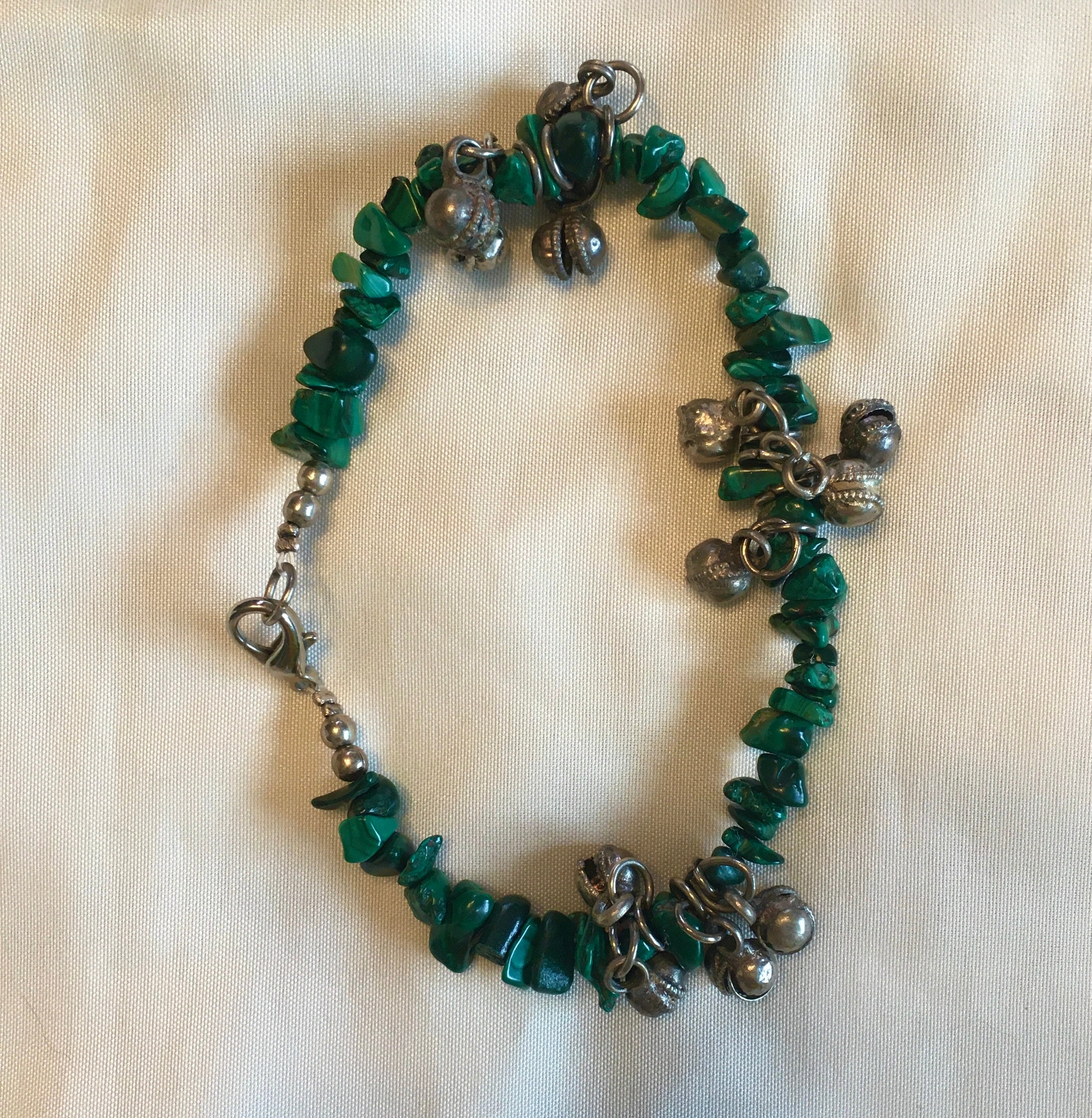 Summer is coming! How cool would it be to show off those bare ankles by wearing one of these vintage ankle bracelets? These anklets are generously sized at 9 inches to fit most ankles and large wrists. They were made in Thailand to resemble the ankle bracelets that dancers wore with genuine gemstone (garnet/malachite/crystal quartz/rose quartz), pretend bells and a lobster claw clasp.