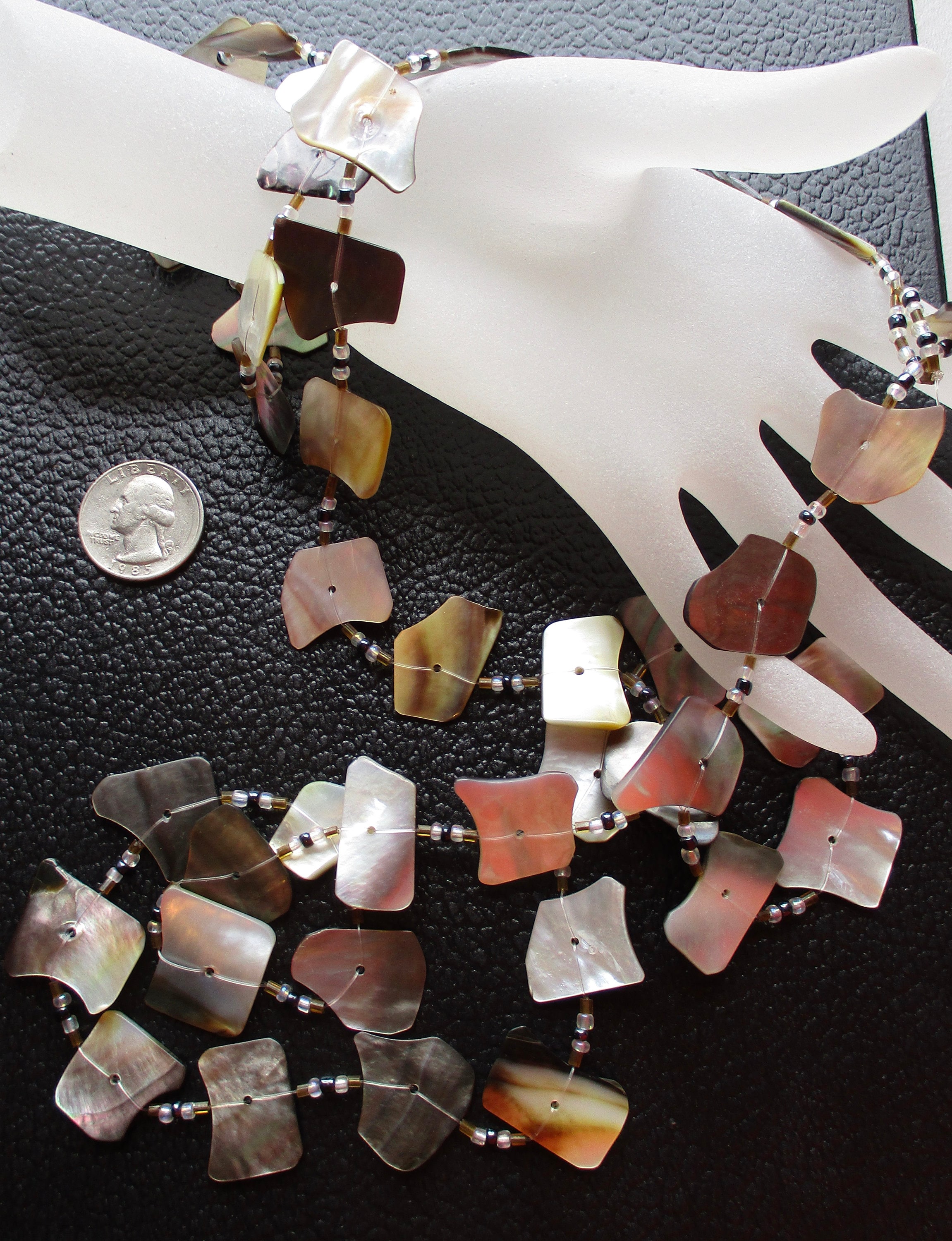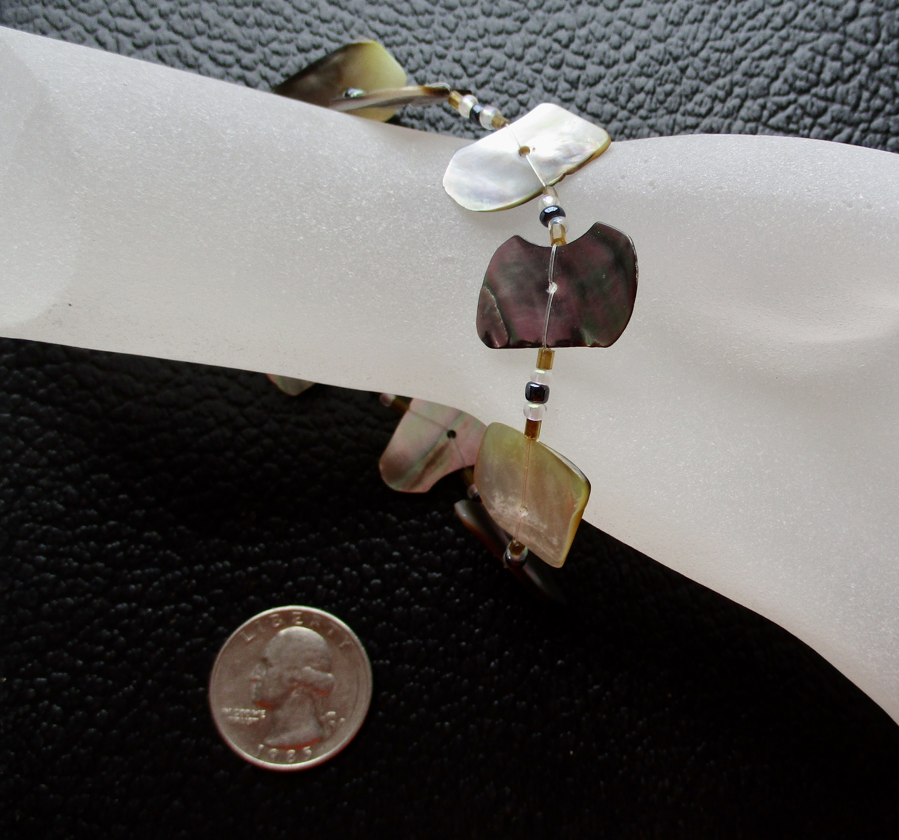 The necklace is 30" long, the bracelet is 8". The shell pieces (possibly Mother of Pearl?) have a lovely rainbow pearlescence. Each has been smoothed & buffed and a hole drilled in the middle. They are connected with a tough plastic line (fishing line?) and separated from each other with tiny glass beads.