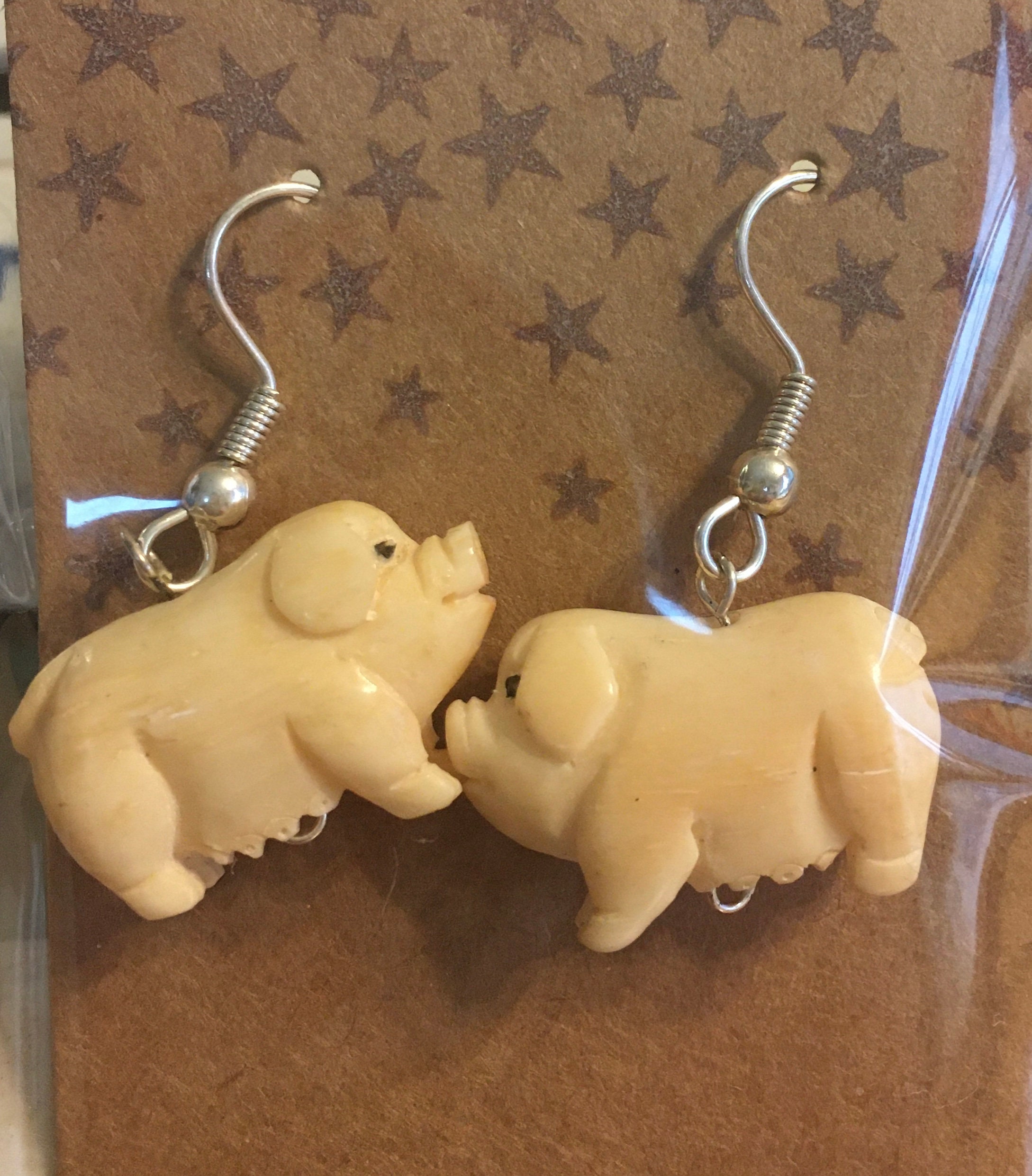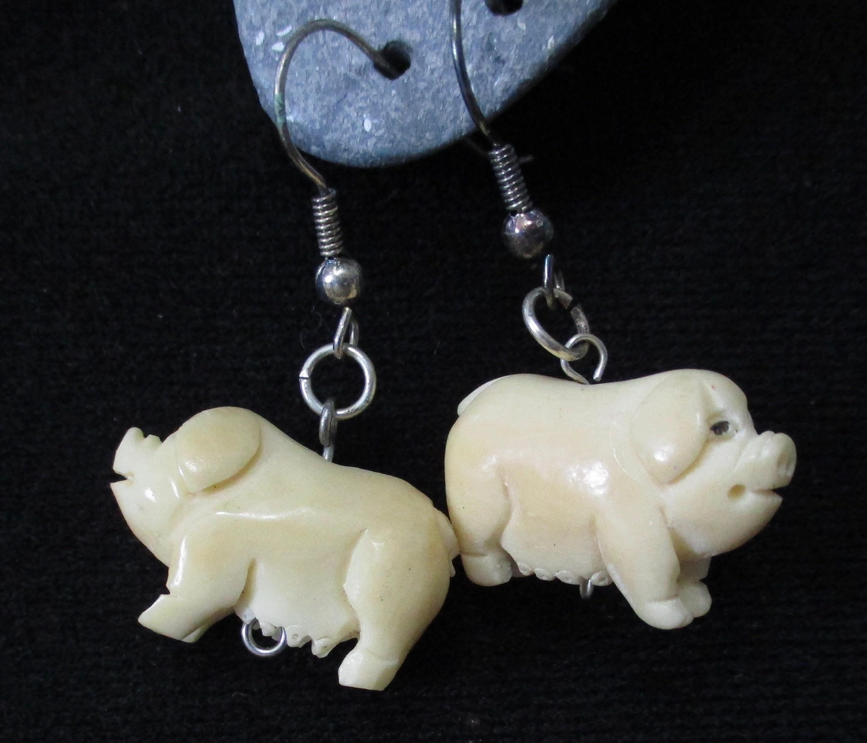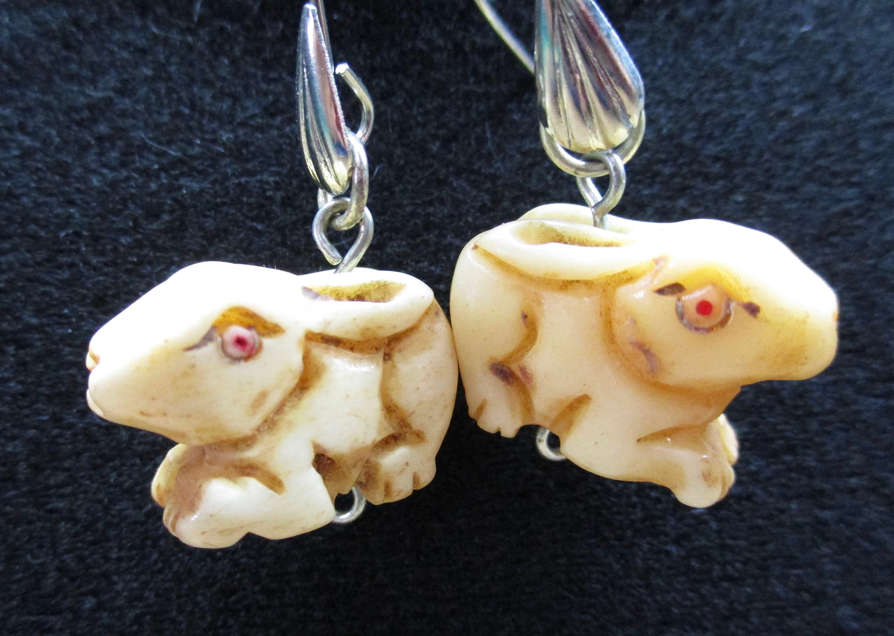 These drop-style earrings have quirky, hand-carved animal beads (pig or rabbit) with sterling silver findings.