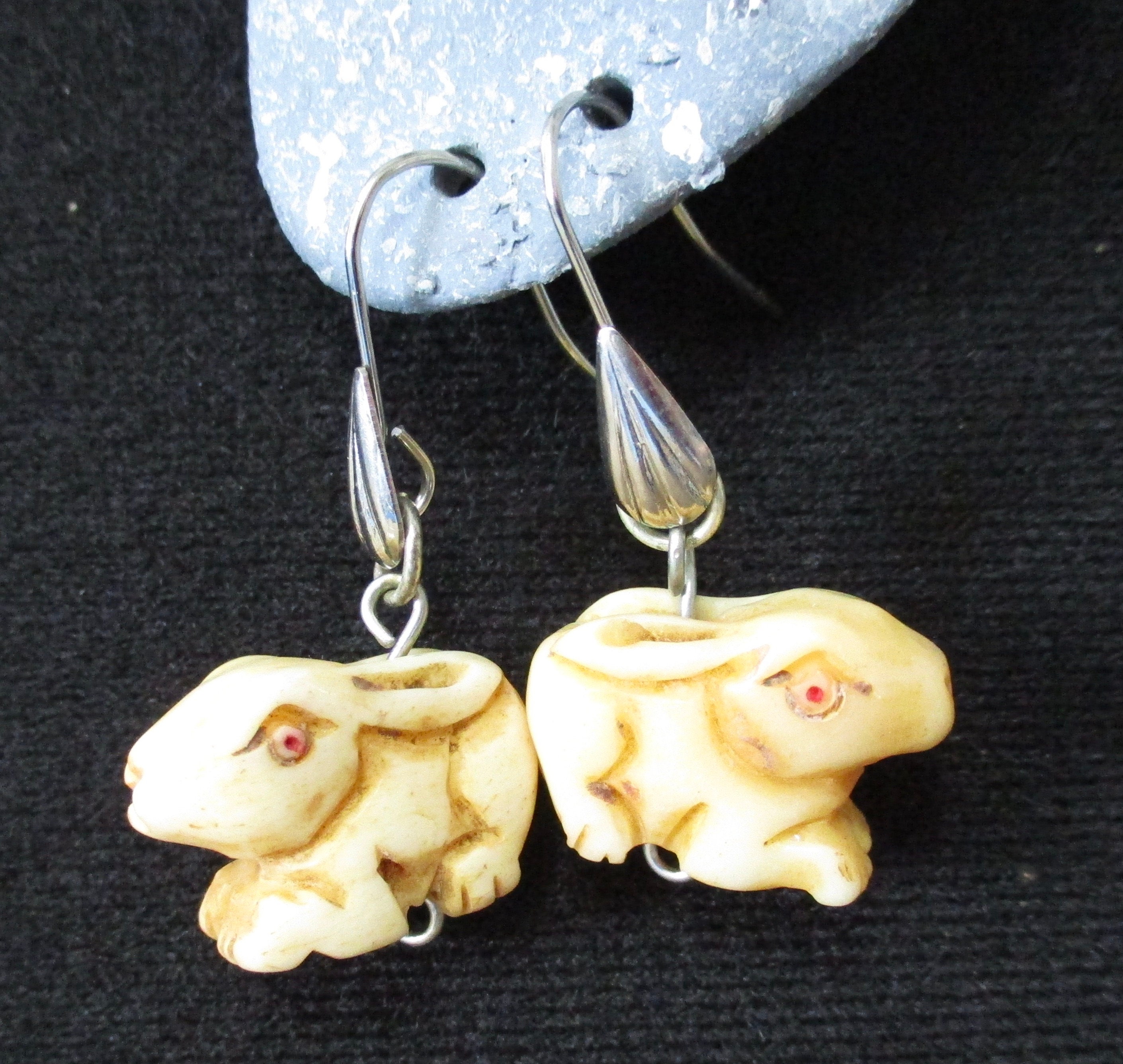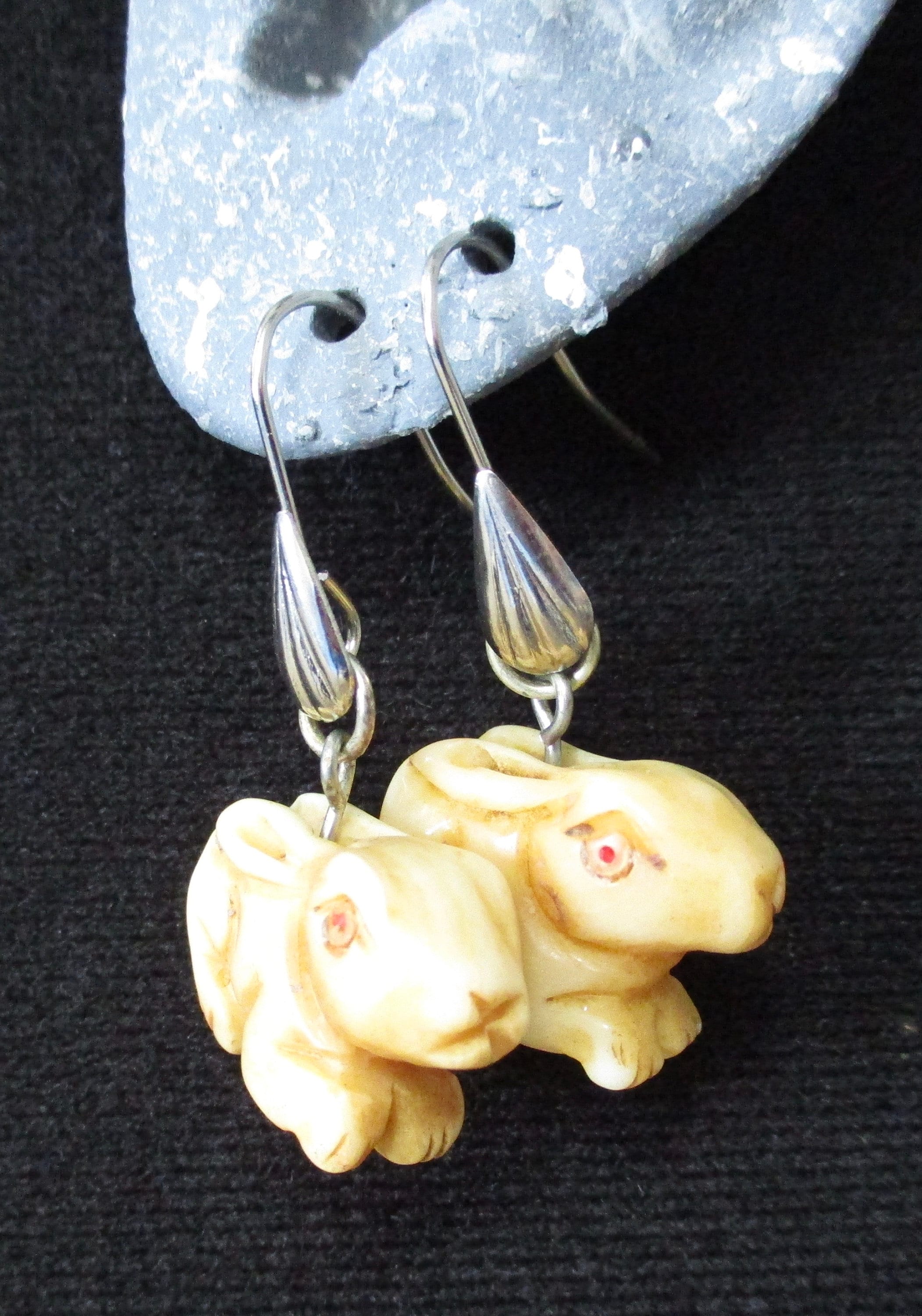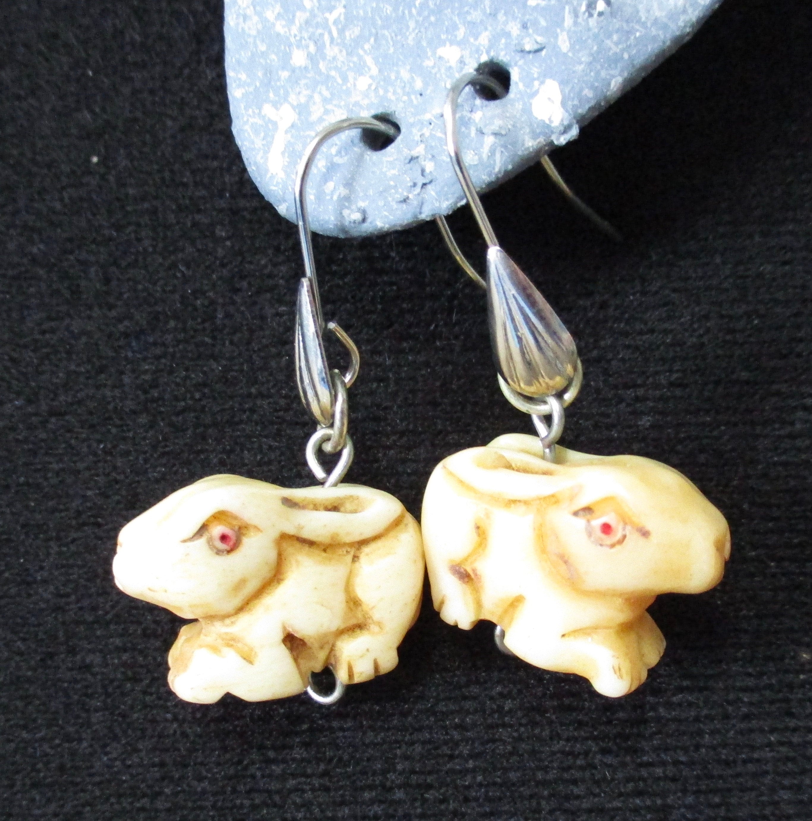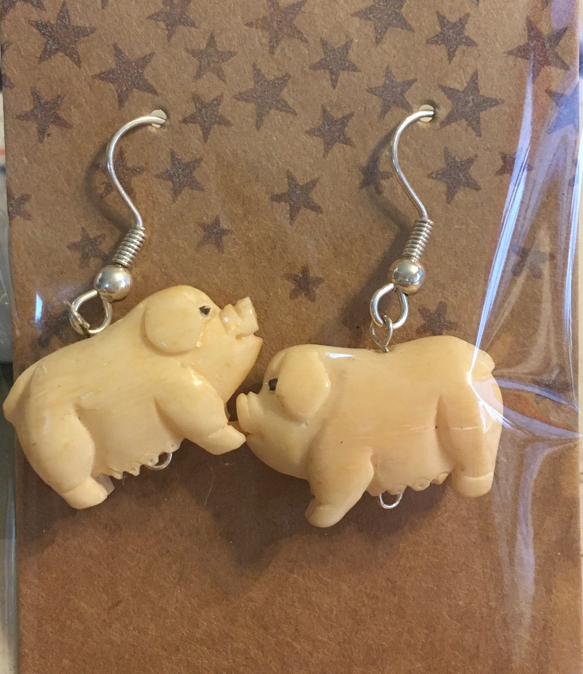 These drop-style earrings have quirky, hand-carved animal beads (pig or rabbit) with sterling silver findings.