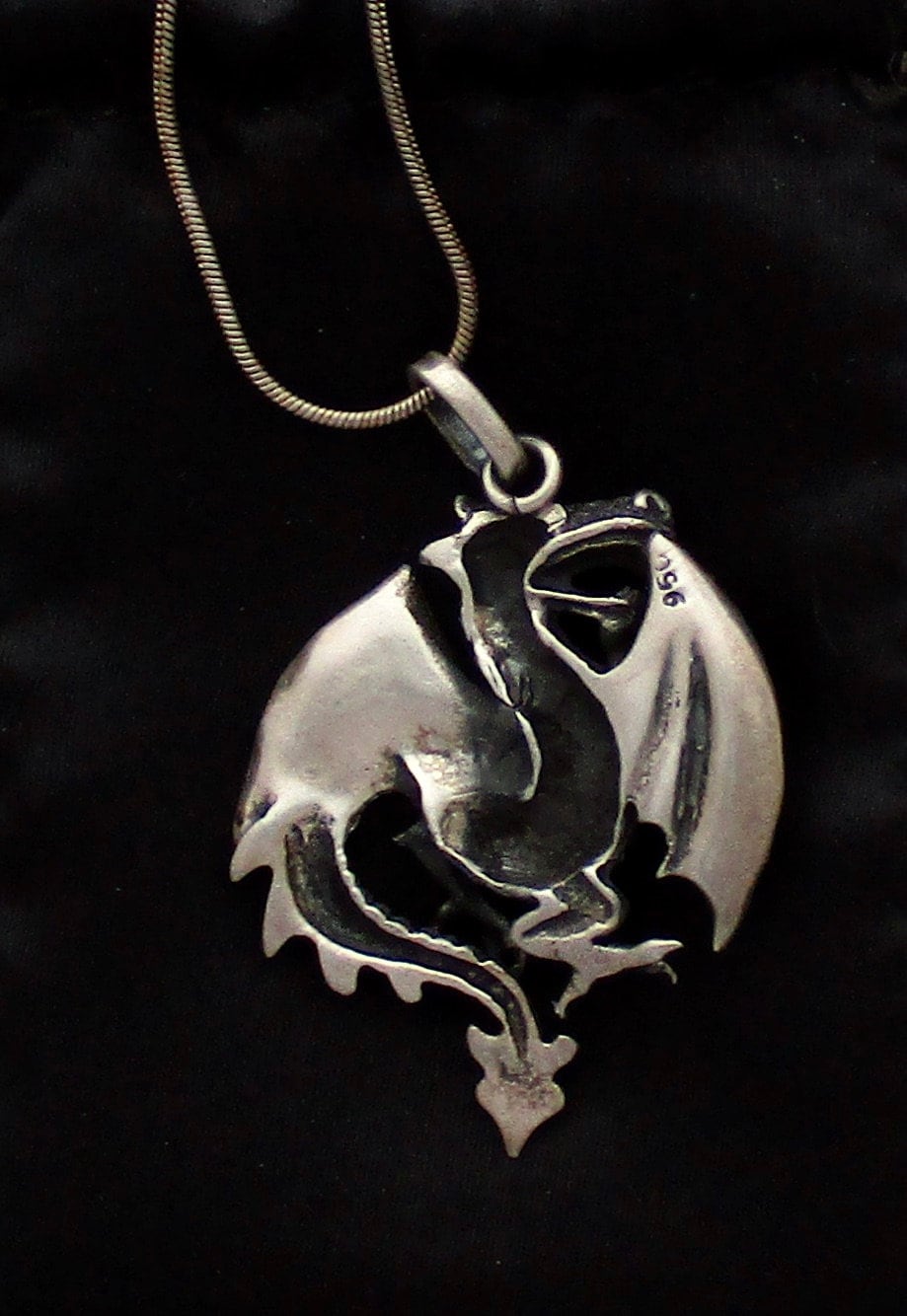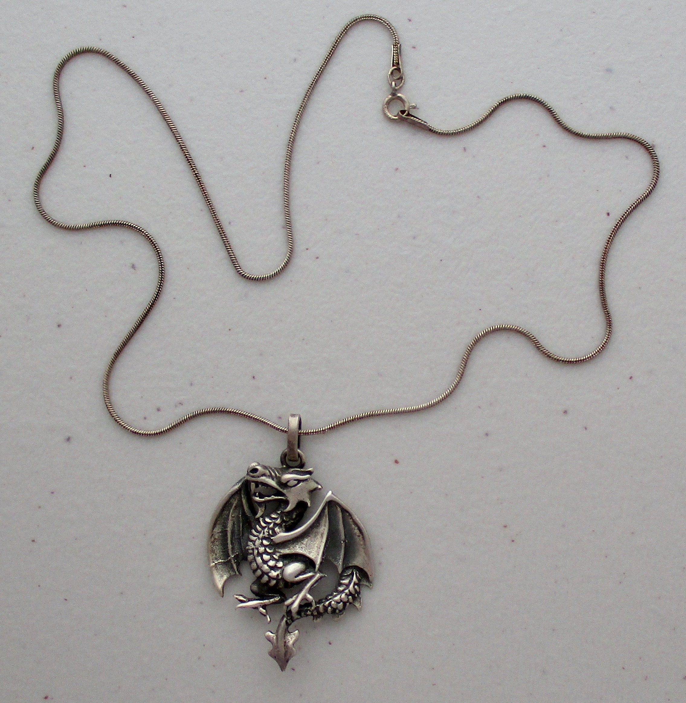 He is 1 1/2" tall and 1 1/4" wide. On the back, he is stamped '950' which means he is 95% sterling silver (regular sterling is '925' or 92.5%). The pendant and the 16" serpentine sterling silver chain together weigh over 10 grams.